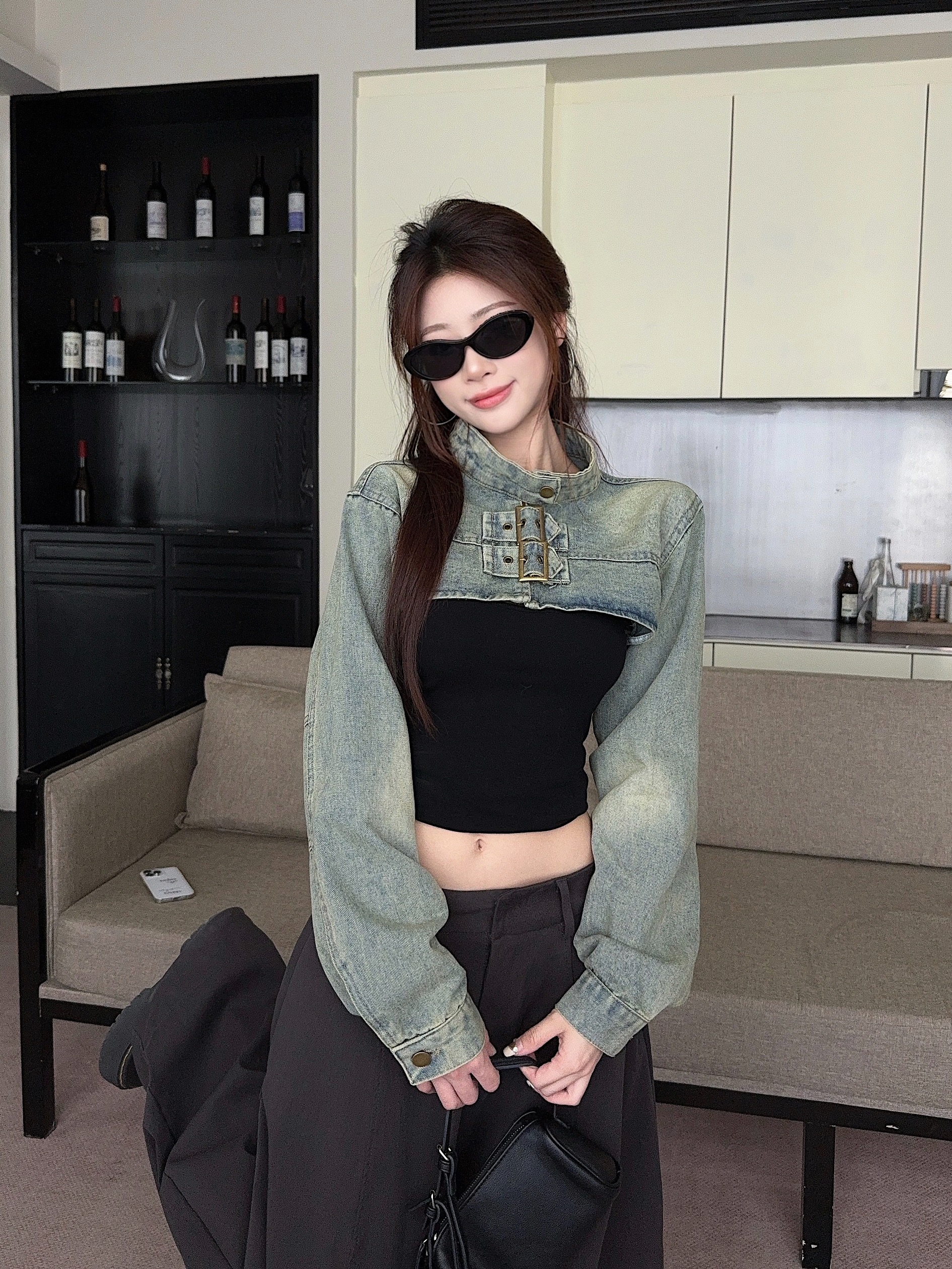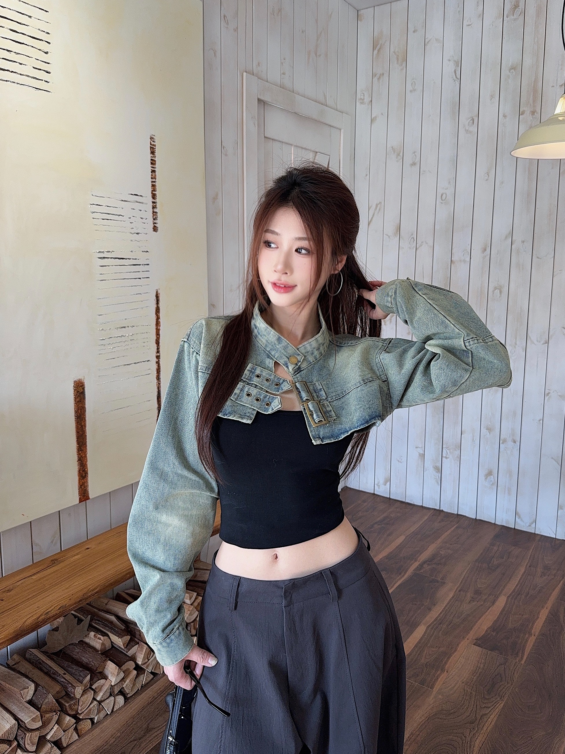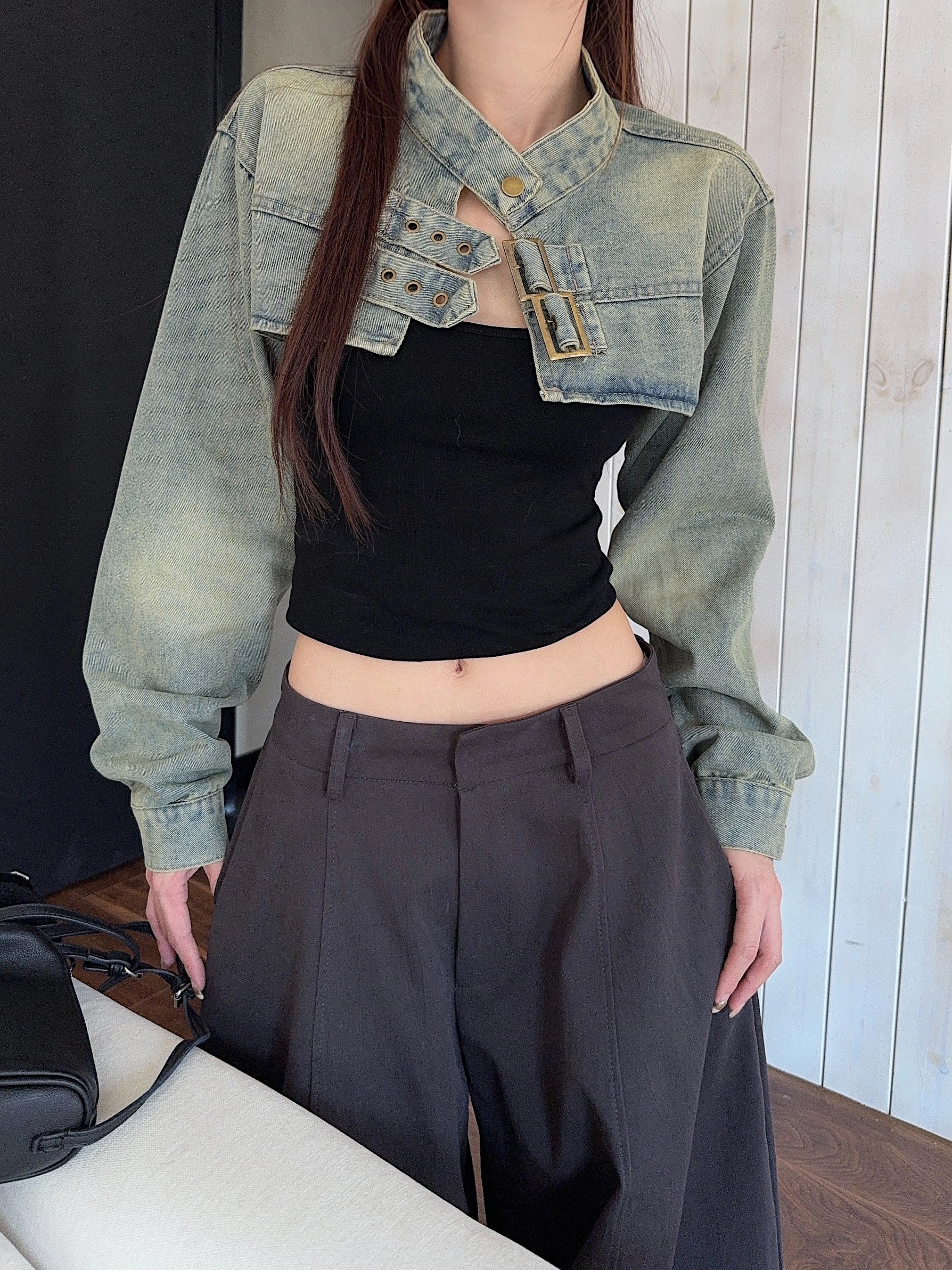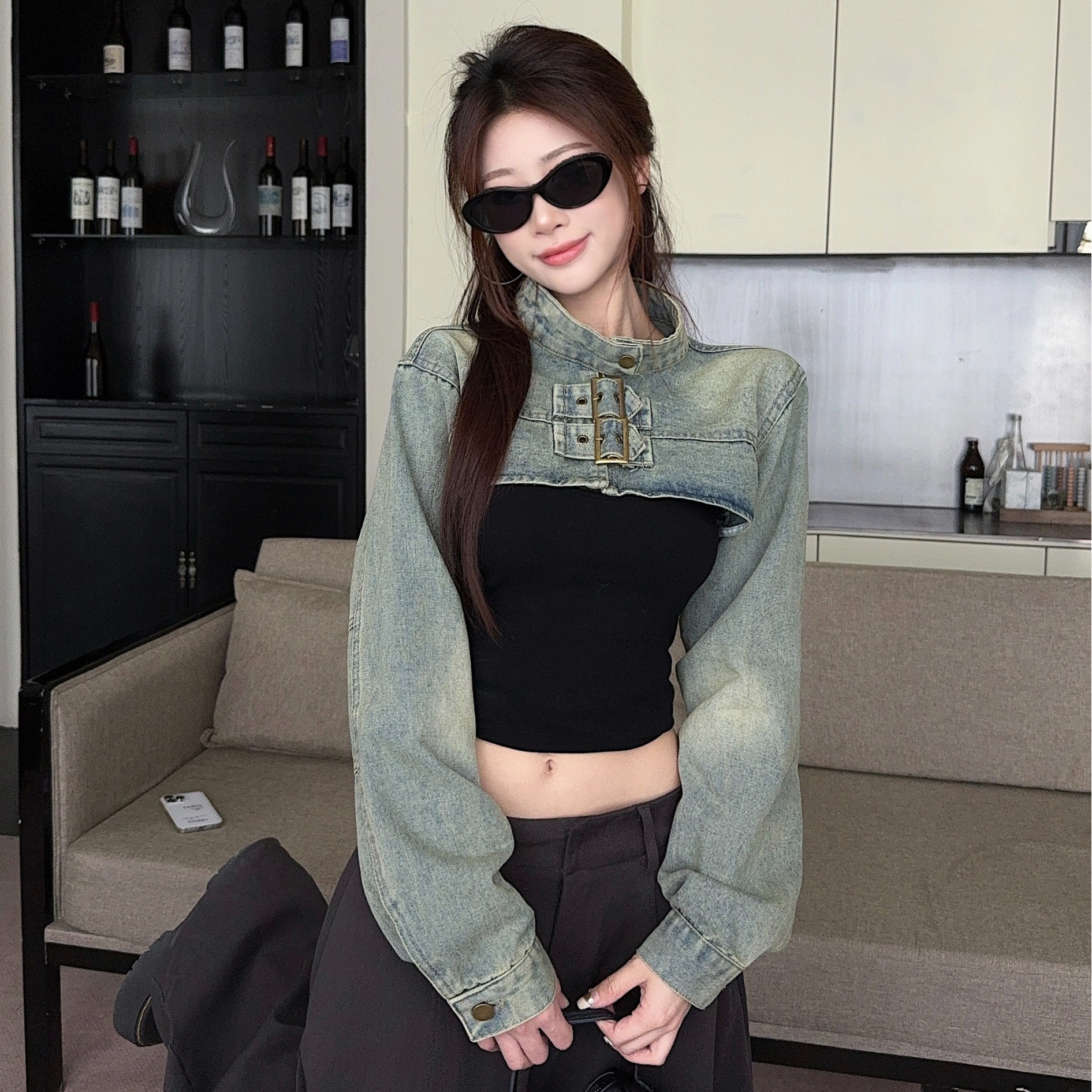 실사 정가 봄 가을 Chic 나팔 긴팔 V넥 데님 여성 셔츠 디자인 센스 작은 대중 허리 수축 아름다운 맨위