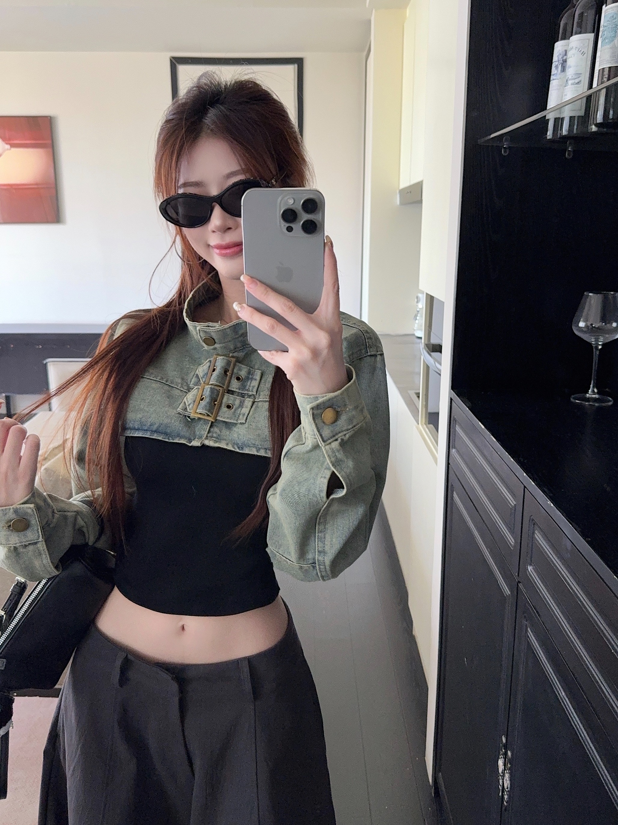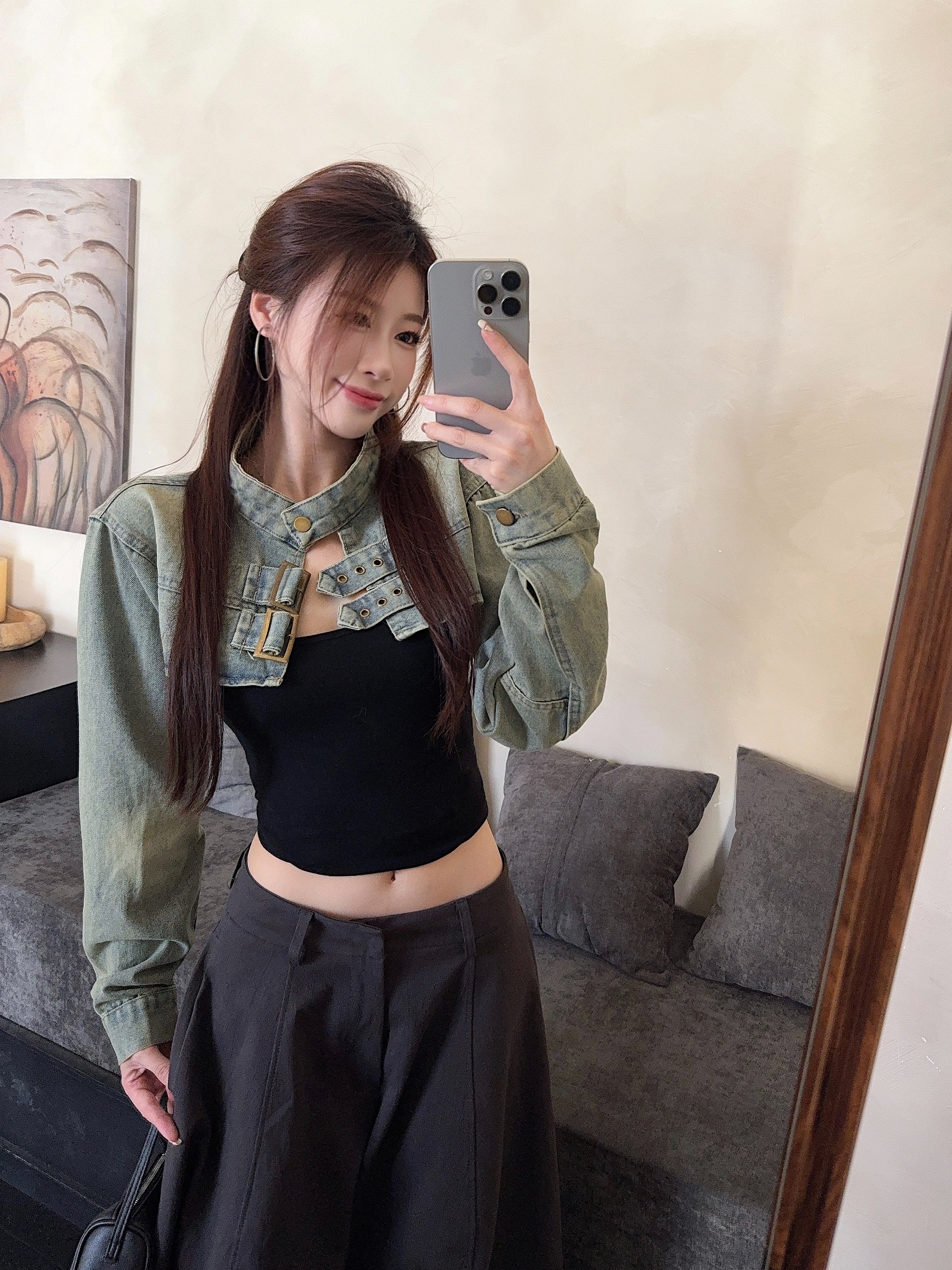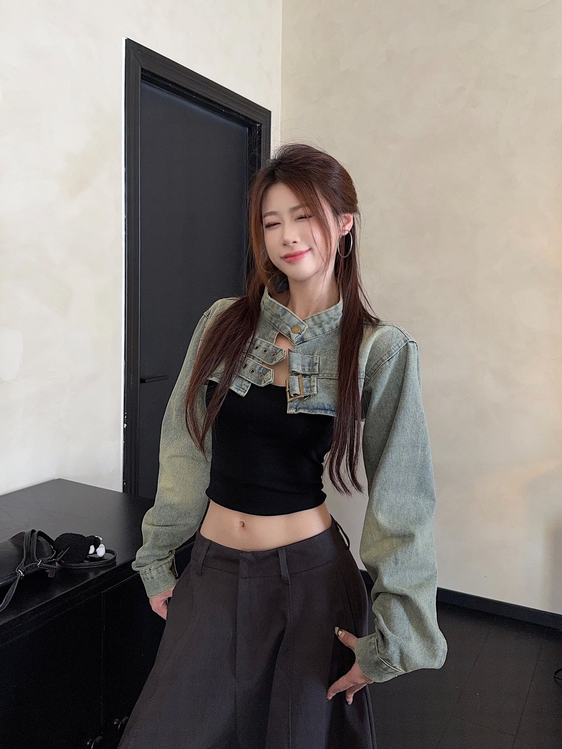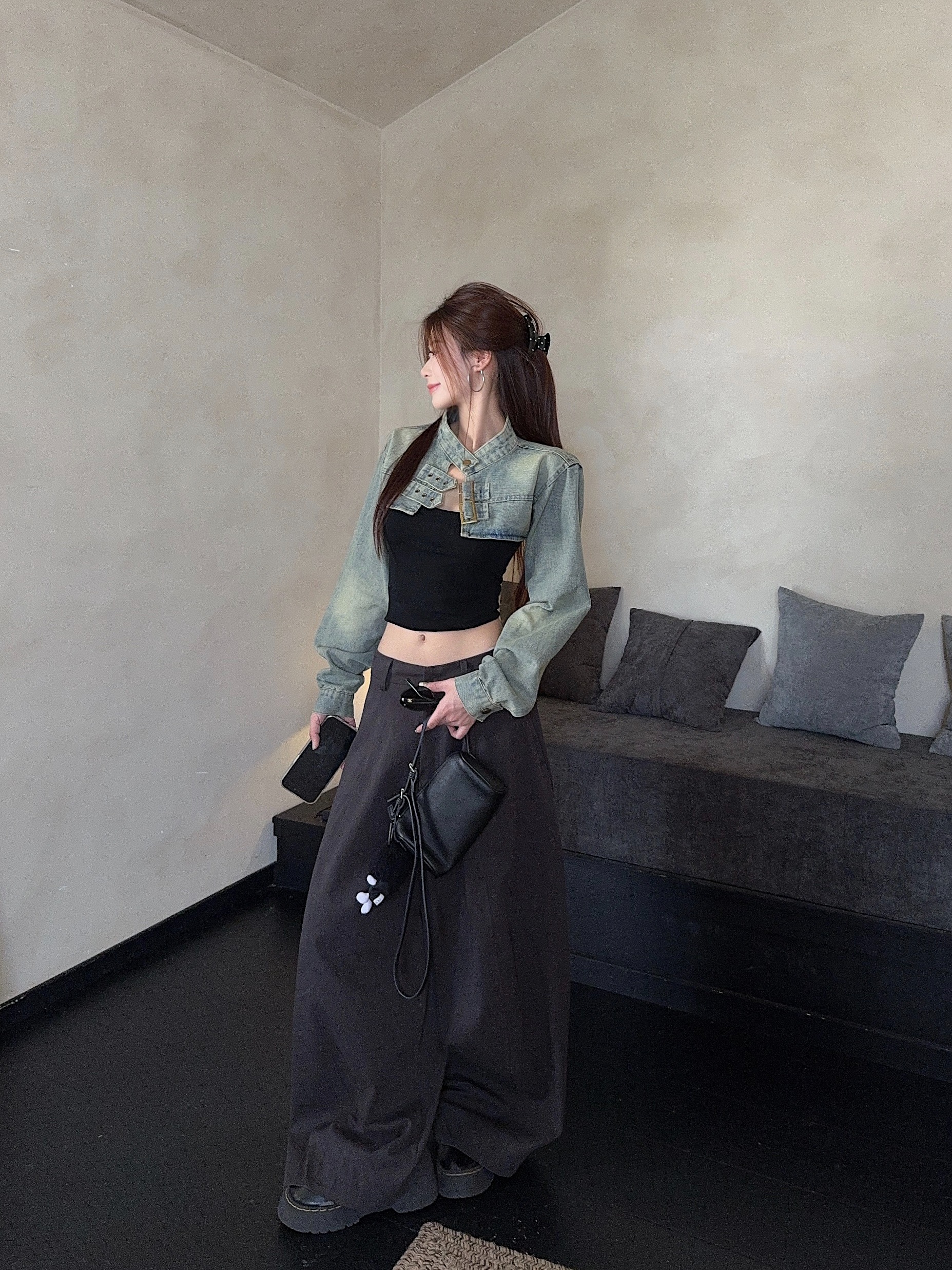실사 정가 봄 가을 Chic 나팔 긴팔 V넥 데님 여성 셔츠 디자인 센스 작은 대중 허리 수축 아름다운 맨위