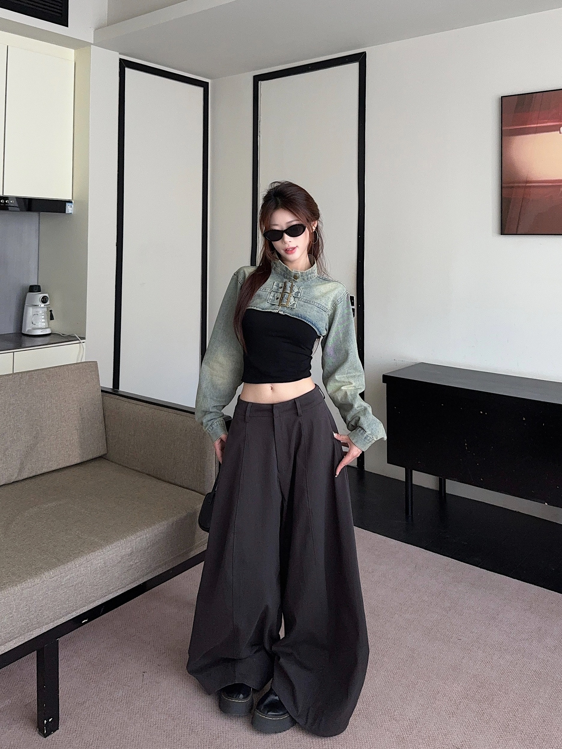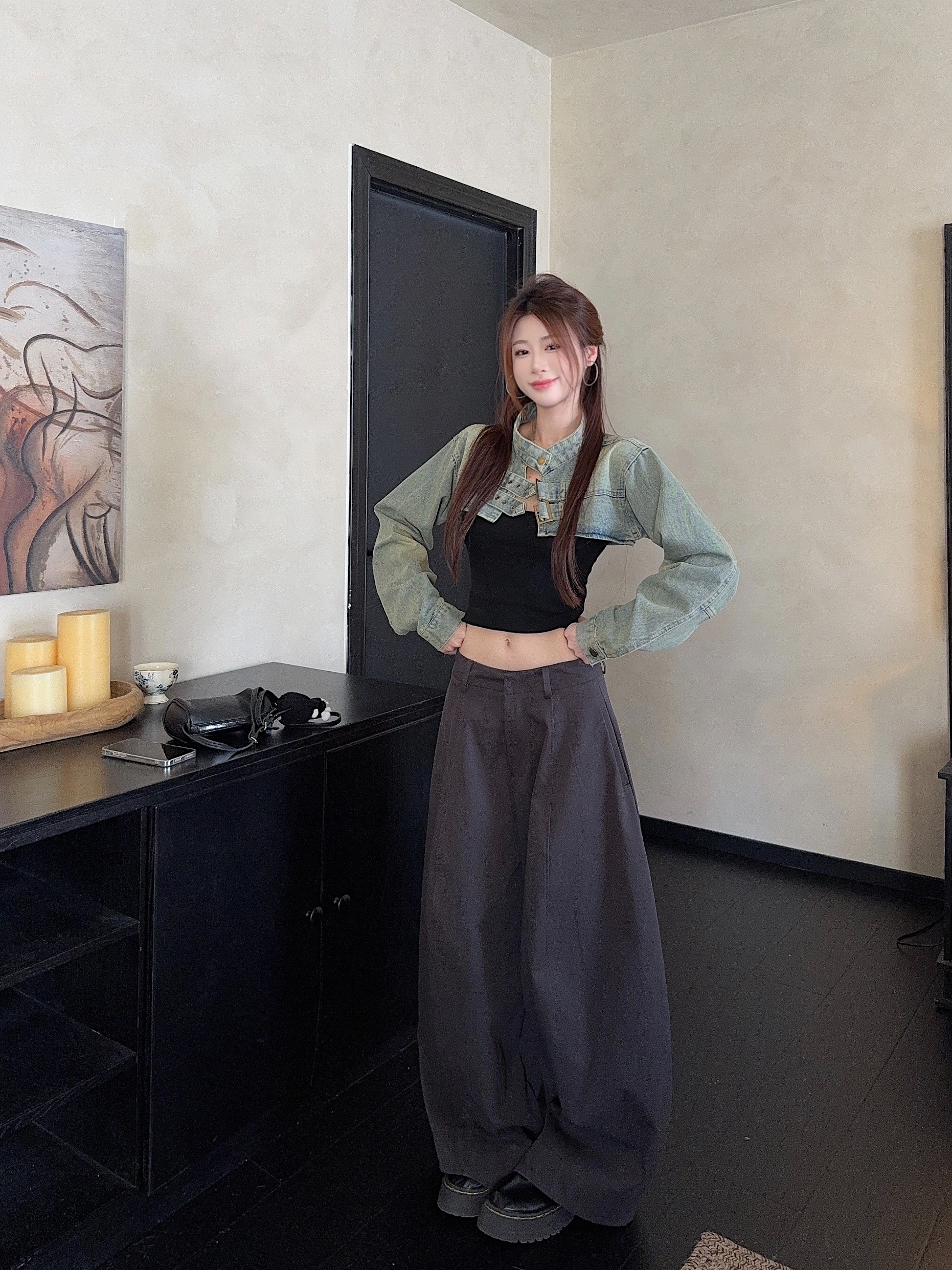 실사 정가 아메리칸 페이크 레이어드 마이크로 나팔 데님 스커트 바지 봄 가을 하이웨이스트 몸매 가꾸기 슬림해 보이는 바닥 청소 긴 바지
