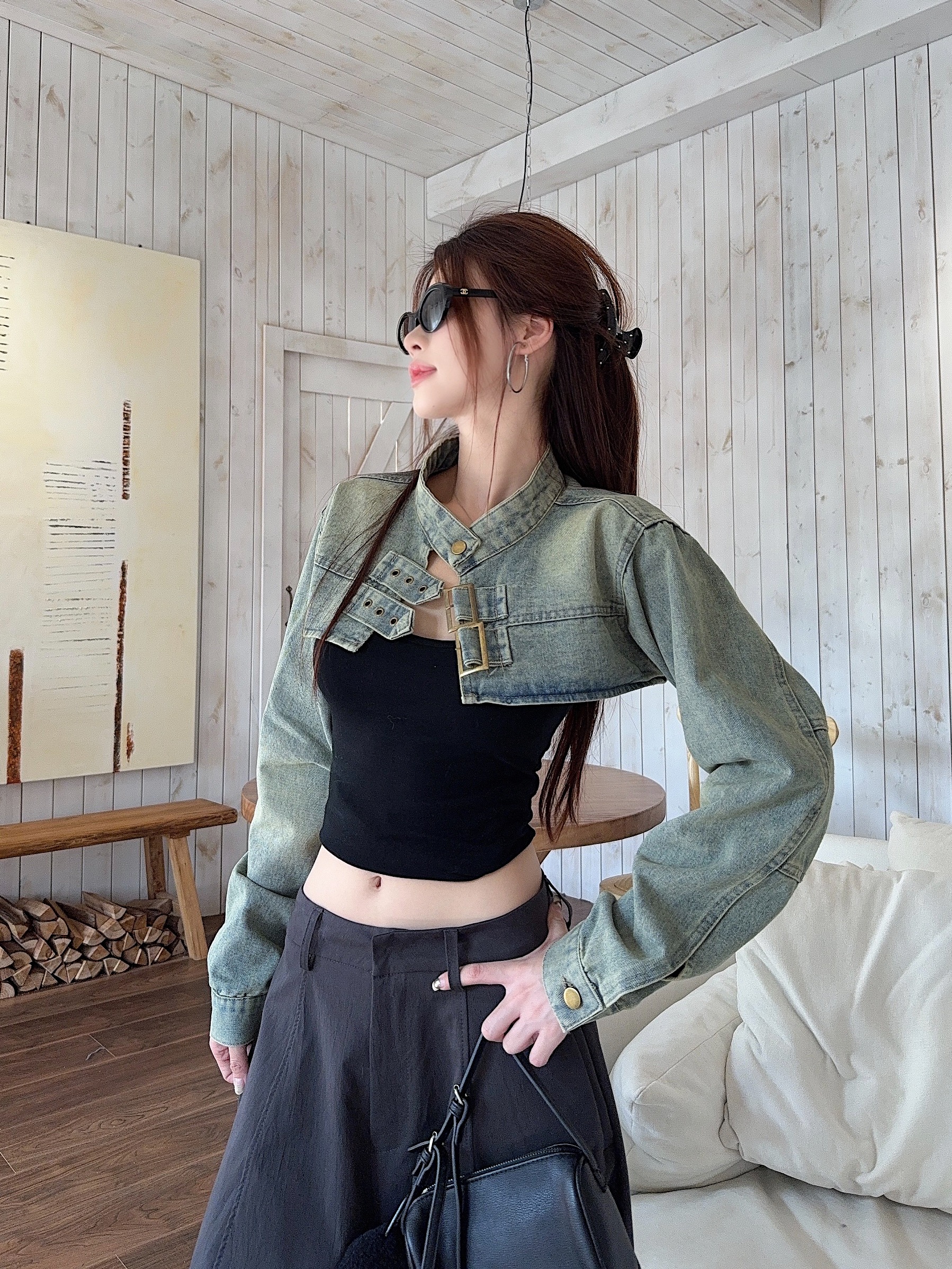 실사 정가 작은 대중 레트로 숄 소매 디자인 데님 여성 코트 한 부서 패션 캐주얼 짧은 재킷 맨위