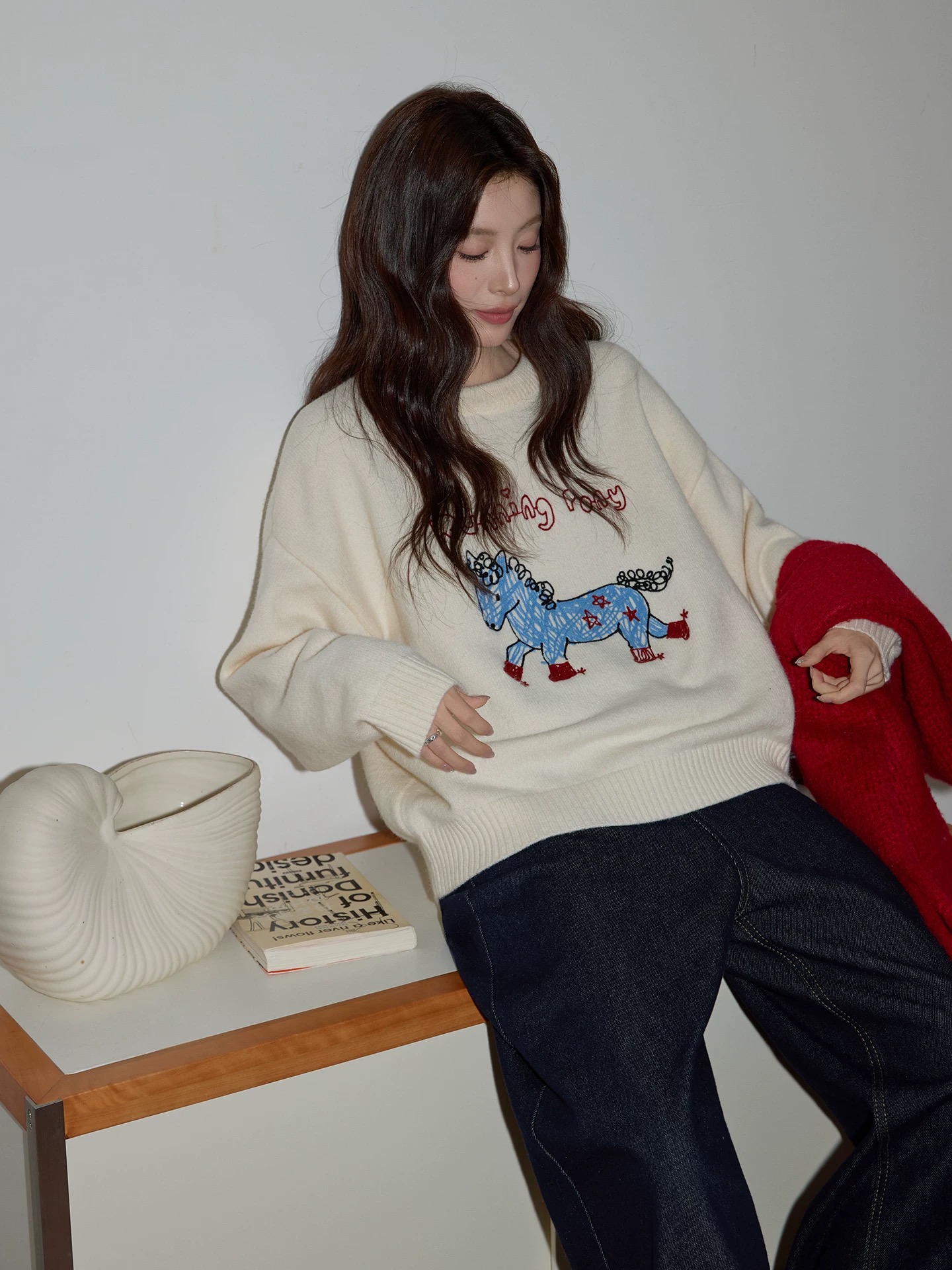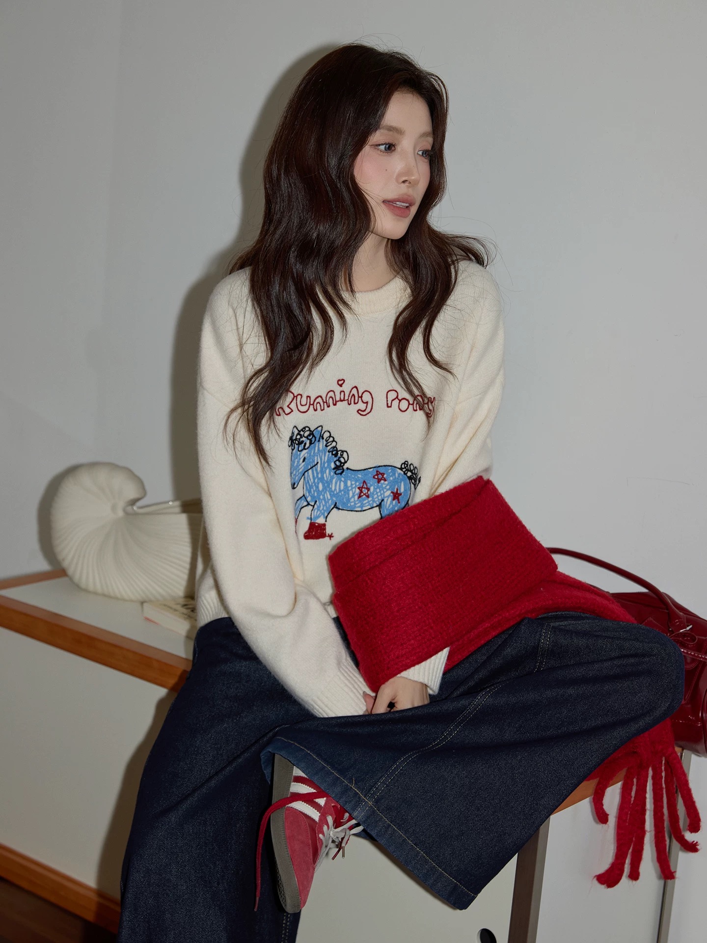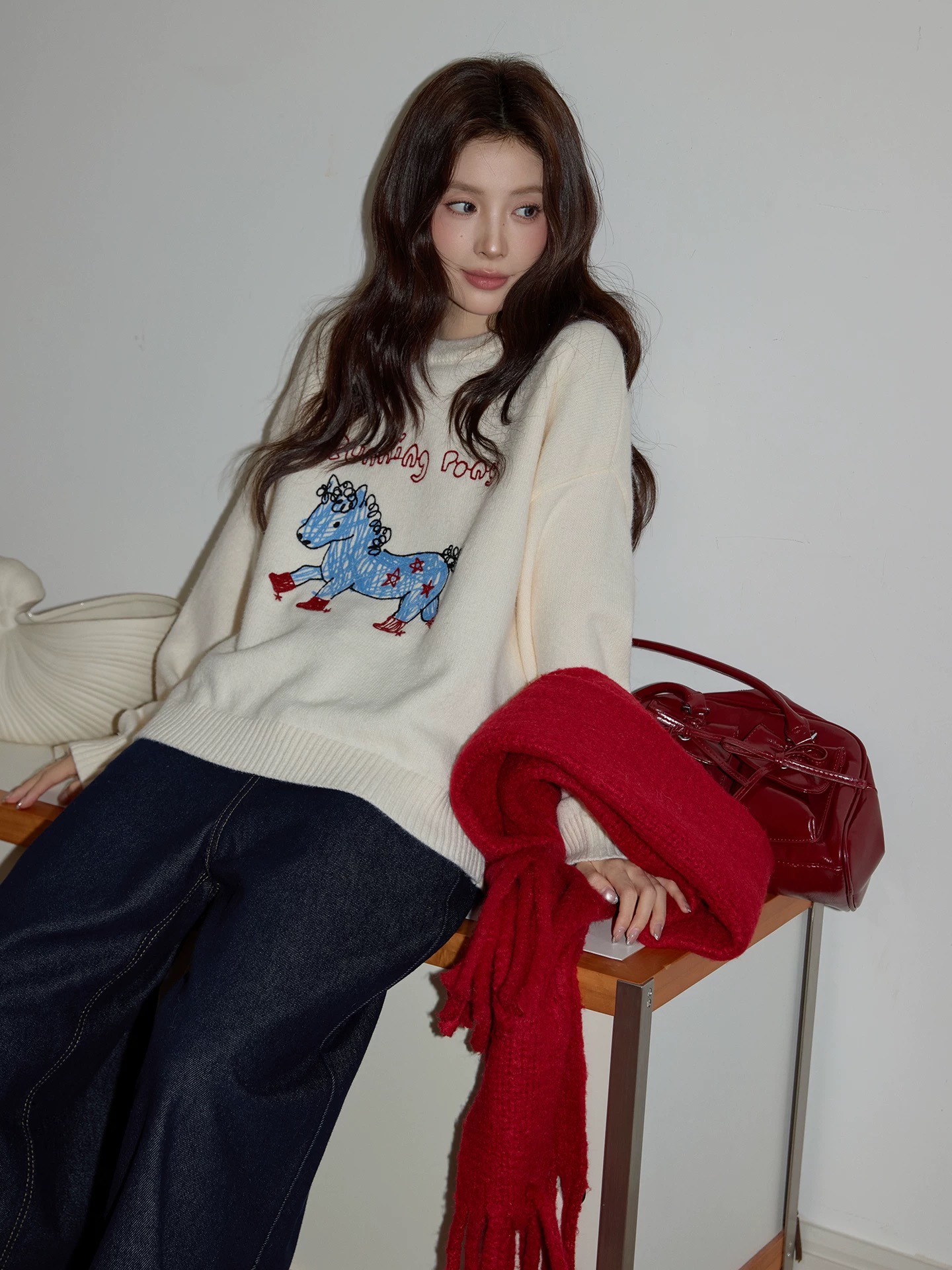 시끄러운 홈 얕은 살구 색상 두꺼운 자수 작은 말 스웨터 여자 2025 겨울 고급 루즈핏 캐주얼 니트 털실 맨위