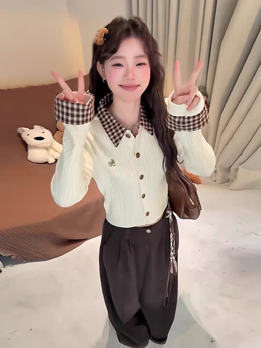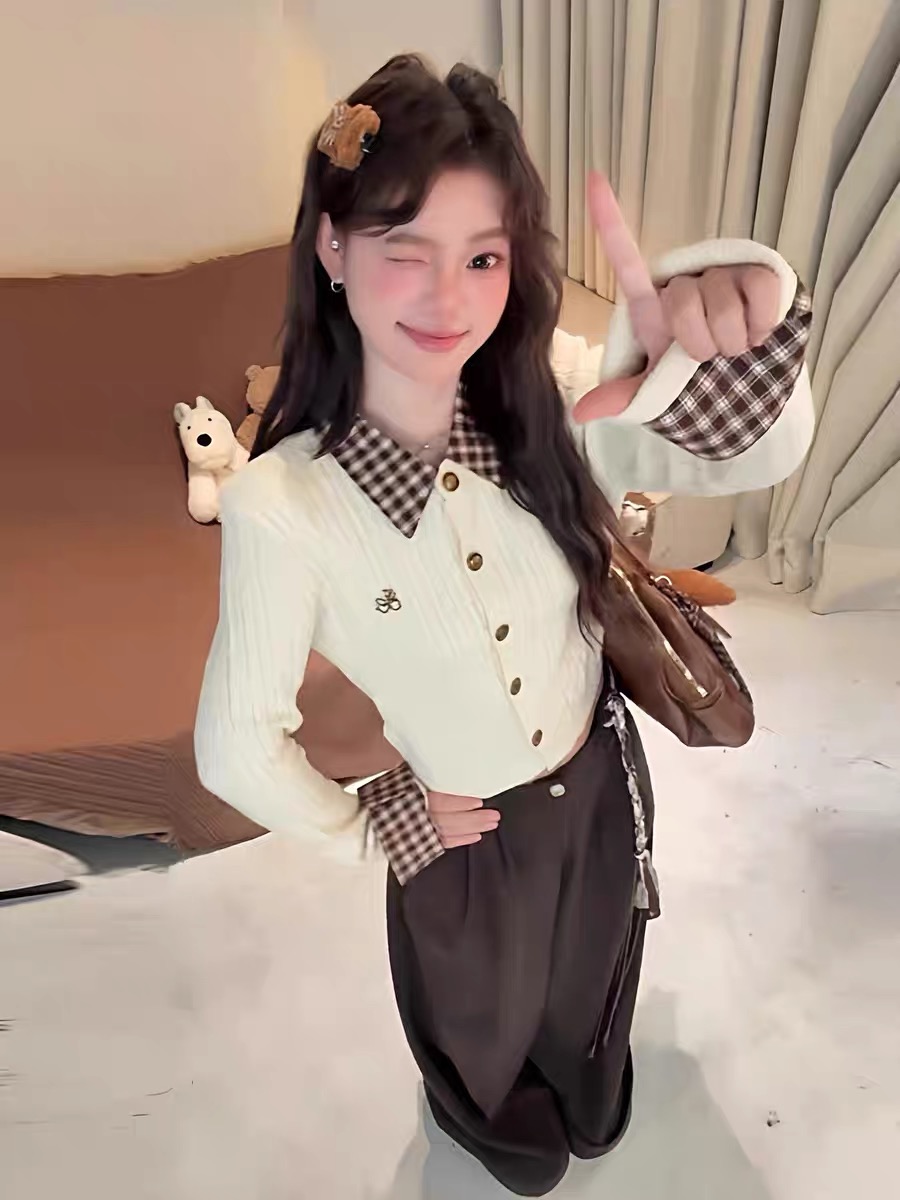 빛 럭셔리 바람 작은 샤넬 스타일 세트 여성 2026 새로운 패션 금속 단추 니트 스웨터 방귀 커튼 와이드 레그 팬츠 3종 세트