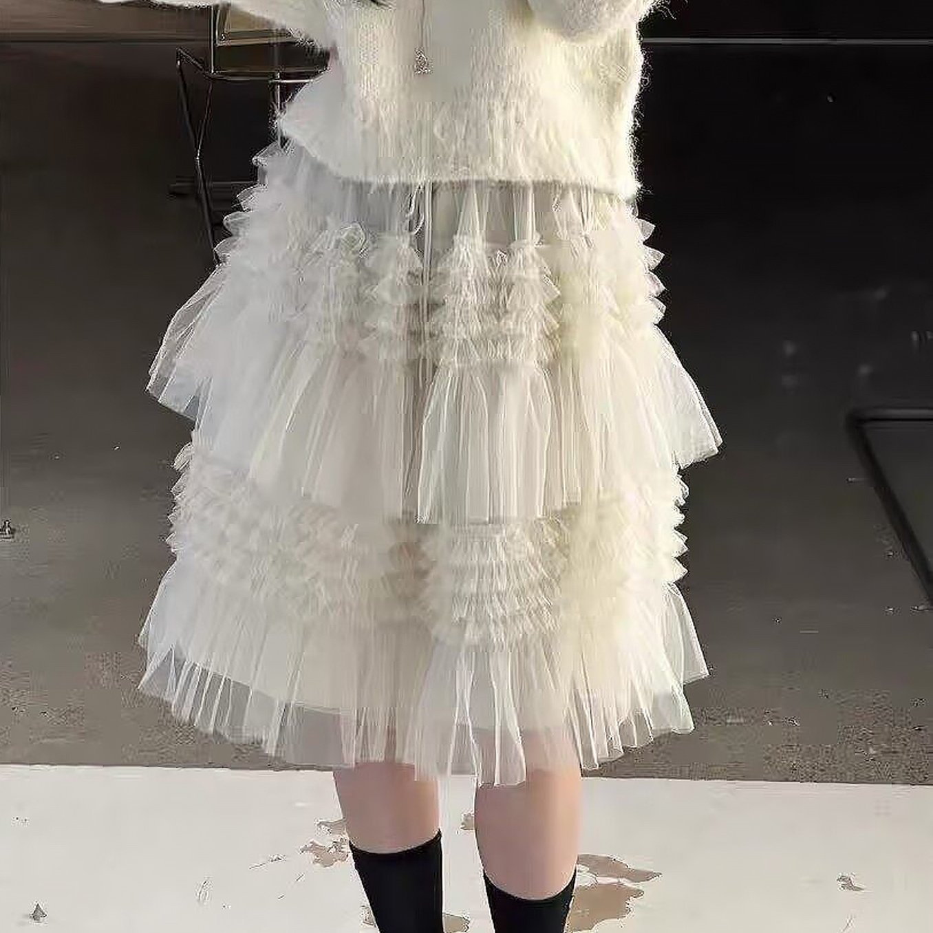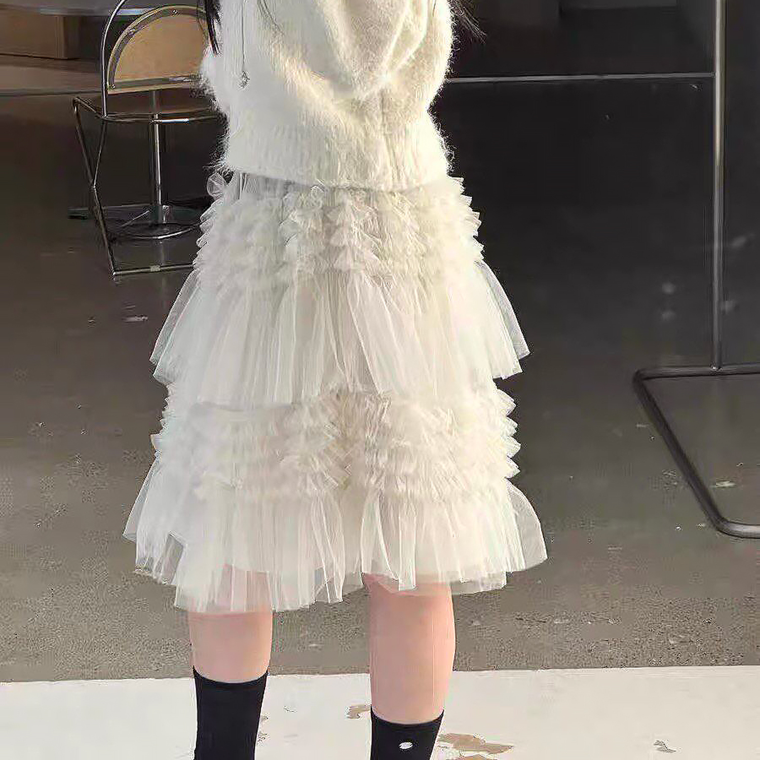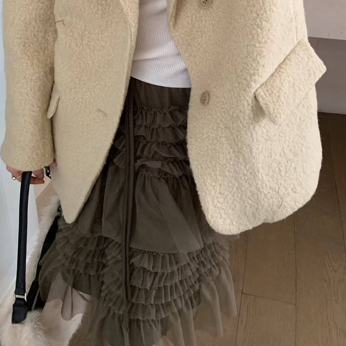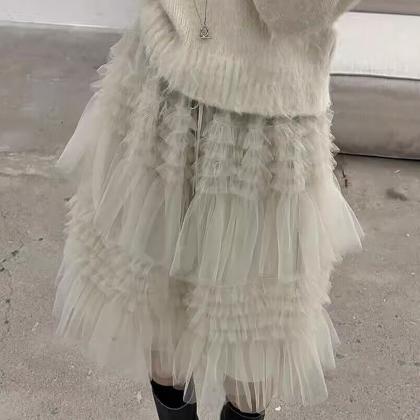 실사 겨울 켜기 새로운 두꺼운 부드러운 작은 꽃무늬 프릴 한 마디 디스플레이 다리 길이 2025 겨울 분위기 센스 반신 스커트