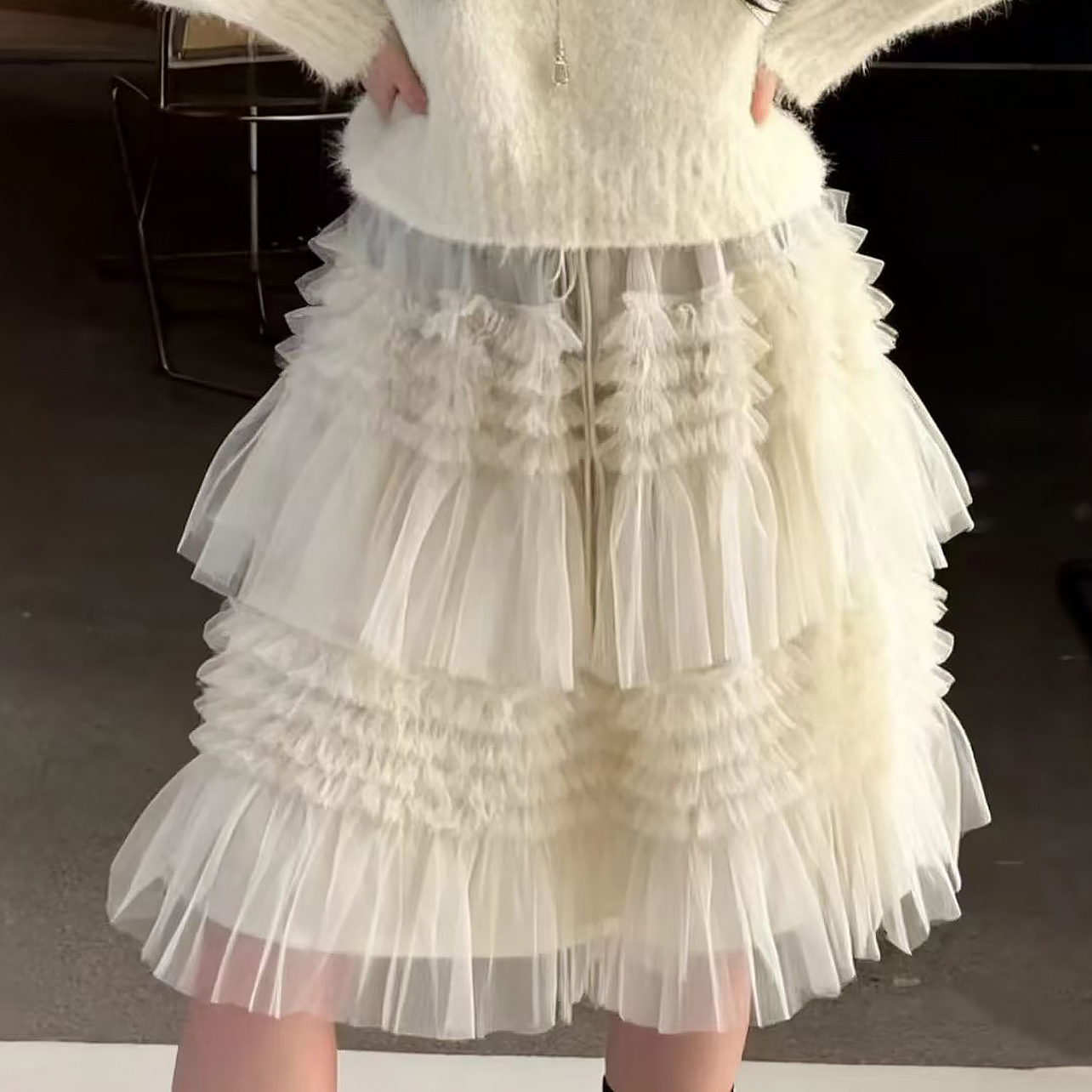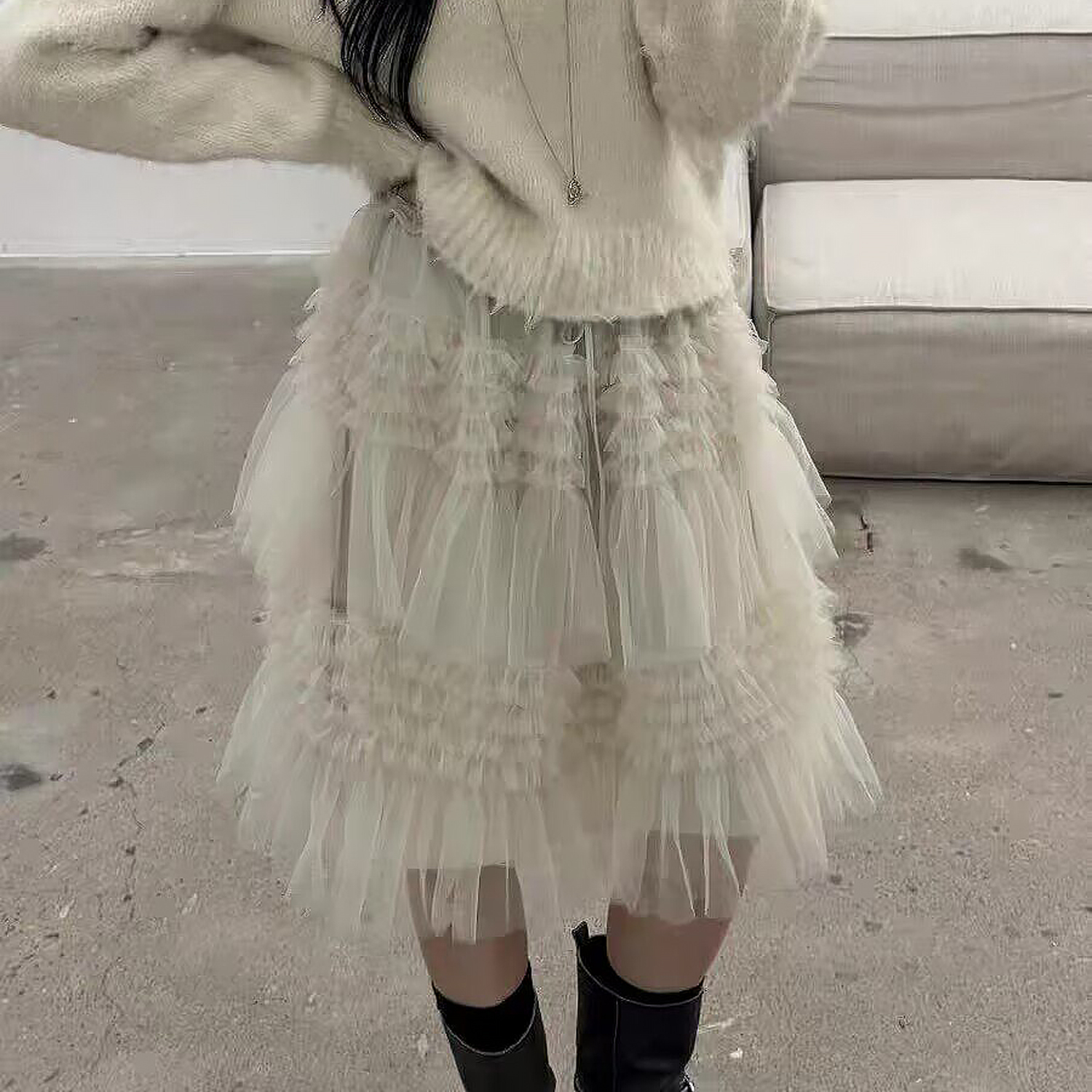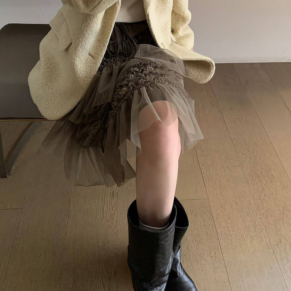 실사 살구 색상 반신 스커트 겨울 봄 쇼트 스타일 프랑스식 거즈 스커트 하이웨이스트 표지 넓적 다리 슬림해 보이는 A라인 스커트 꽃밭 퍼프 스커트