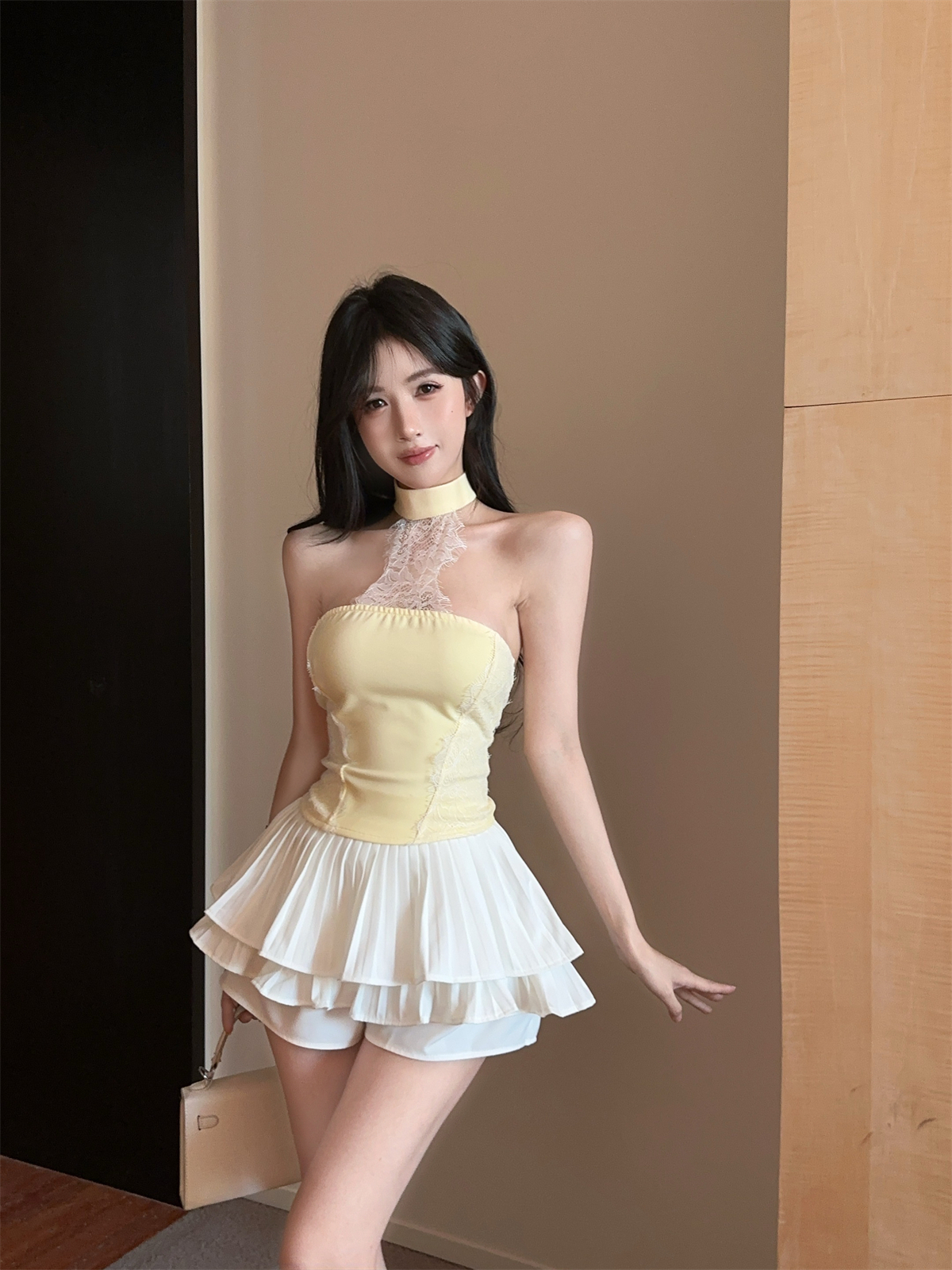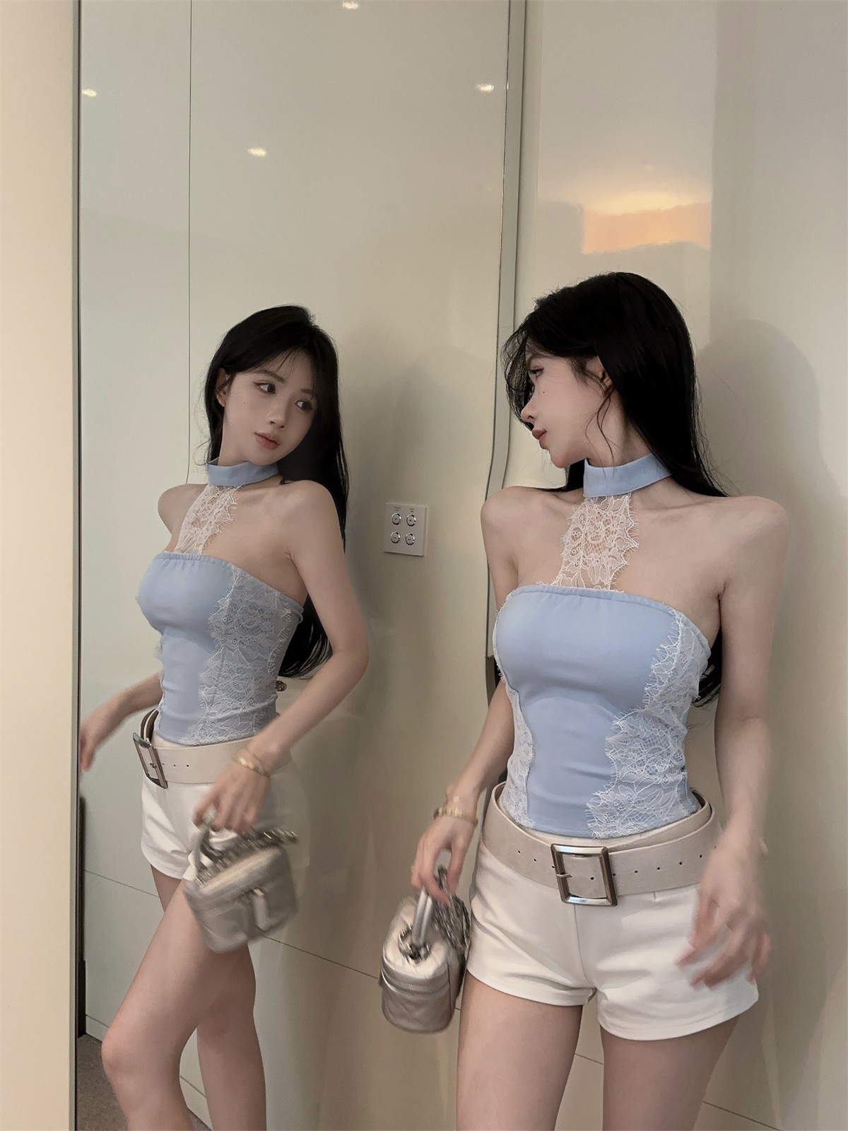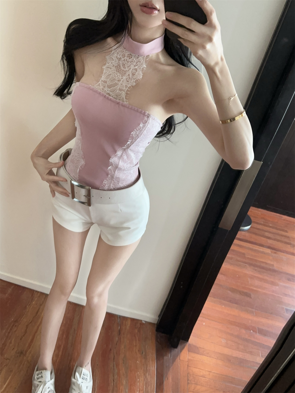 실사 정가 행침 목 속눈썹 레이스 조각 순수한 욕망 튜브탑 맨위 벨트 반바지 여성 봄 패션 세트