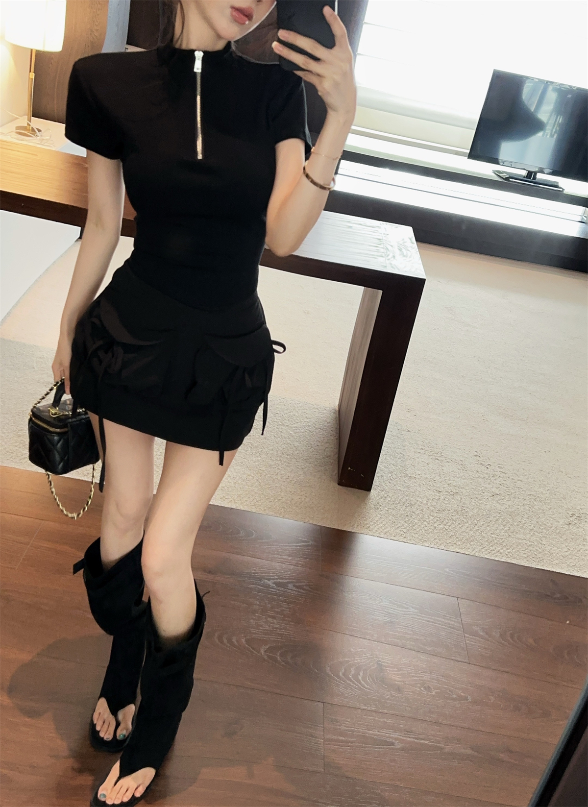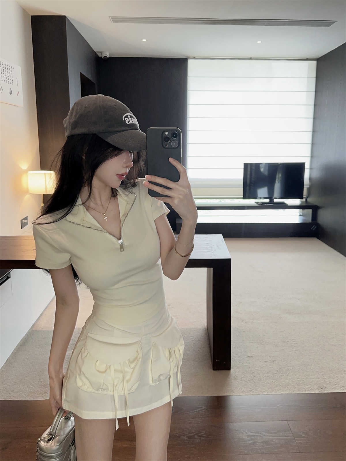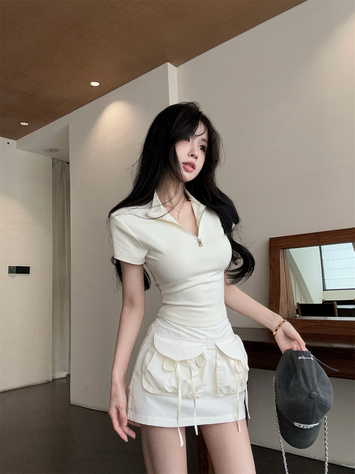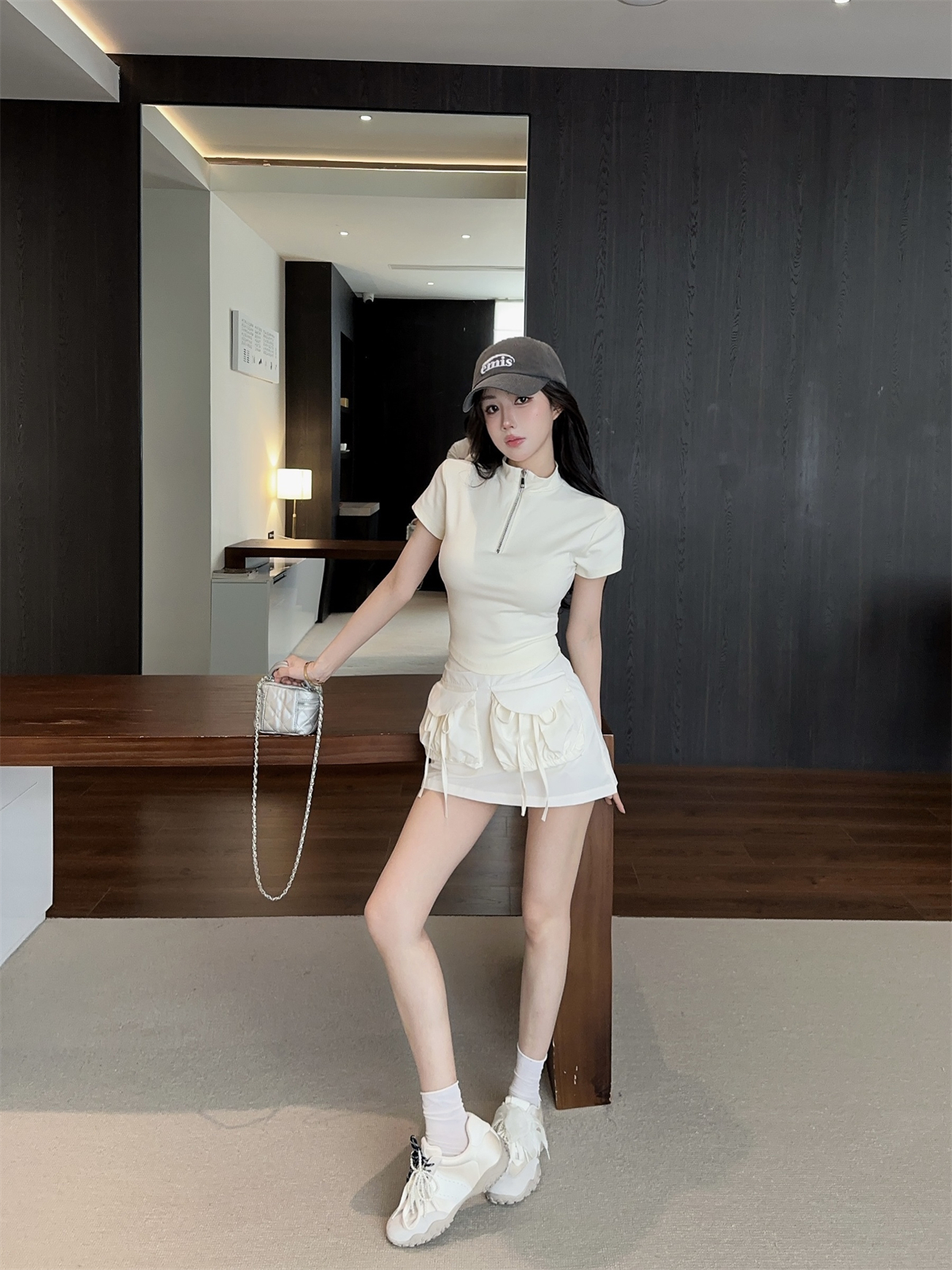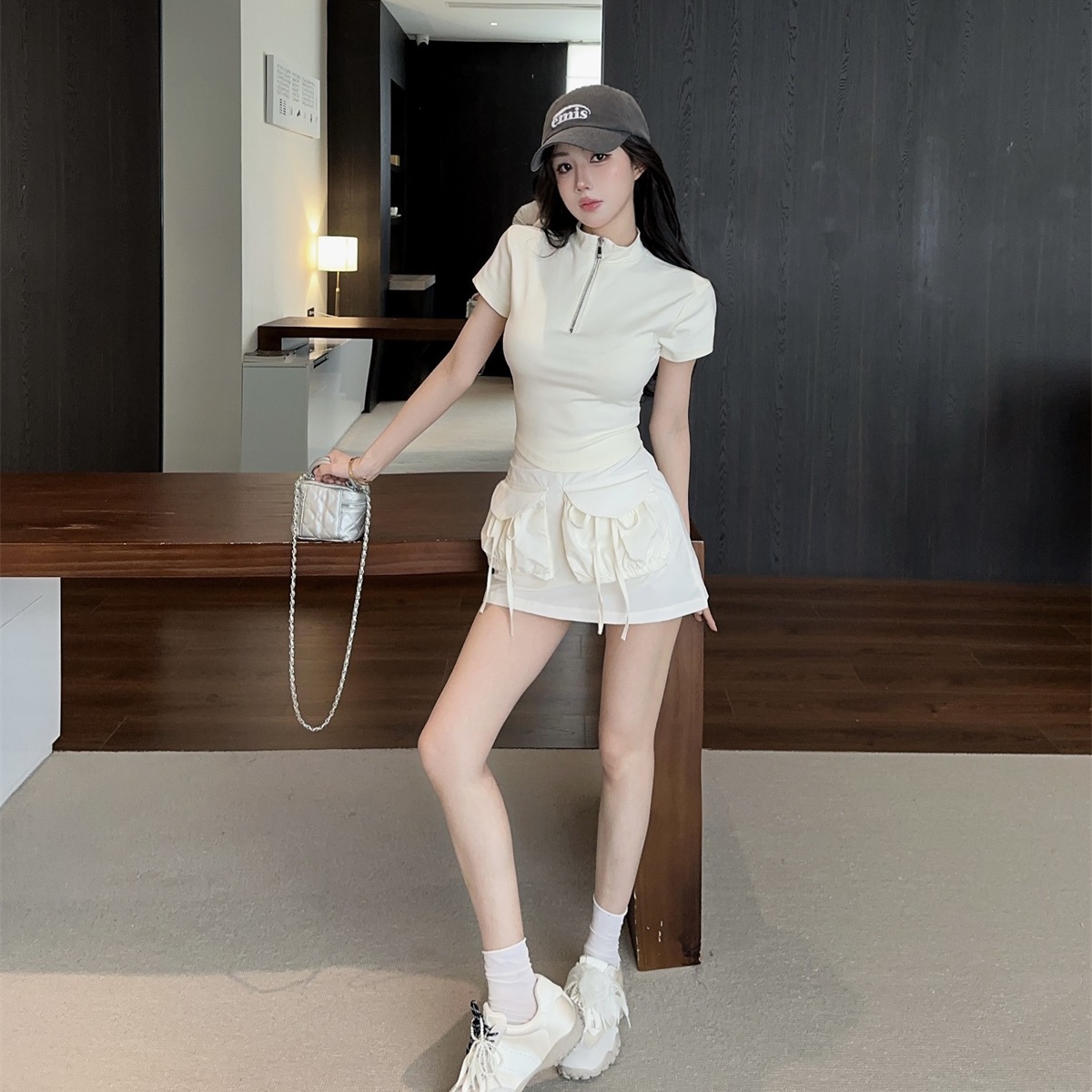 실사 정가 달콤한 차가운 지퍼 슬림해 보이는 허리 수축 반팔 니트 t 운동 맨위 주머니 패션 미니 스커트 여성복