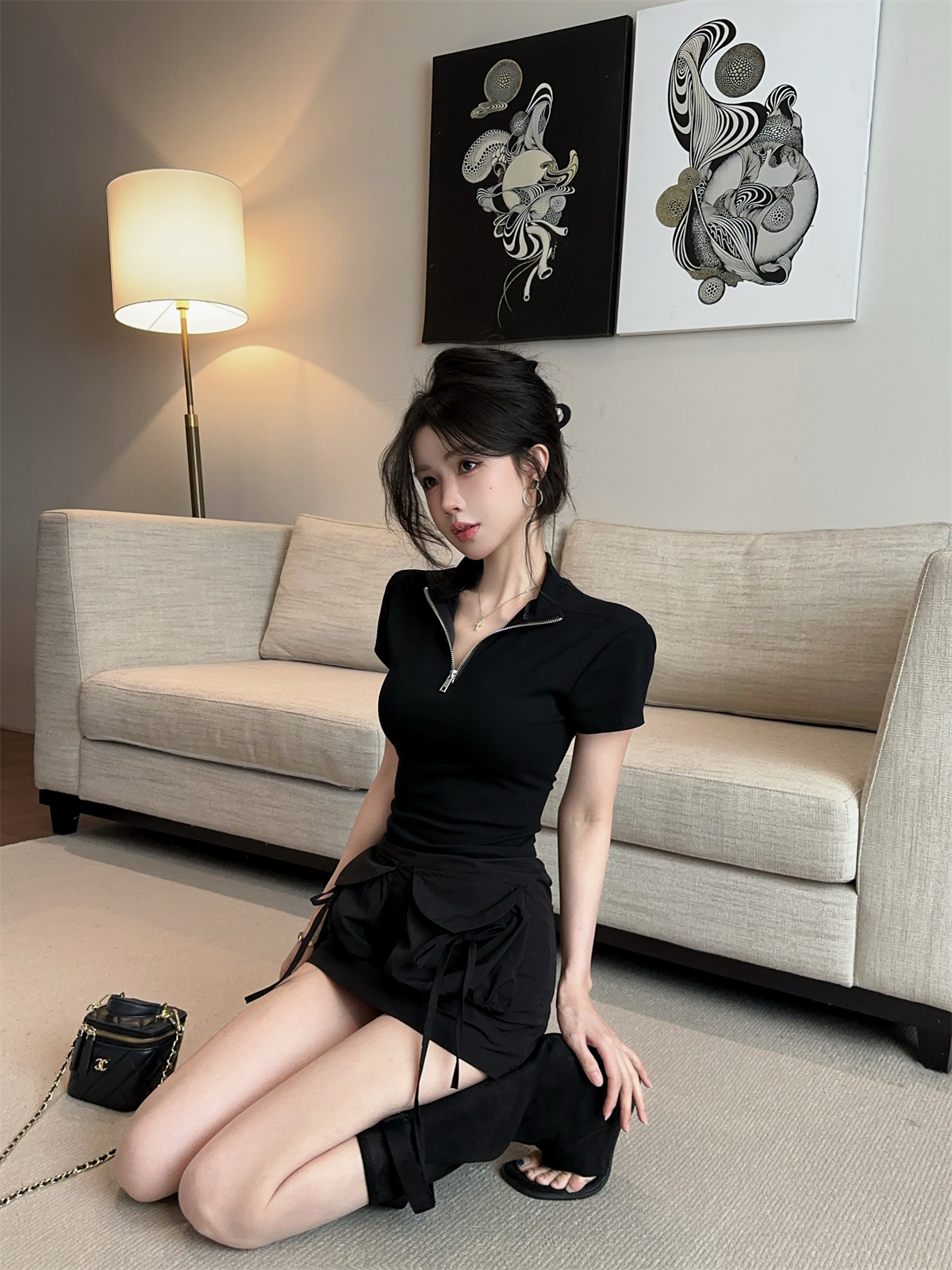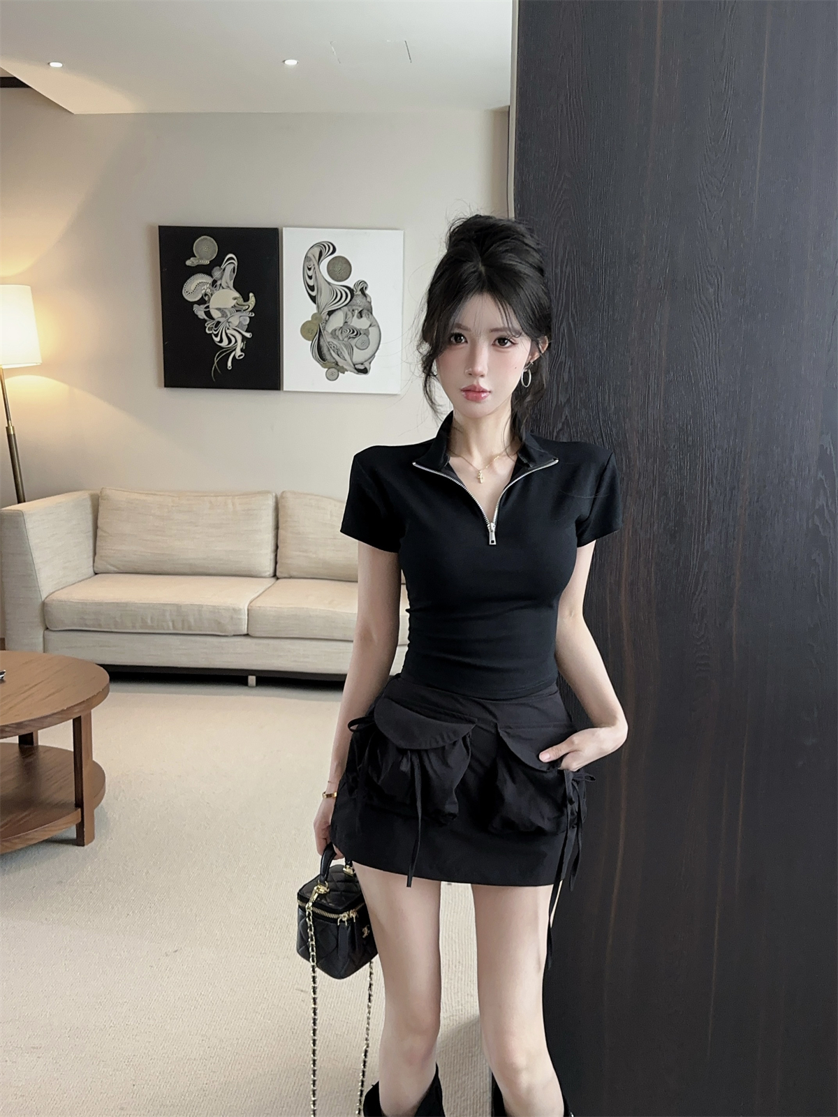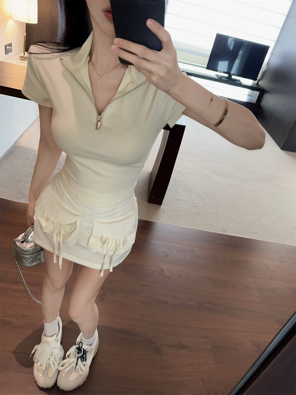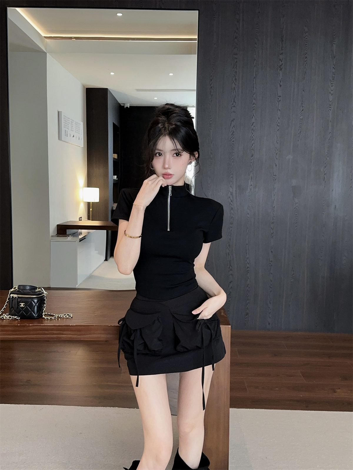 실사 정가 달콤한 차가운 지퍼 슬림해 보이는 허리 수축 반팔 니트 t 운동 맨위 주머니 패션 미니 스커트 여성복