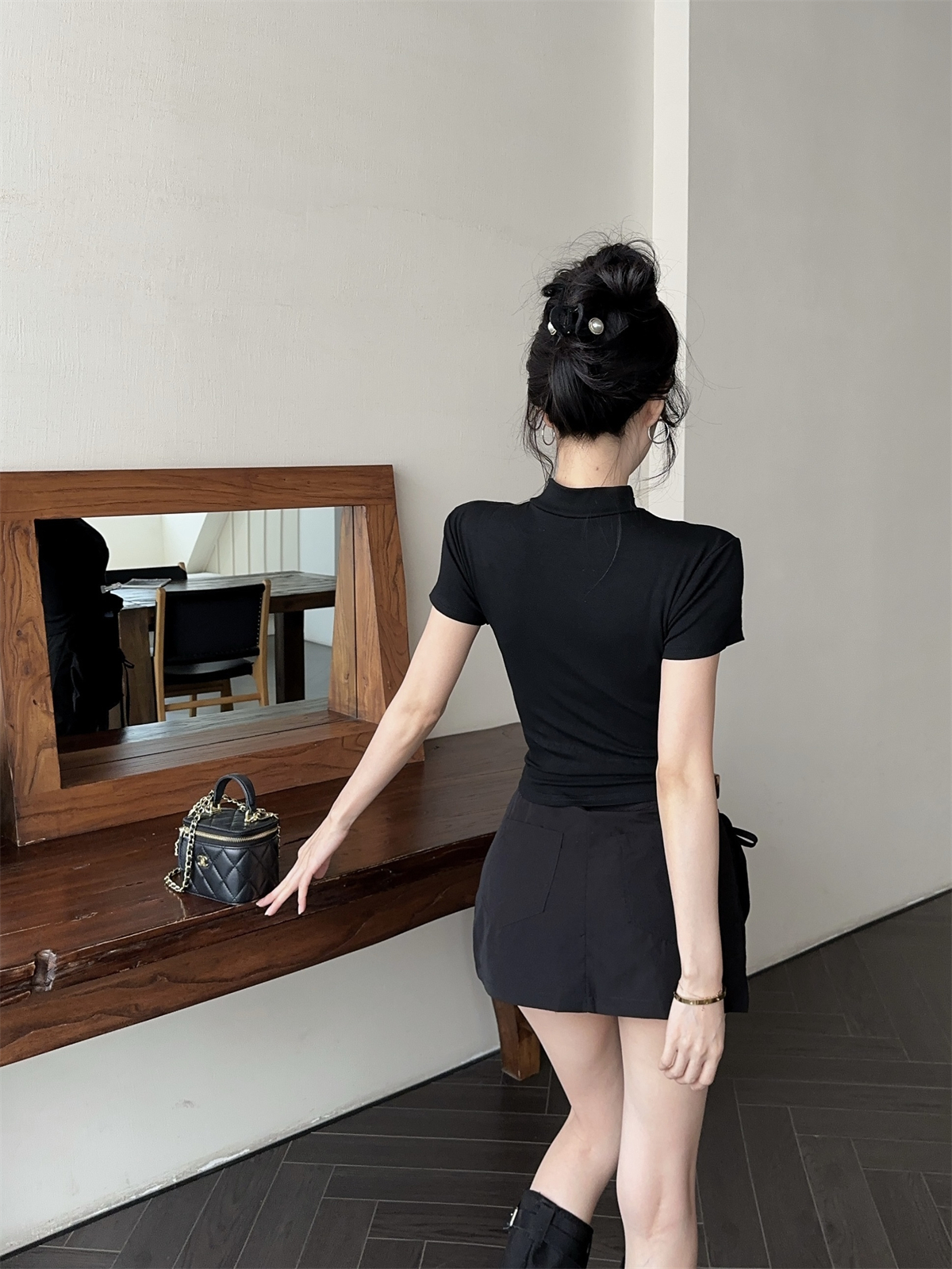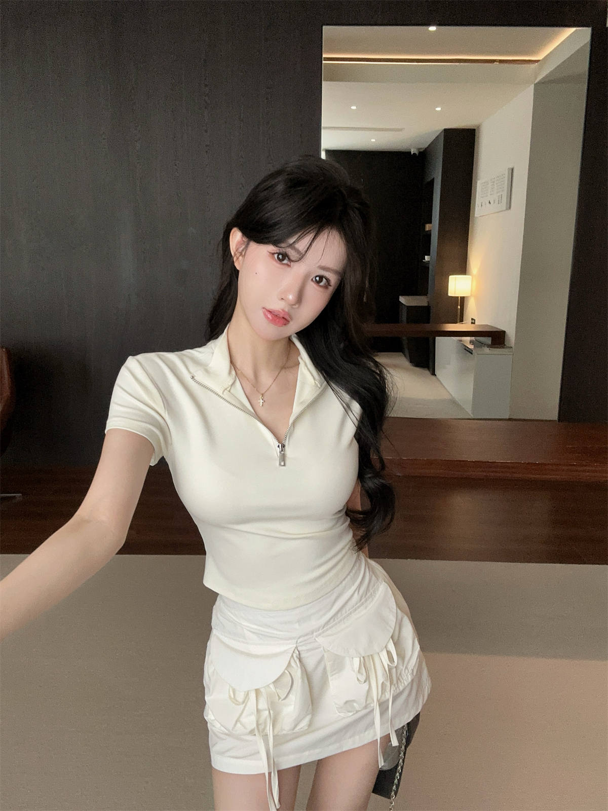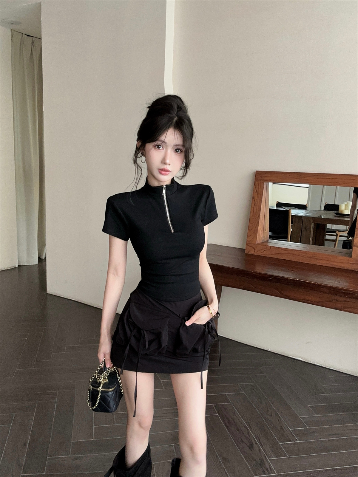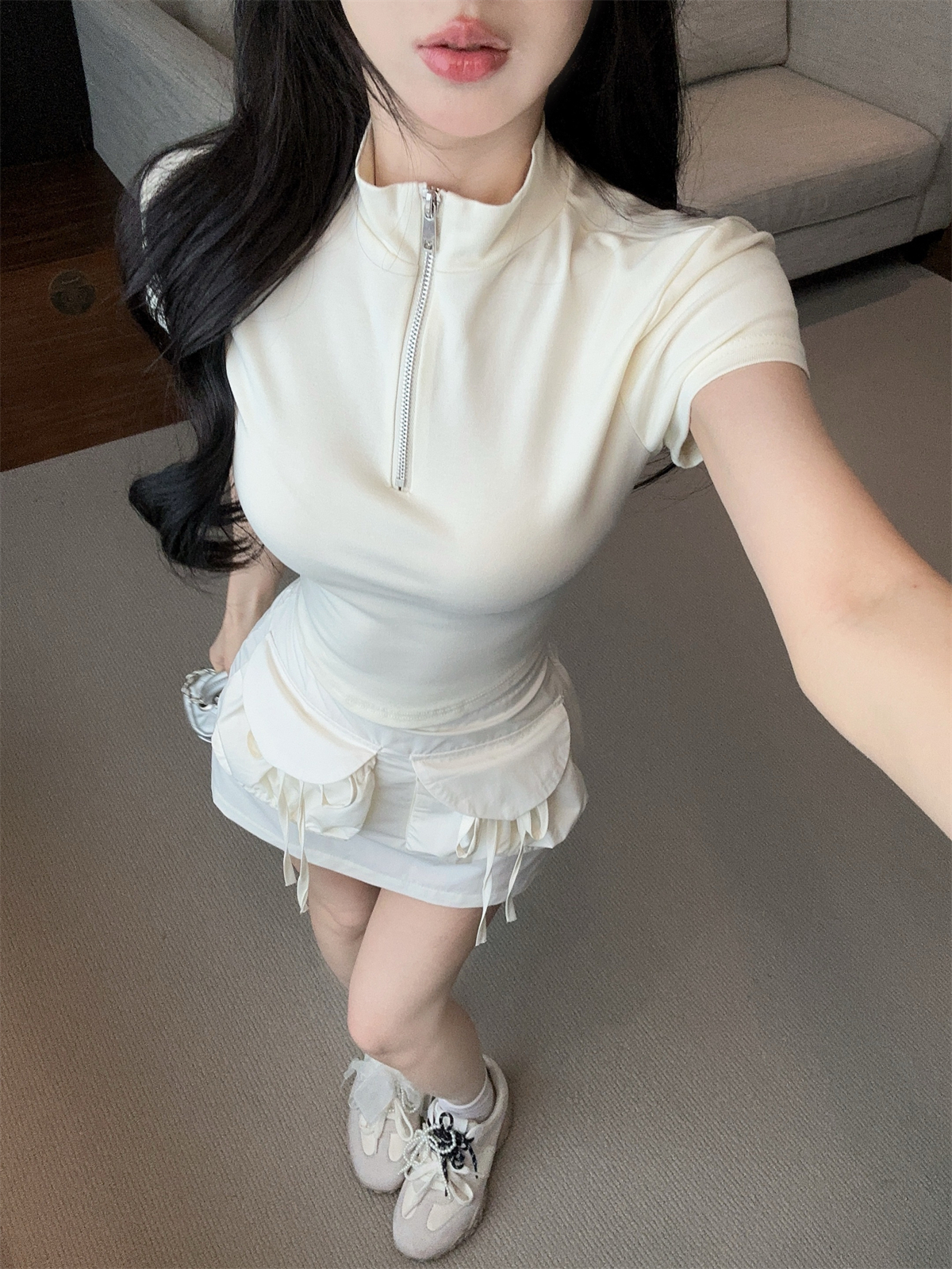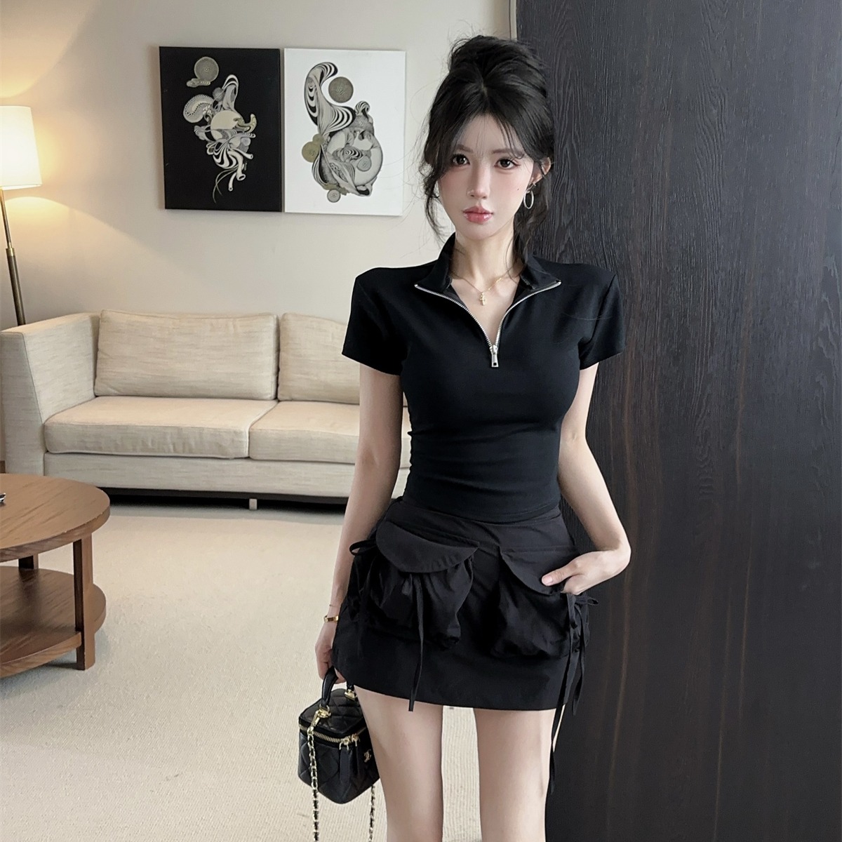 실사 정가 달콤한 차가운 지퍼 슬림해 보이는 허리 수축 반팔 니트 t 운동 맨위 주머니 패션 미니 스커트 여성복