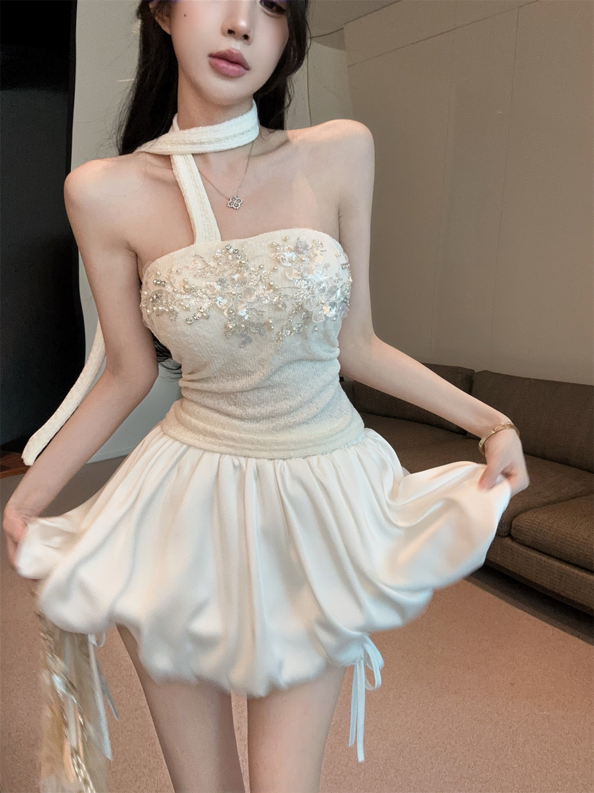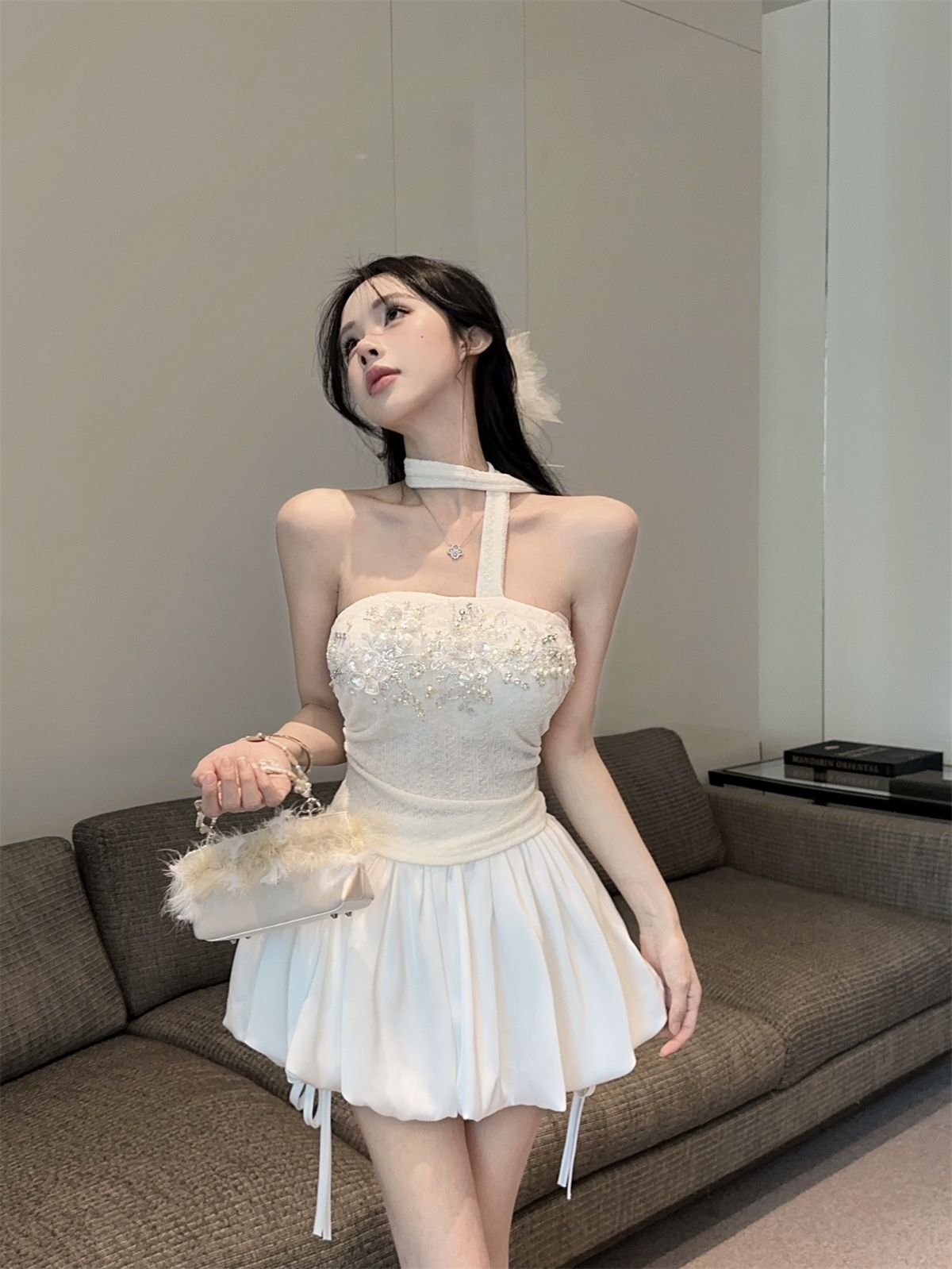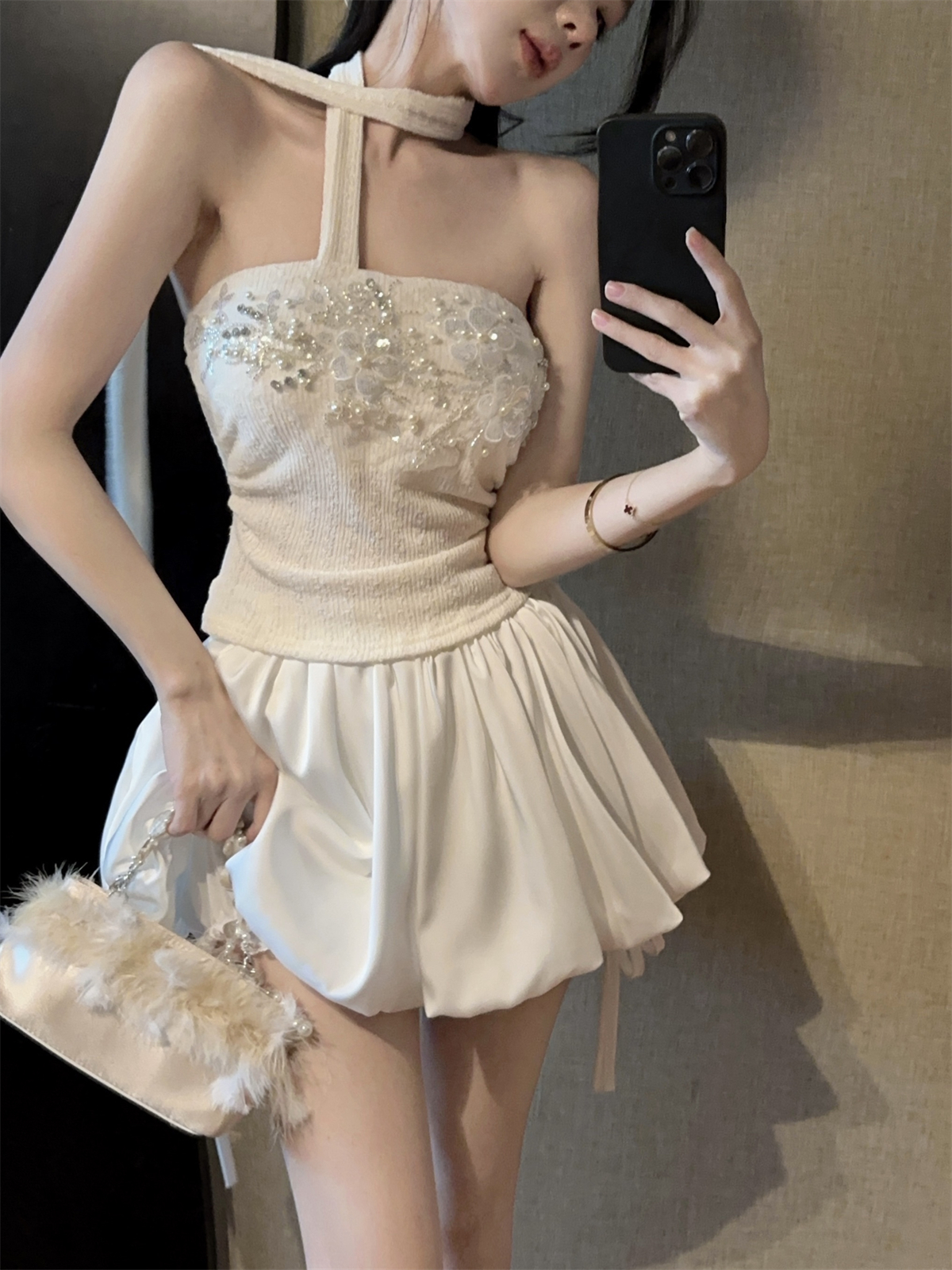 실사 정가 부드러운 모피 철자 레이스 레이스 스트랩 순수한 욕망 튜브탑 빛 럭셔리 자수 미니 스커트 여성 봄 세트