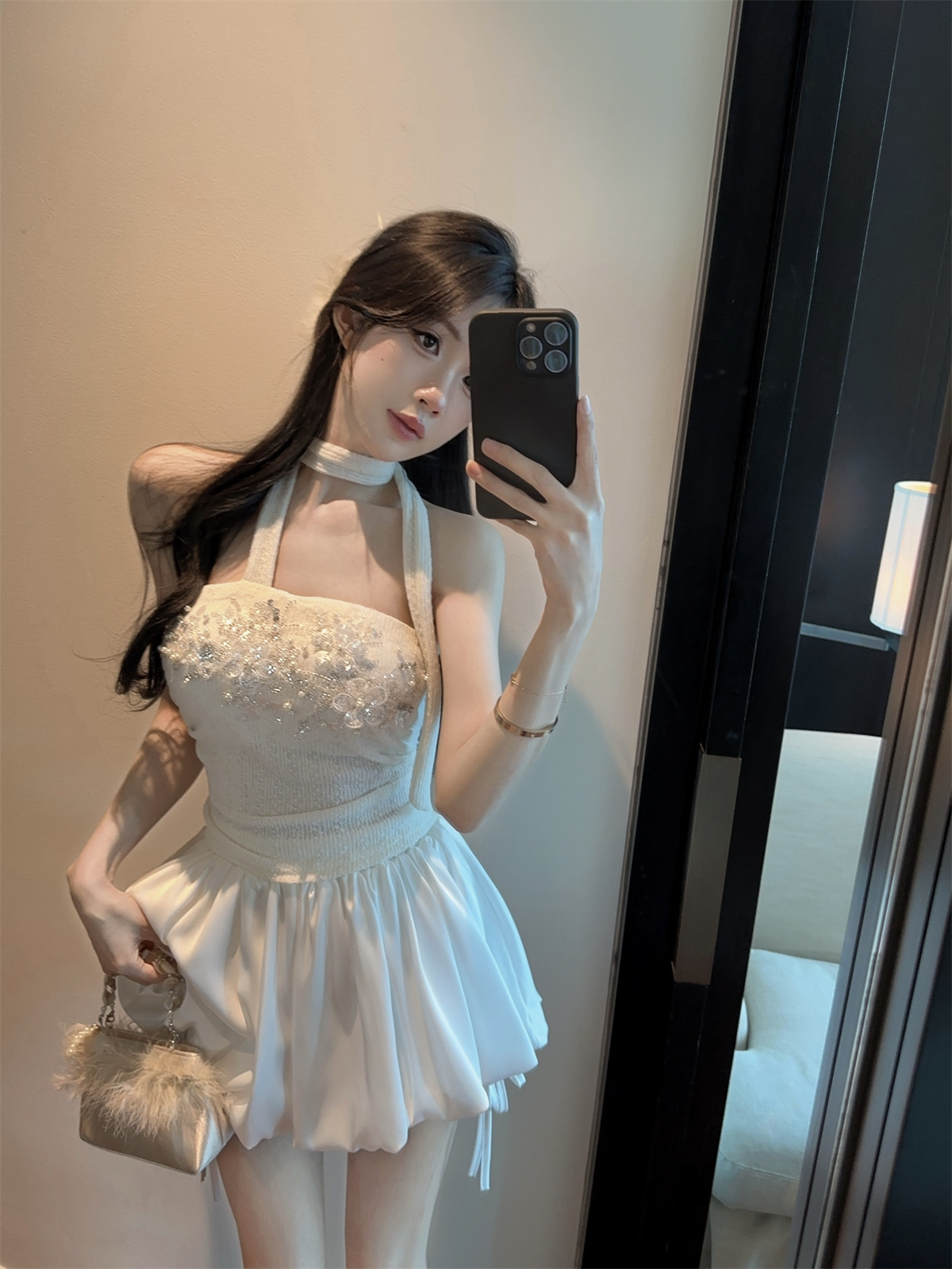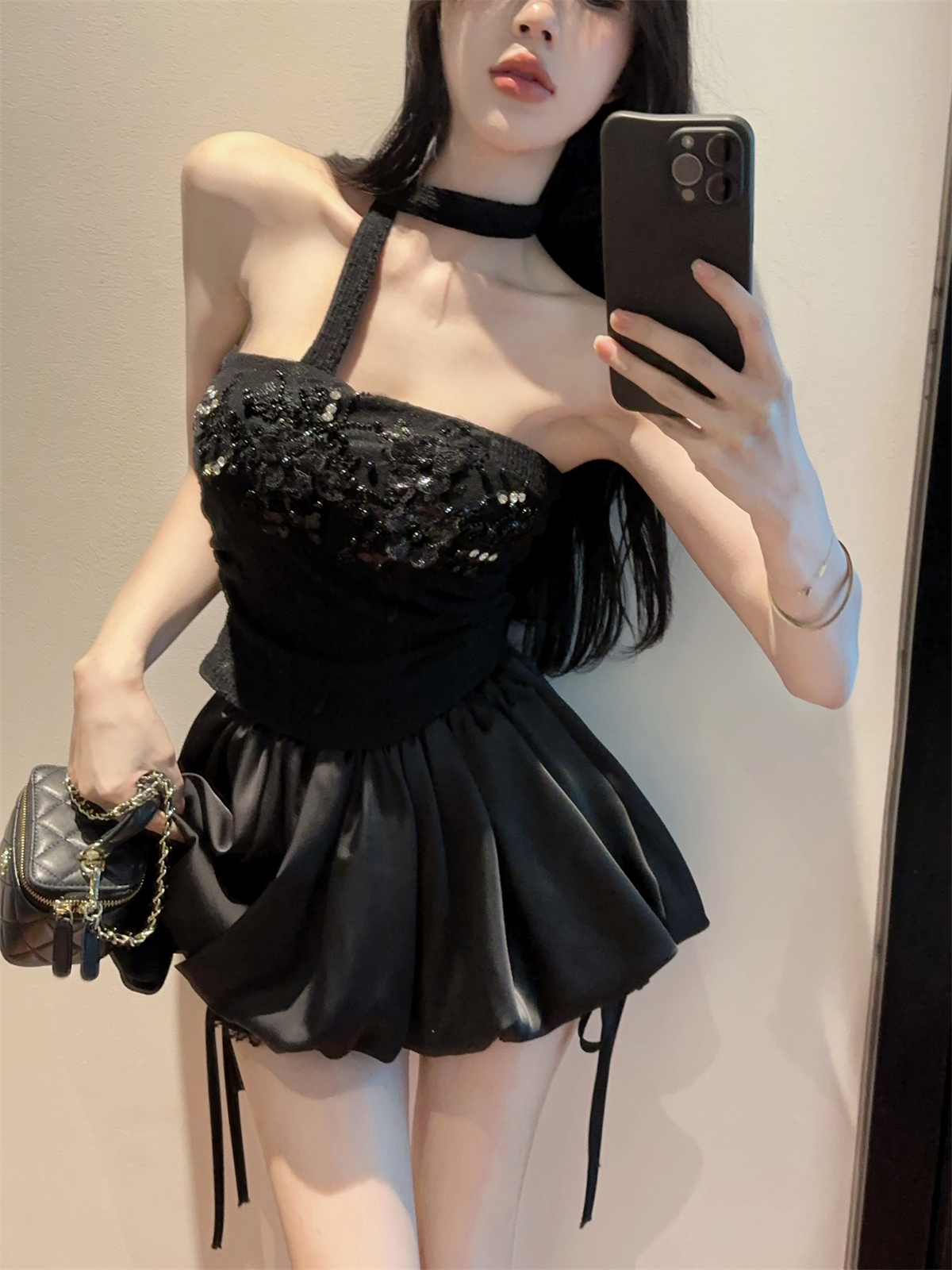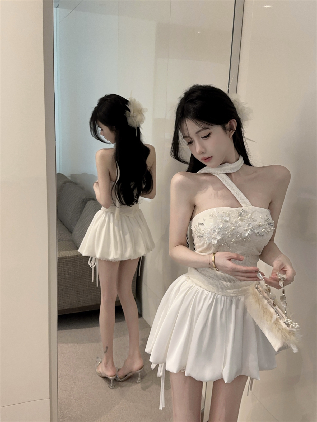 실사 정가 부드러운 모피 철자 레이스 레이스 스트랩 순수한 욕망 튜브탑 빛 럭셔리 자수 미니 스커트 여성 봄 세트