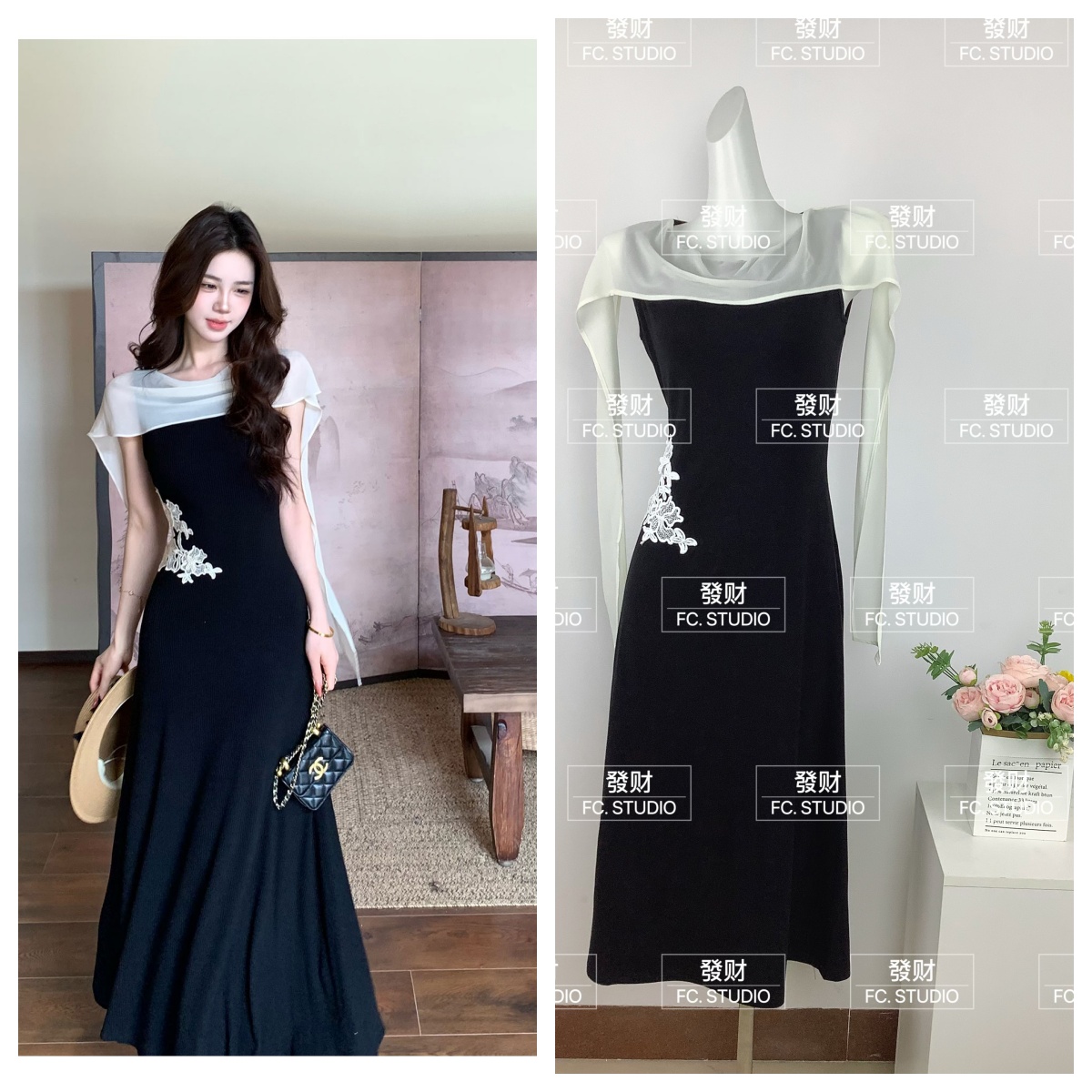 무쯔리 목자이 ~ 중 리 잉크 켜기 서리 꽃 품격 분위기 센스 홀로우 아웃 꽃 패치워크 새로운 중식 드레스