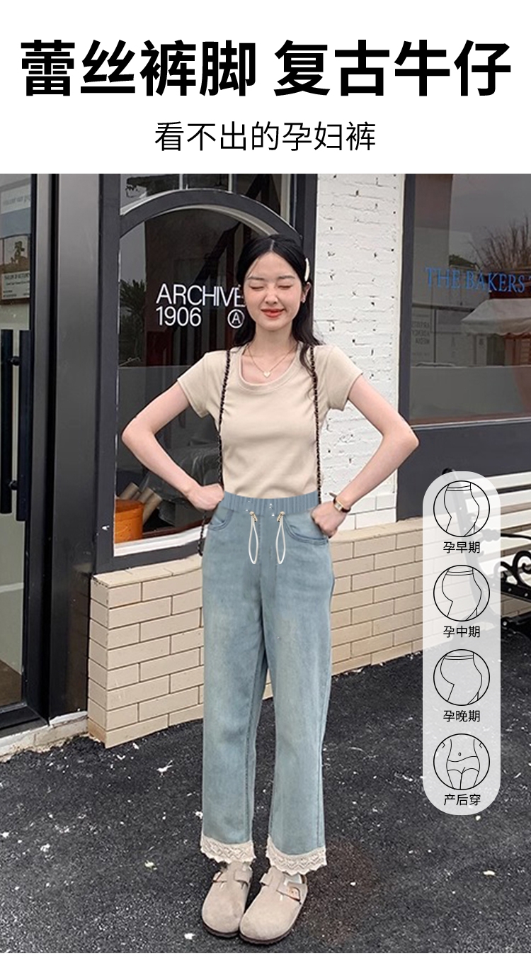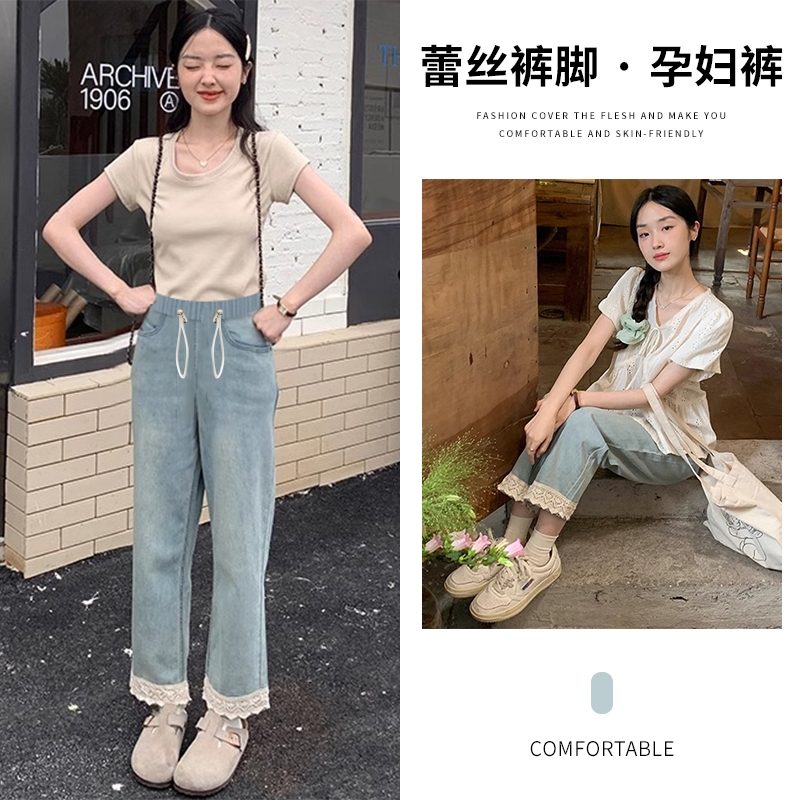 임산부 펌프 로프 레이스 청바지 9부 바지 없음 복부 지지 스트레이트 팬츠 루즈핏 와이드 레그 팬츠