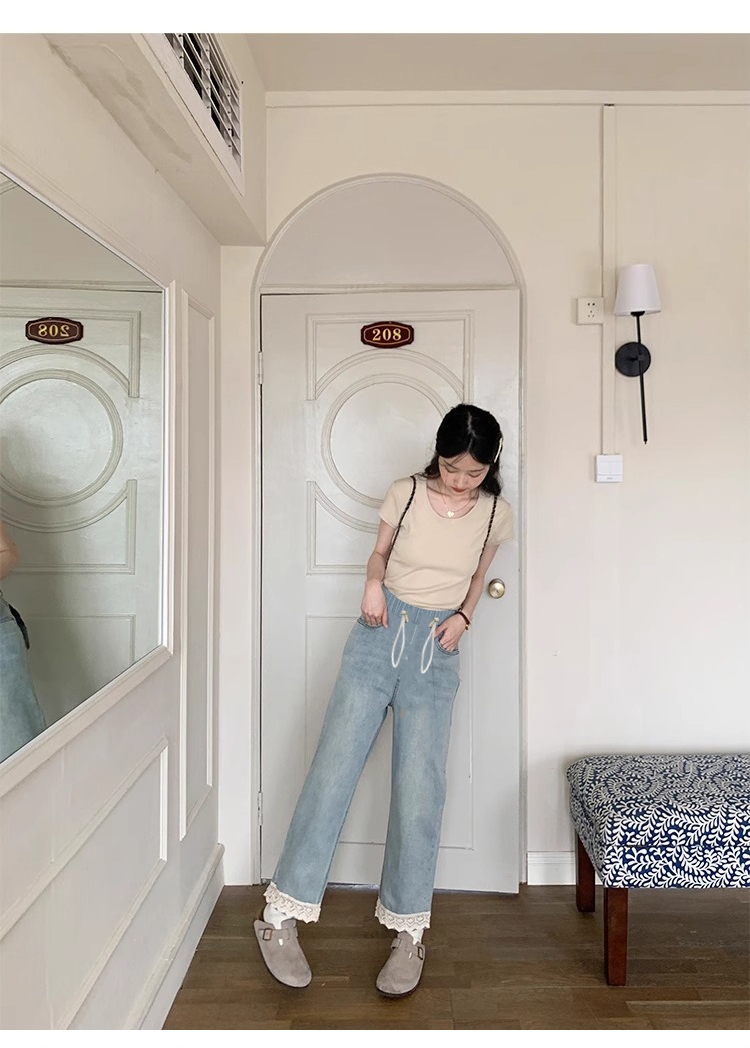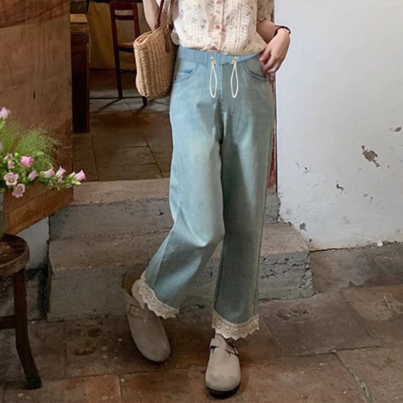 임산부 펌프 로프 데님 긴 바지 단 닝 블루 떨어지지 않음 색상 봄 가을 외출용 와이드 레그 팬츠 스트레이트 팬츠