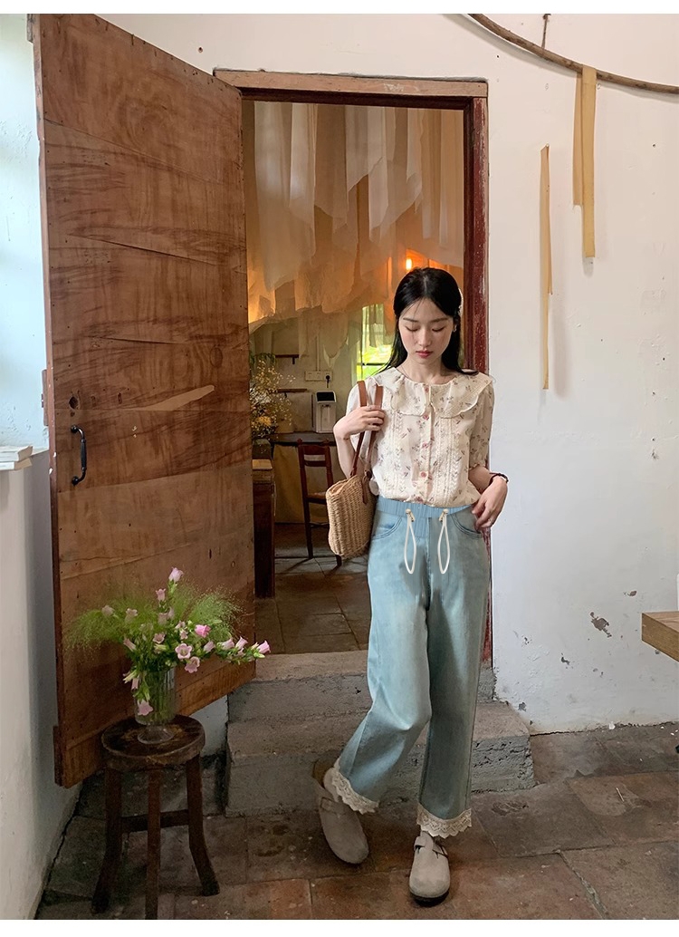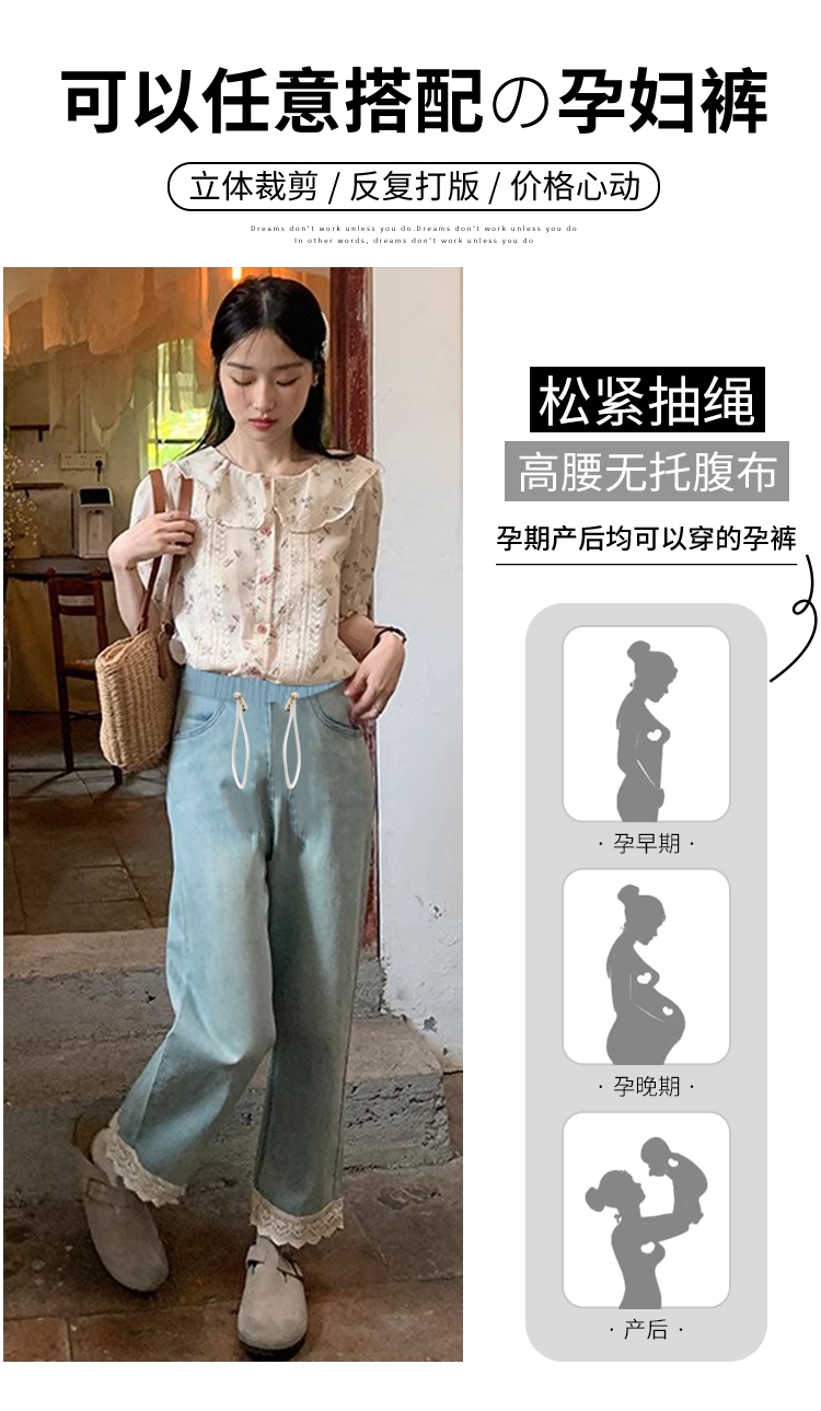 임산부 9 포인트 꽃 측면 청바지 펌프 로프 복부 지지 바지 외출용 스트레이트 팬츠 루즈핏 와이드 레그 팬츠