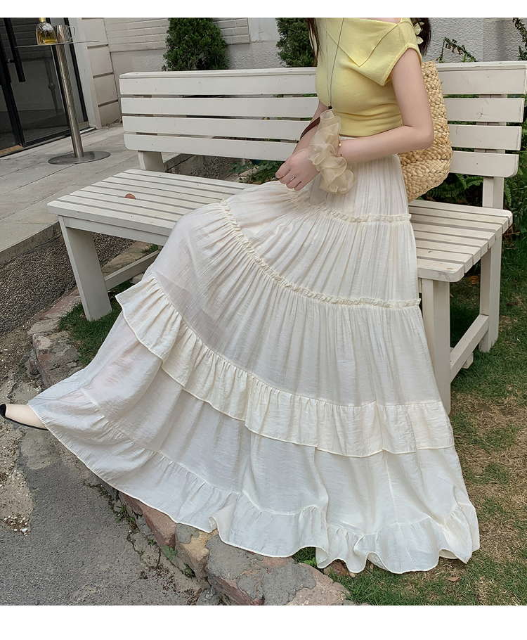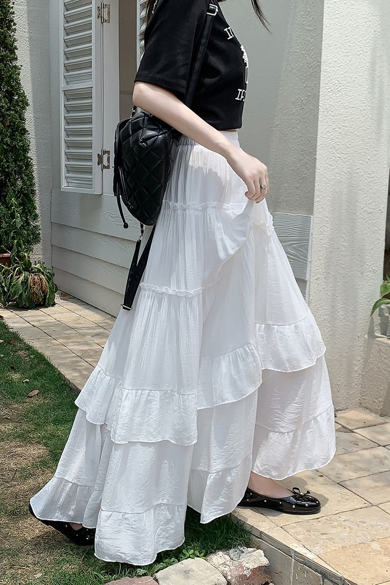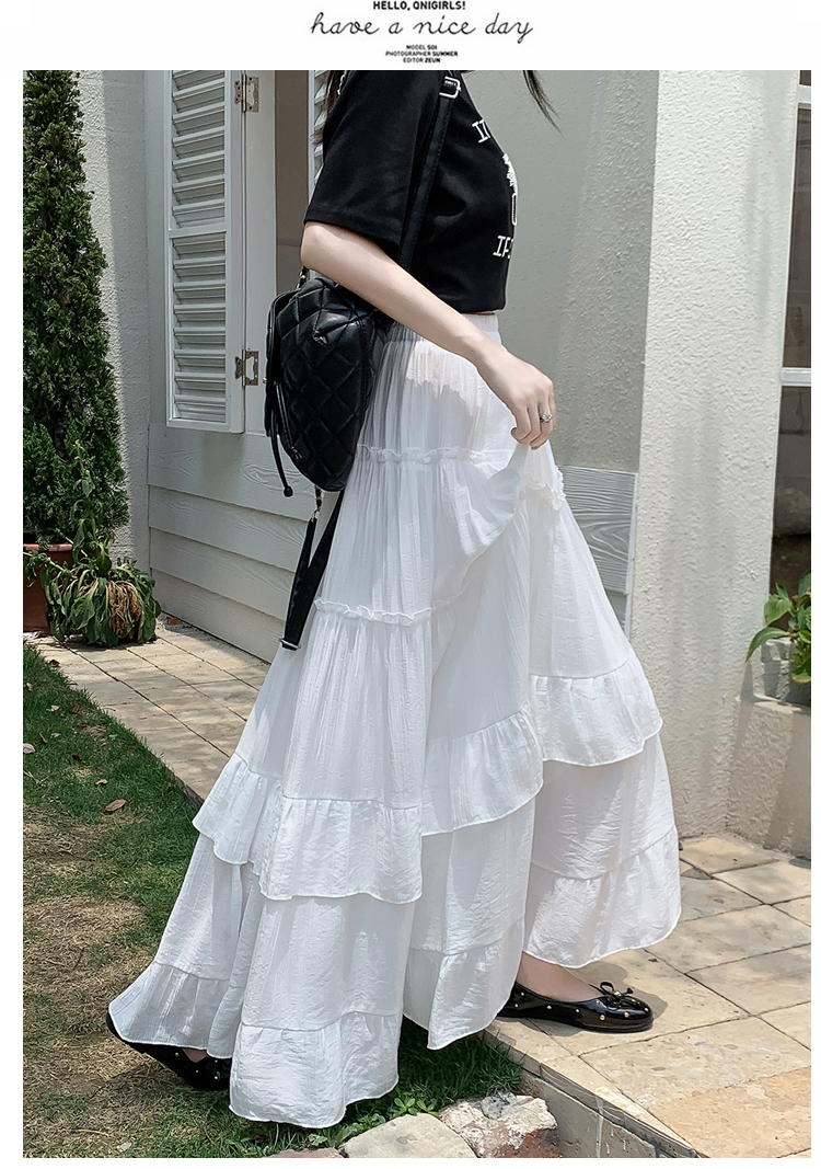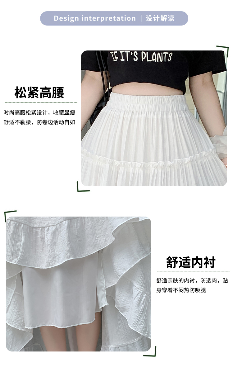 디자인 센스 화이트 롱 스커트 허리밴드 도루 가을 쉬폰 반신 스커트 프릴 측면 단색 불규칙 롱 스커트