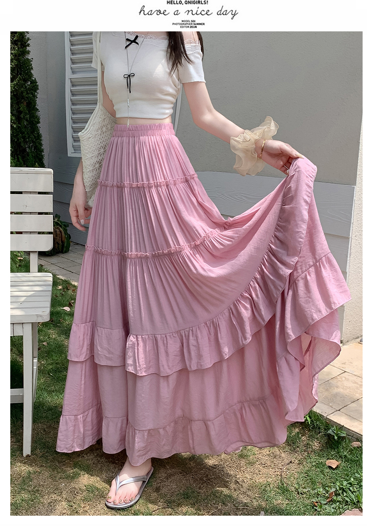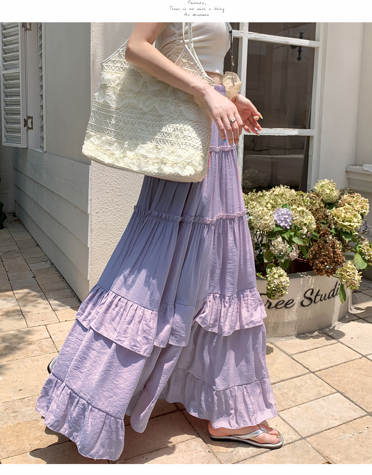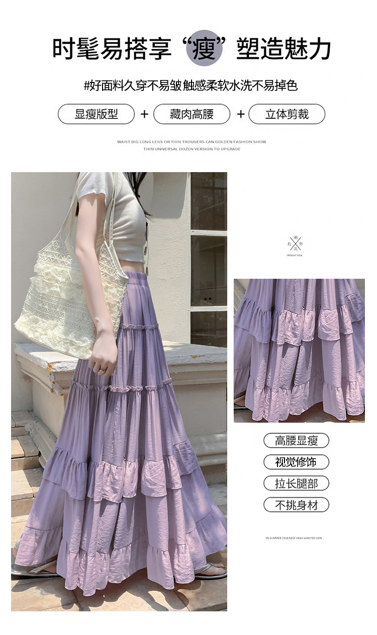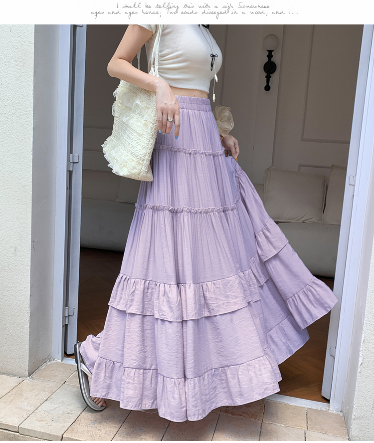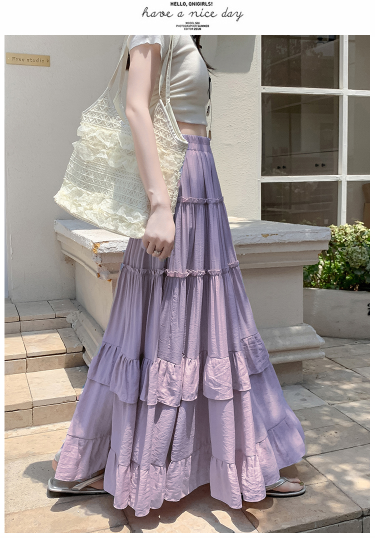 재고 상품 보라색 롱 스커트 반신 스커트 여성 2025 새로운 봄 여름 케이크 드레스 프릴 빅 플레어 스커트 우산 치마