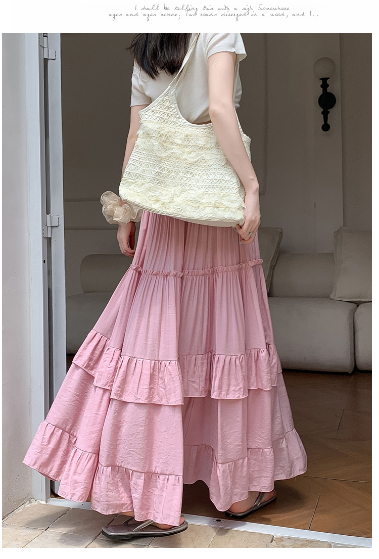 프랑스식 불규칙 체크무늬 핑크색 반신 스커트 여성 여름 하이웨이스트 프릴 쉬폰 한 마디 롱 스커트