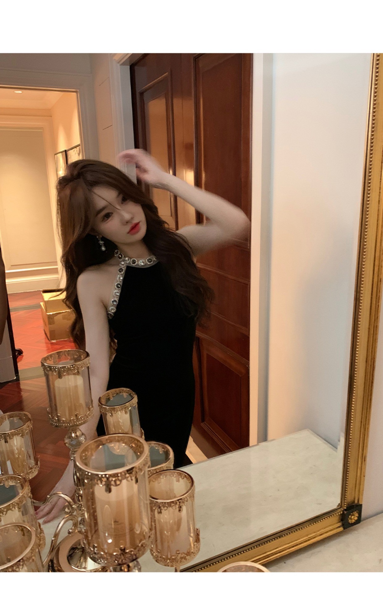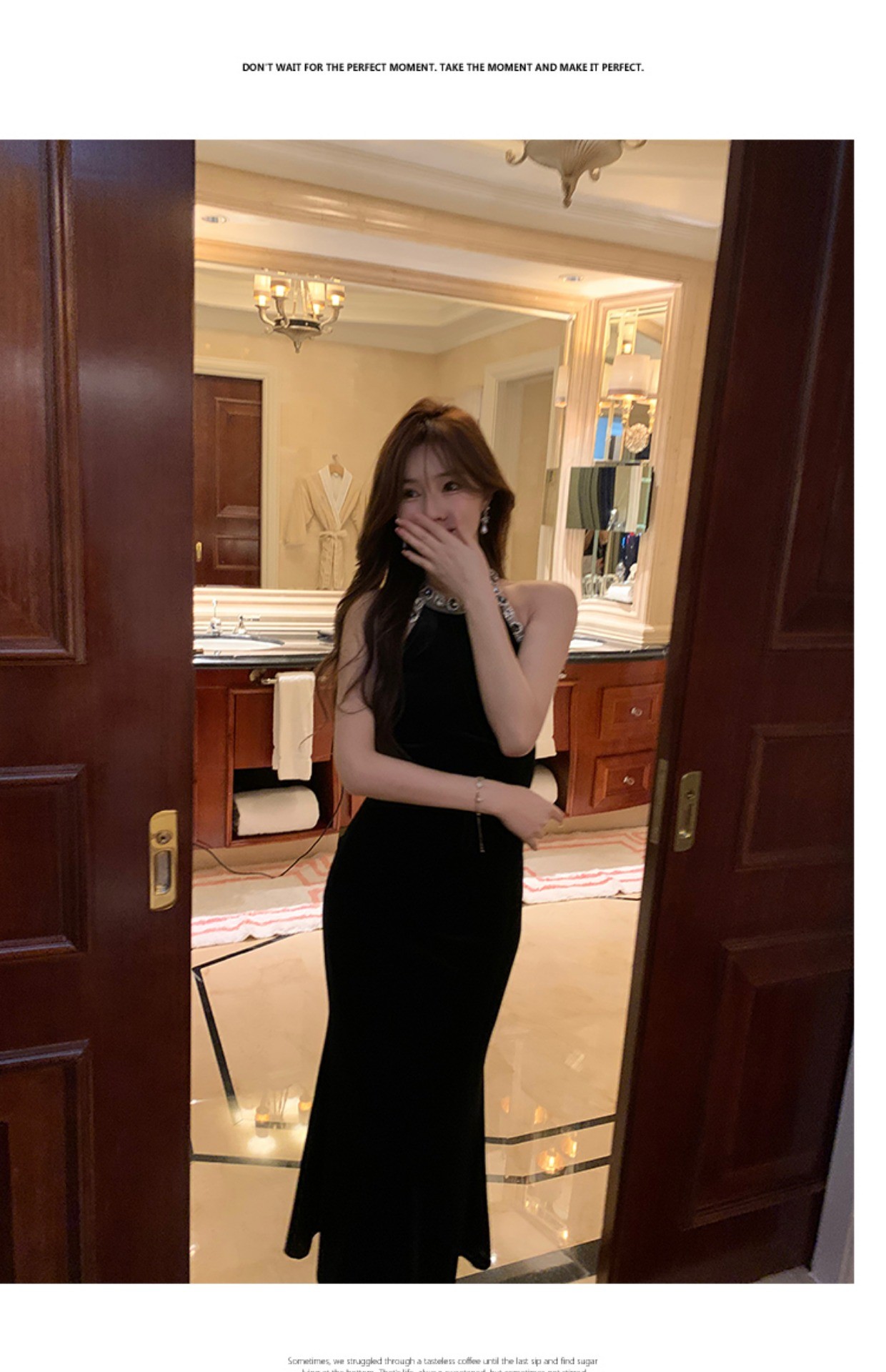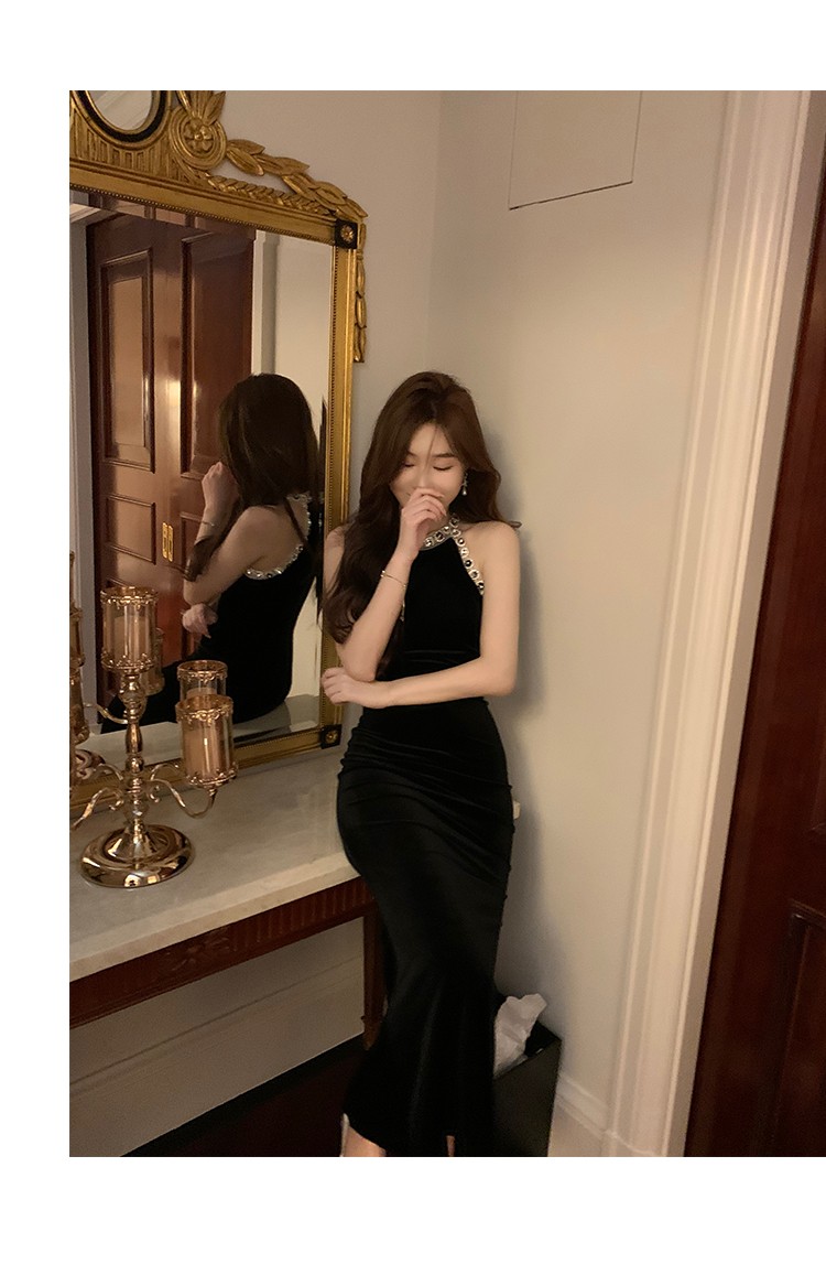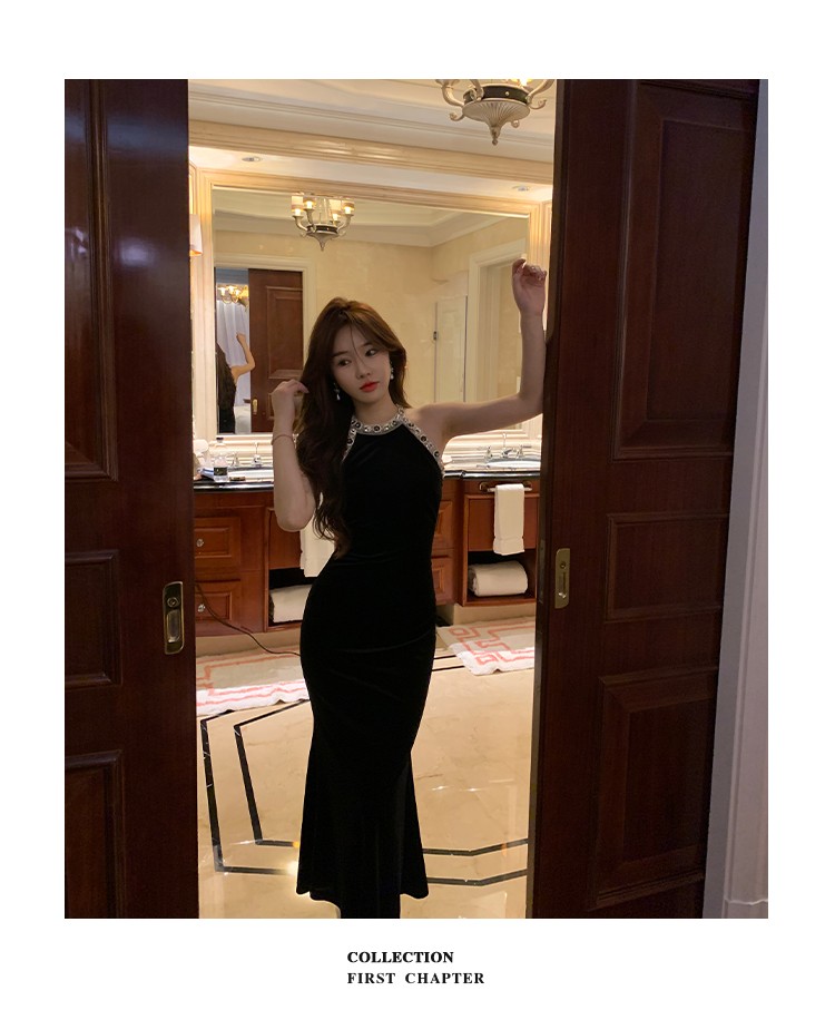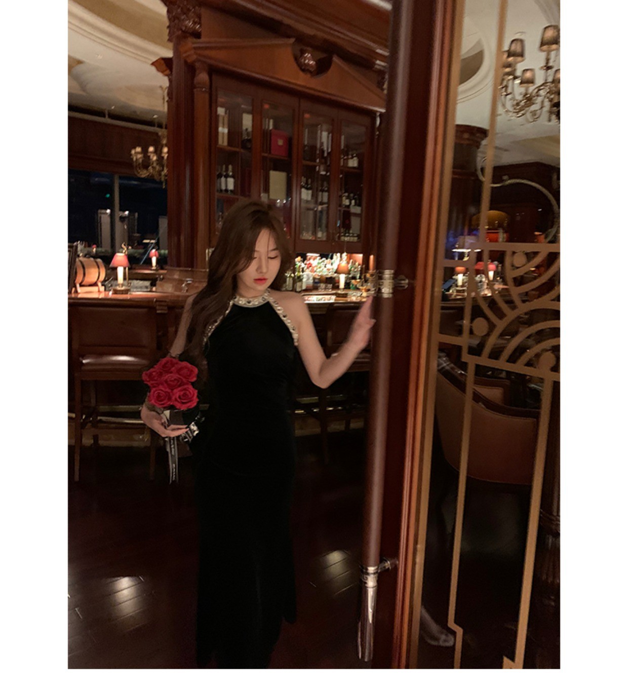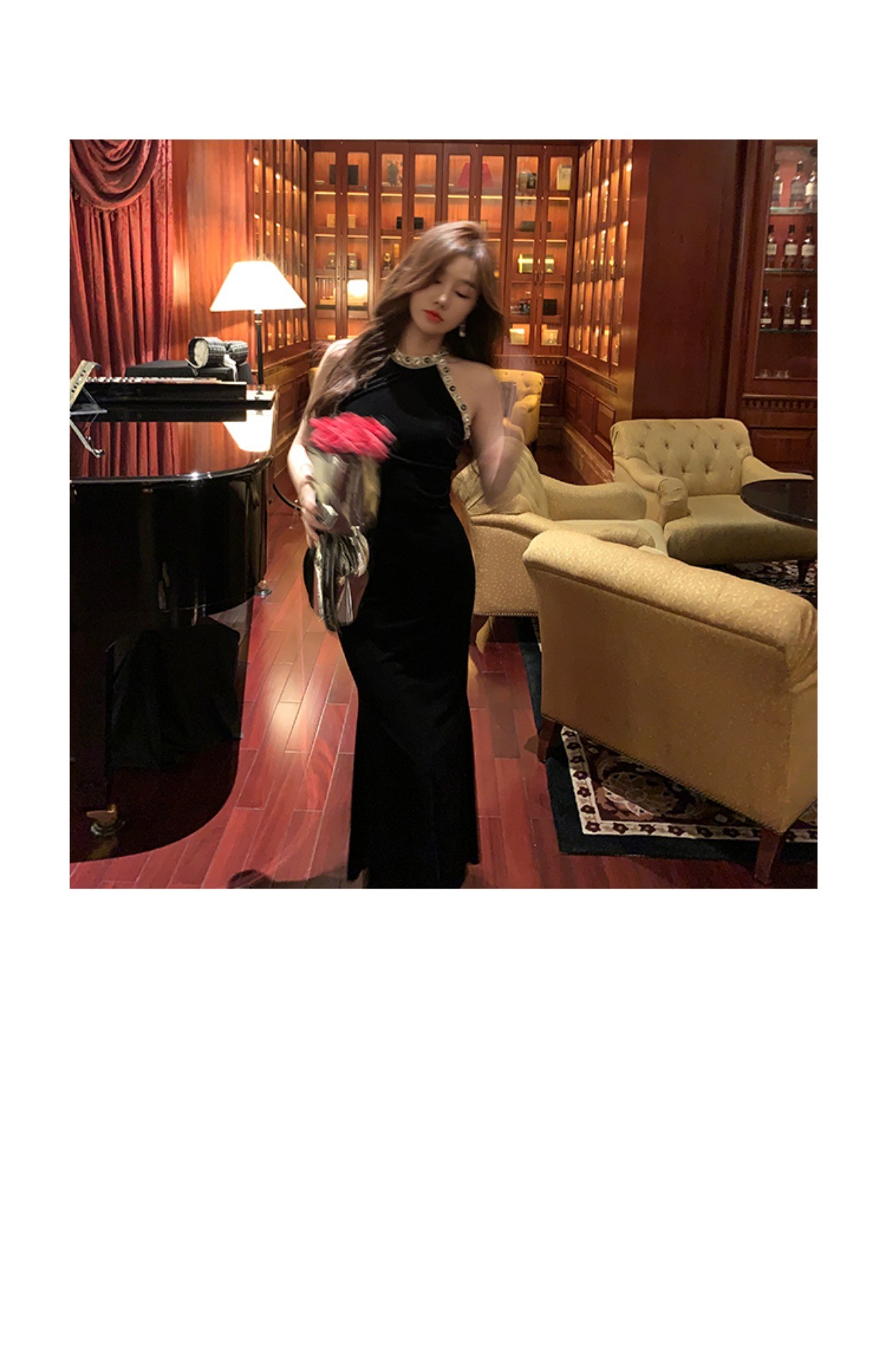 고급 센스 높음 트임 깊은 V 넥 행침 목 드레스 이슬 허리 백리스 타이트 스커트 인어 꼬리 스커트 품격 롱 스커트