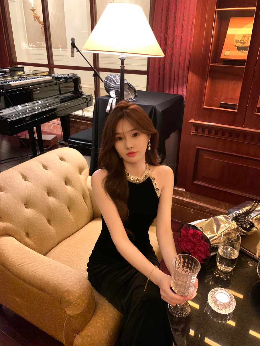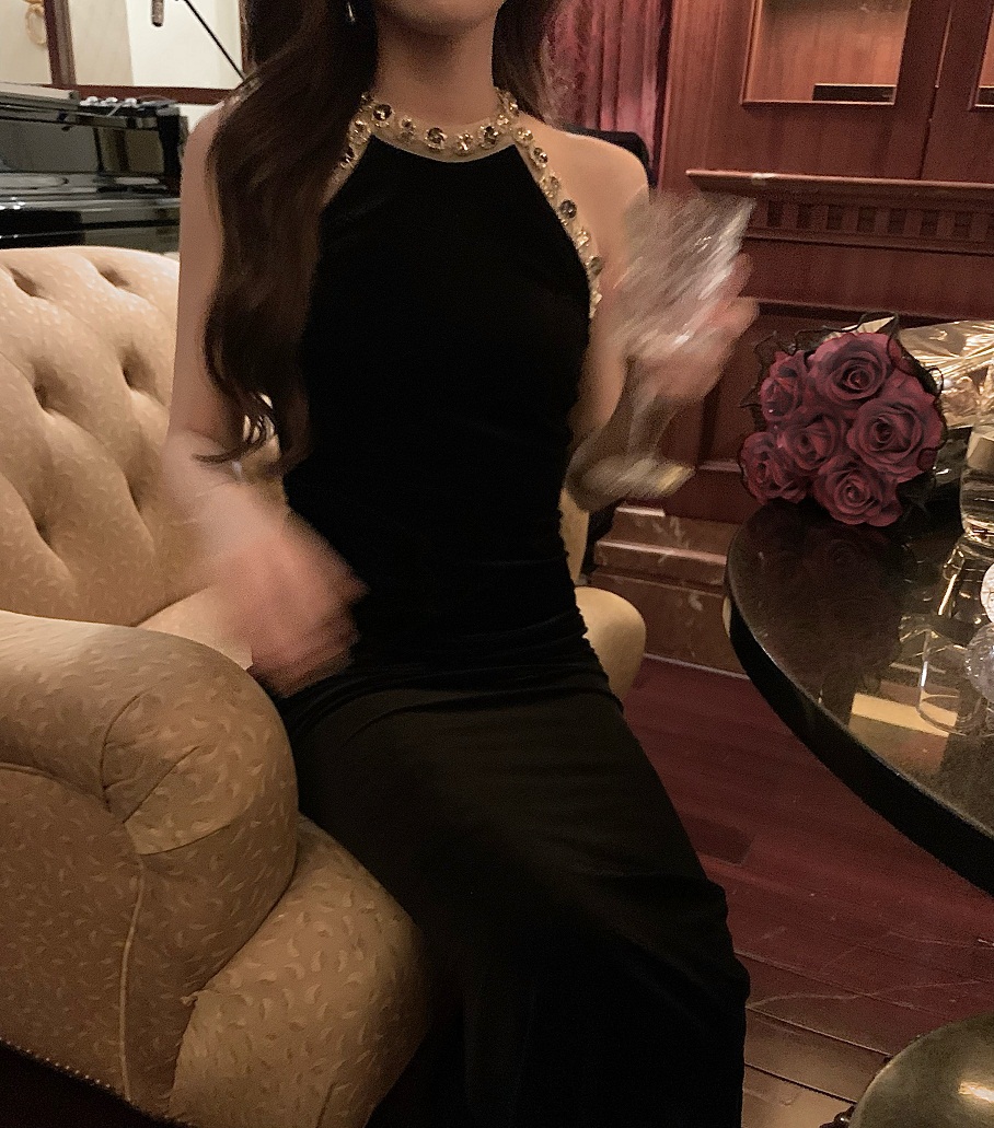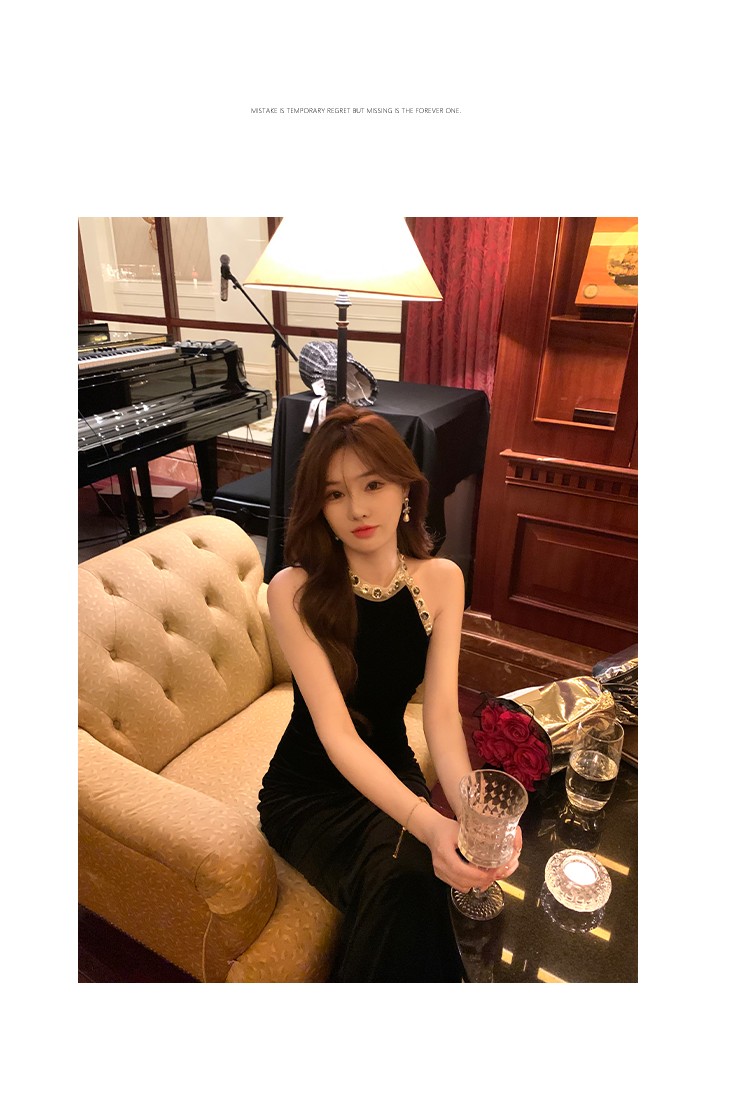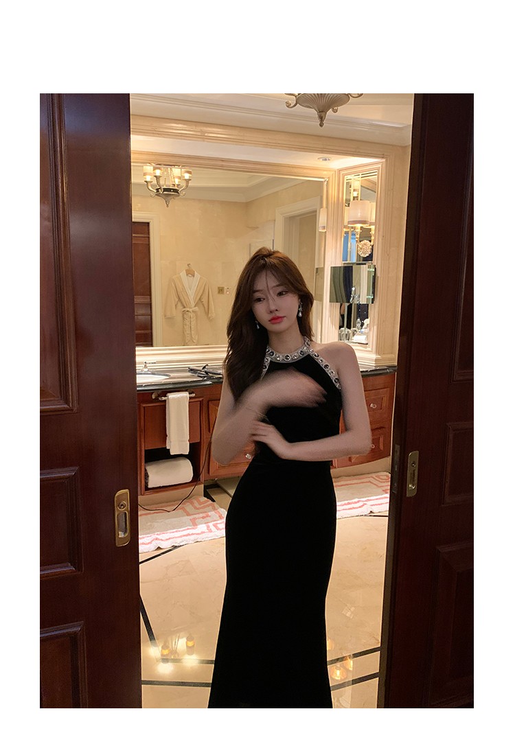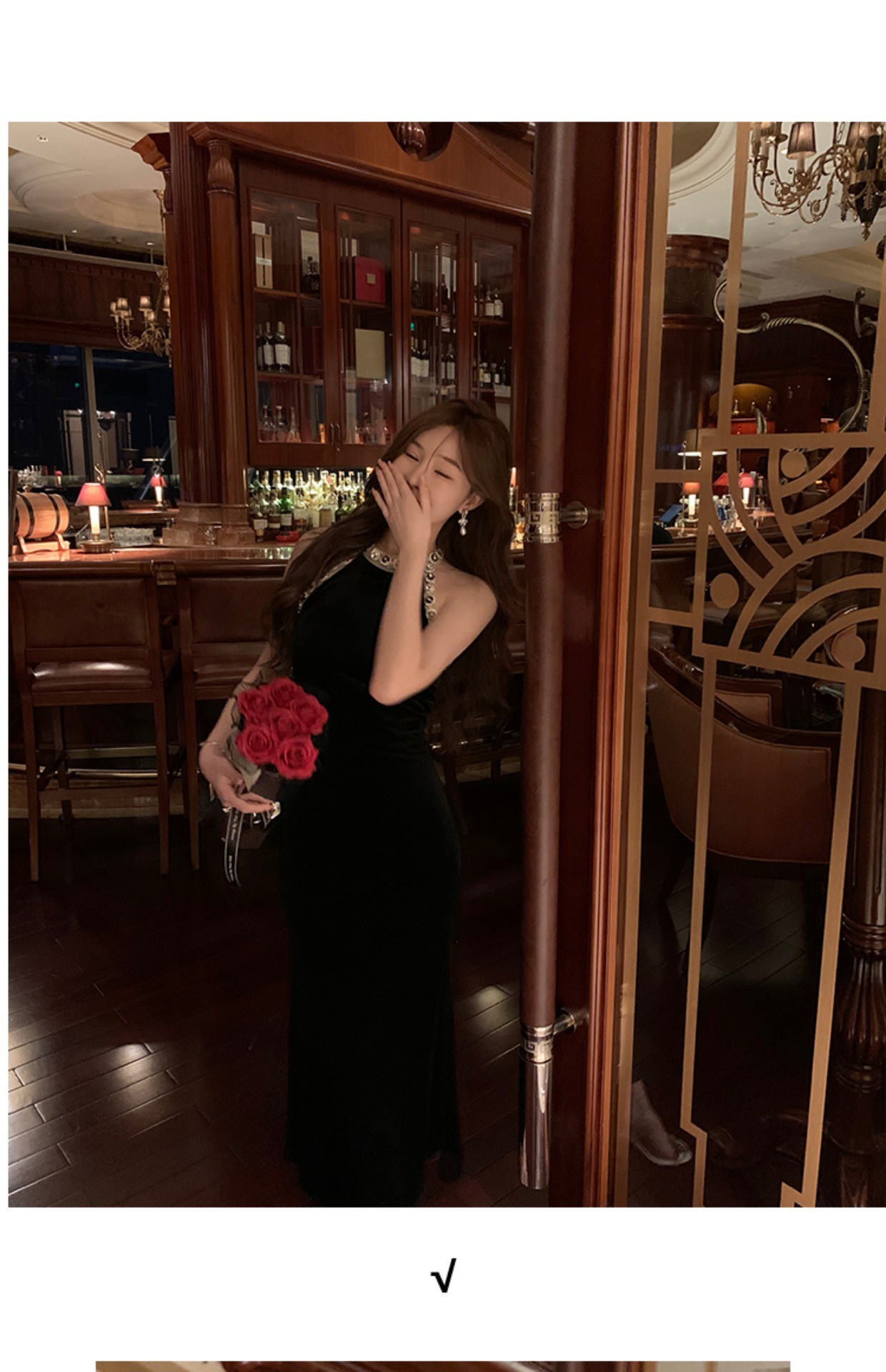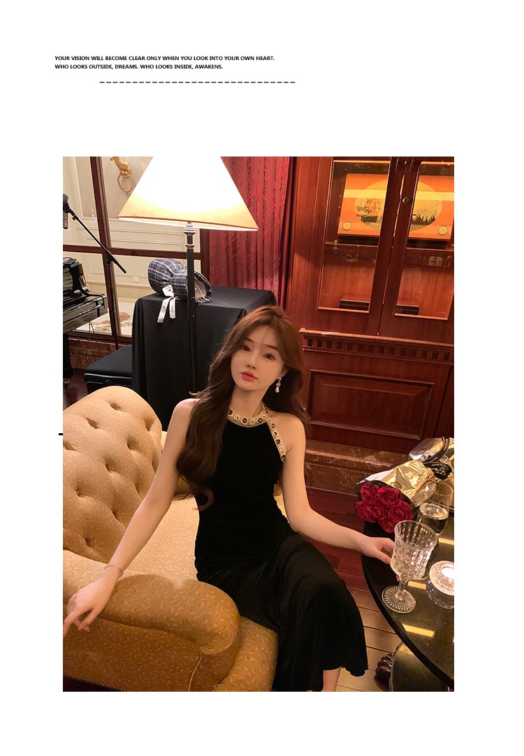 고급 센스 높음 트임 깊은 V 넥 행침 목 드레스 이슬 허리 백리스 타이트 스커트 인어 꼬리 스커트 품격 롱 스커트