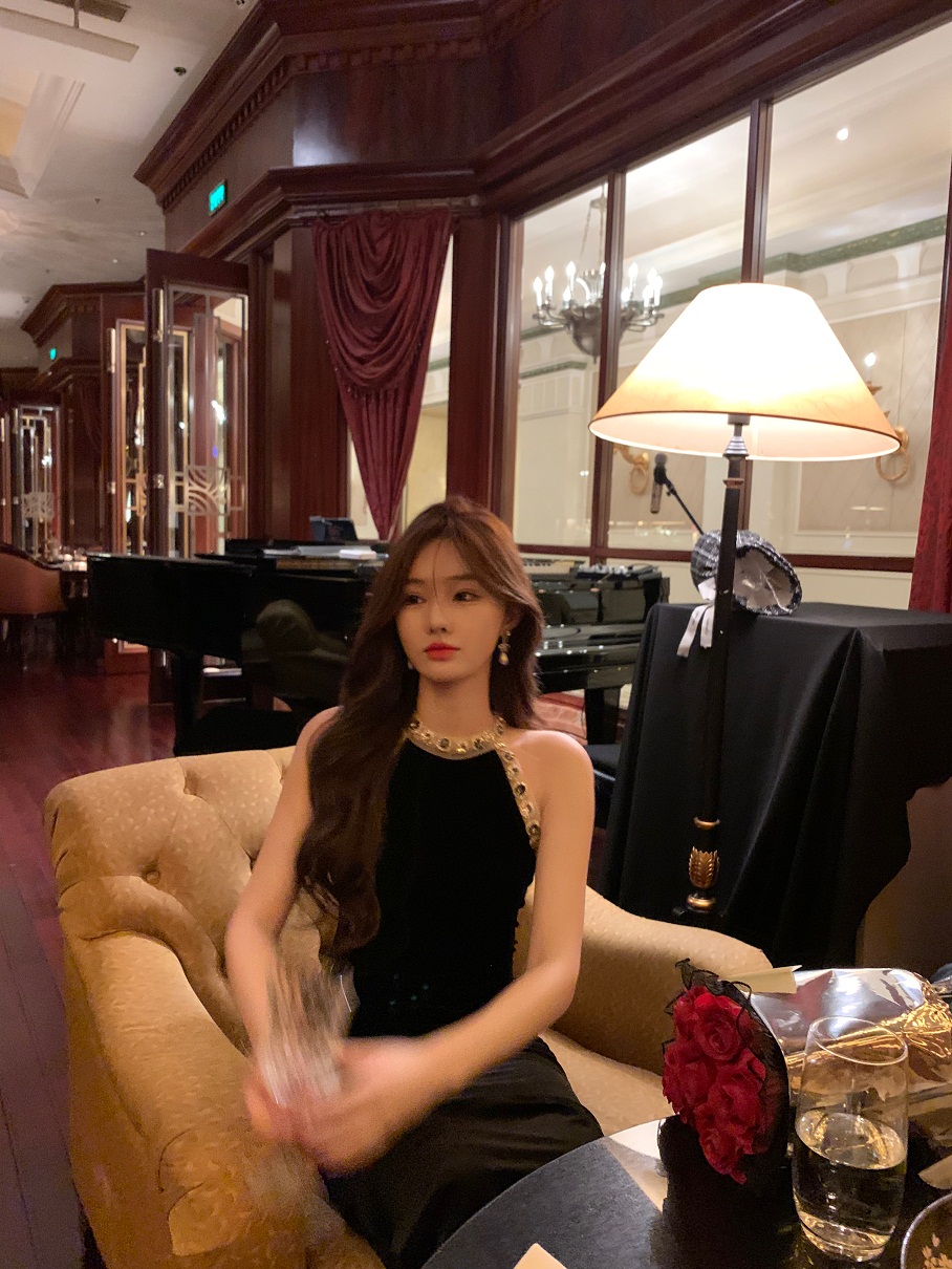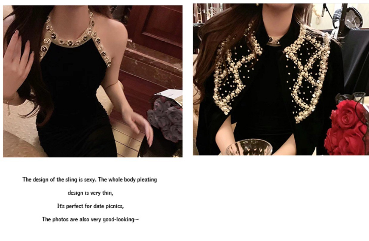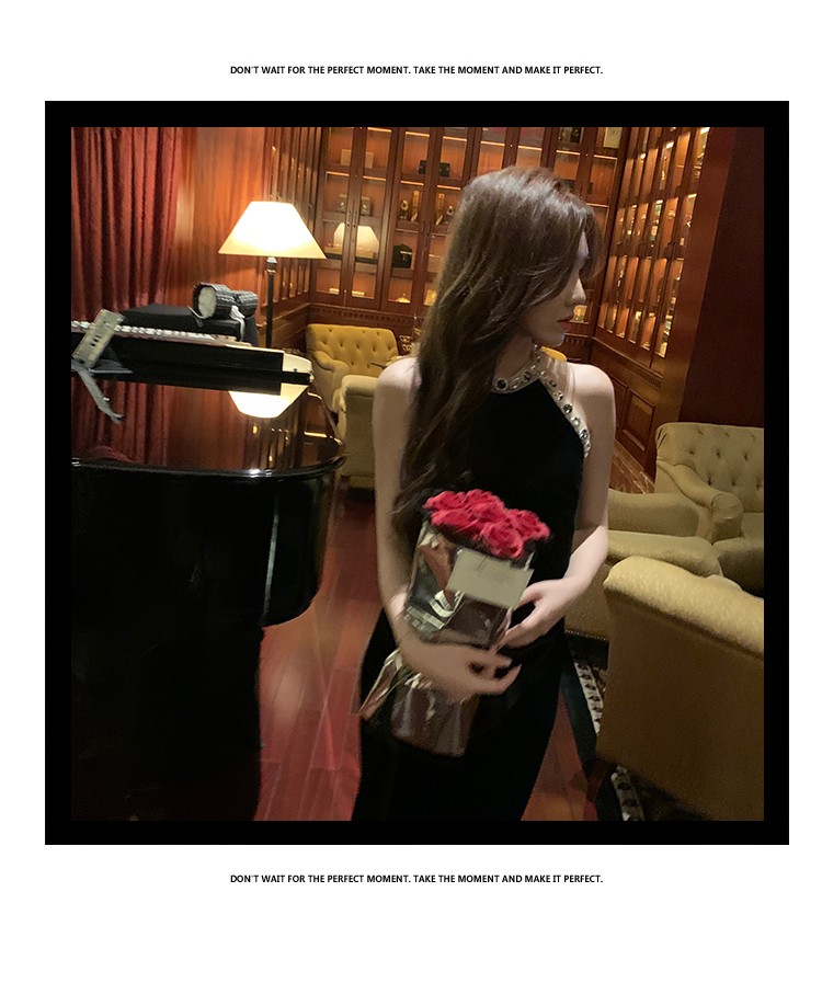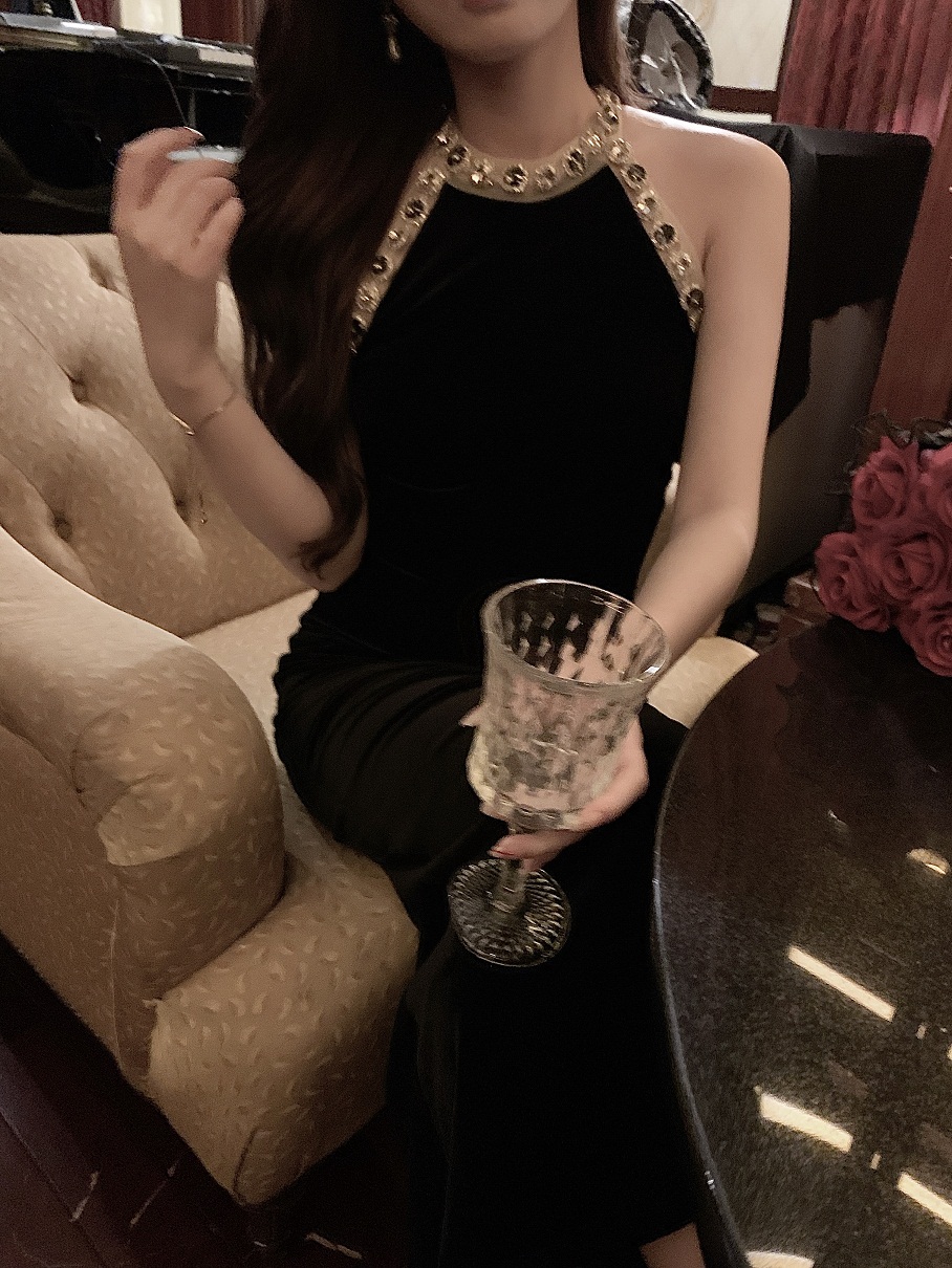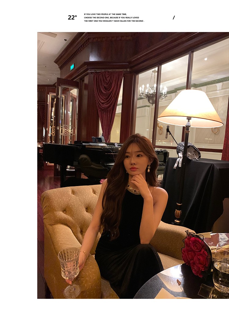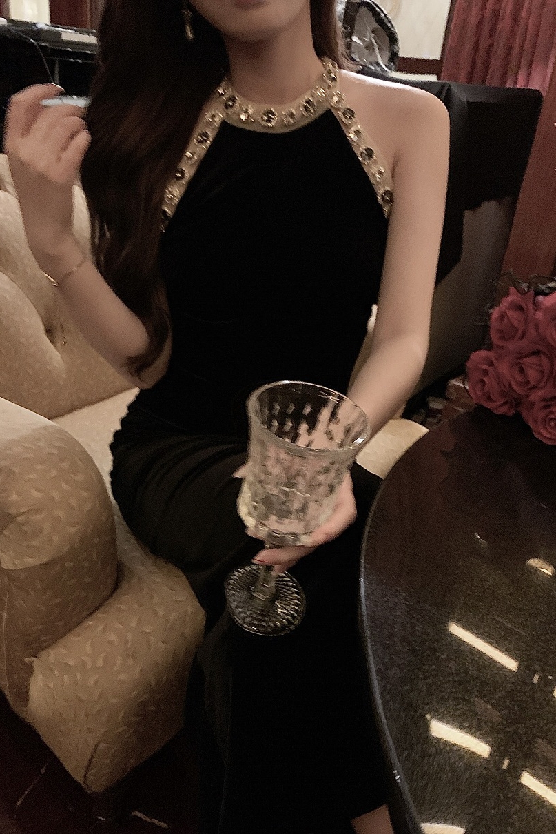 고급 센스 높음 트임 깊은 V 넥 행침 목 드레스 이슬 허리 백리스 타이트 스커트 인어 꼬리 스커트 품격 롱 스커트