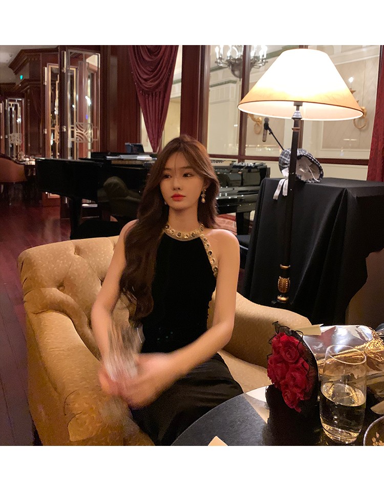 실사 2026 봄 여름 새로운 백리스 홀로우 아웃 품격 몸매 가꾸기 허리 수축 큰 진자 롱 스커트 단어 조끼 여성 드레스