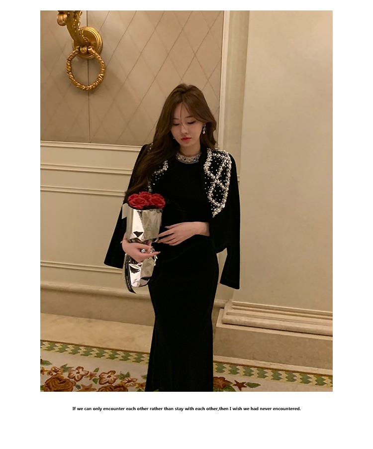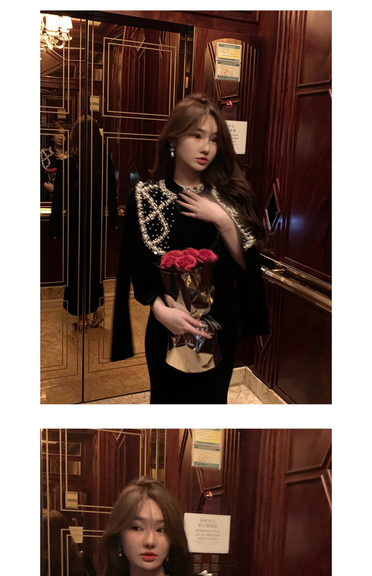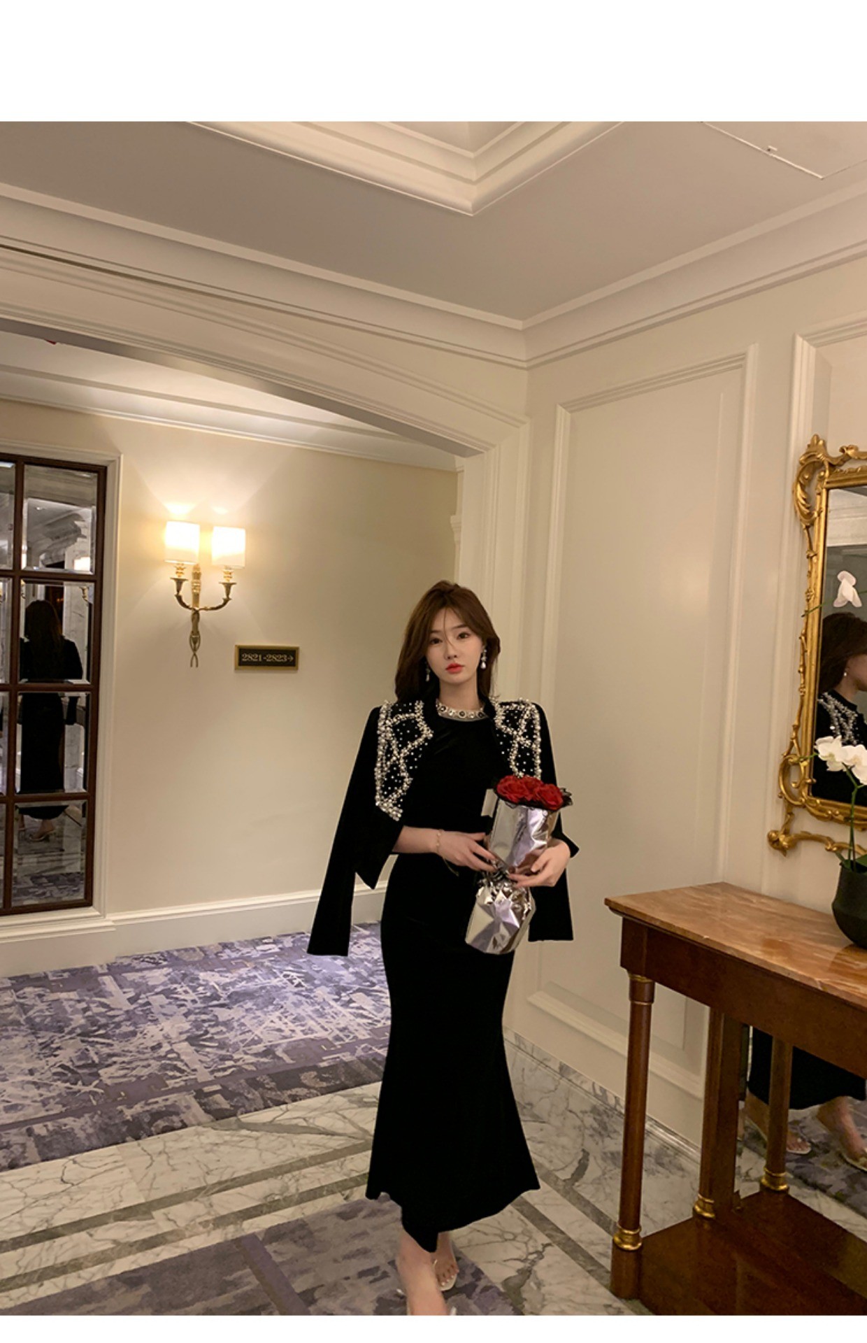 빛 럭셔리 제품 디자이너 검정색 벨벳 비즈 박기 행침 목 품격 명문 여성 연례 회의 모임 작은 드레스