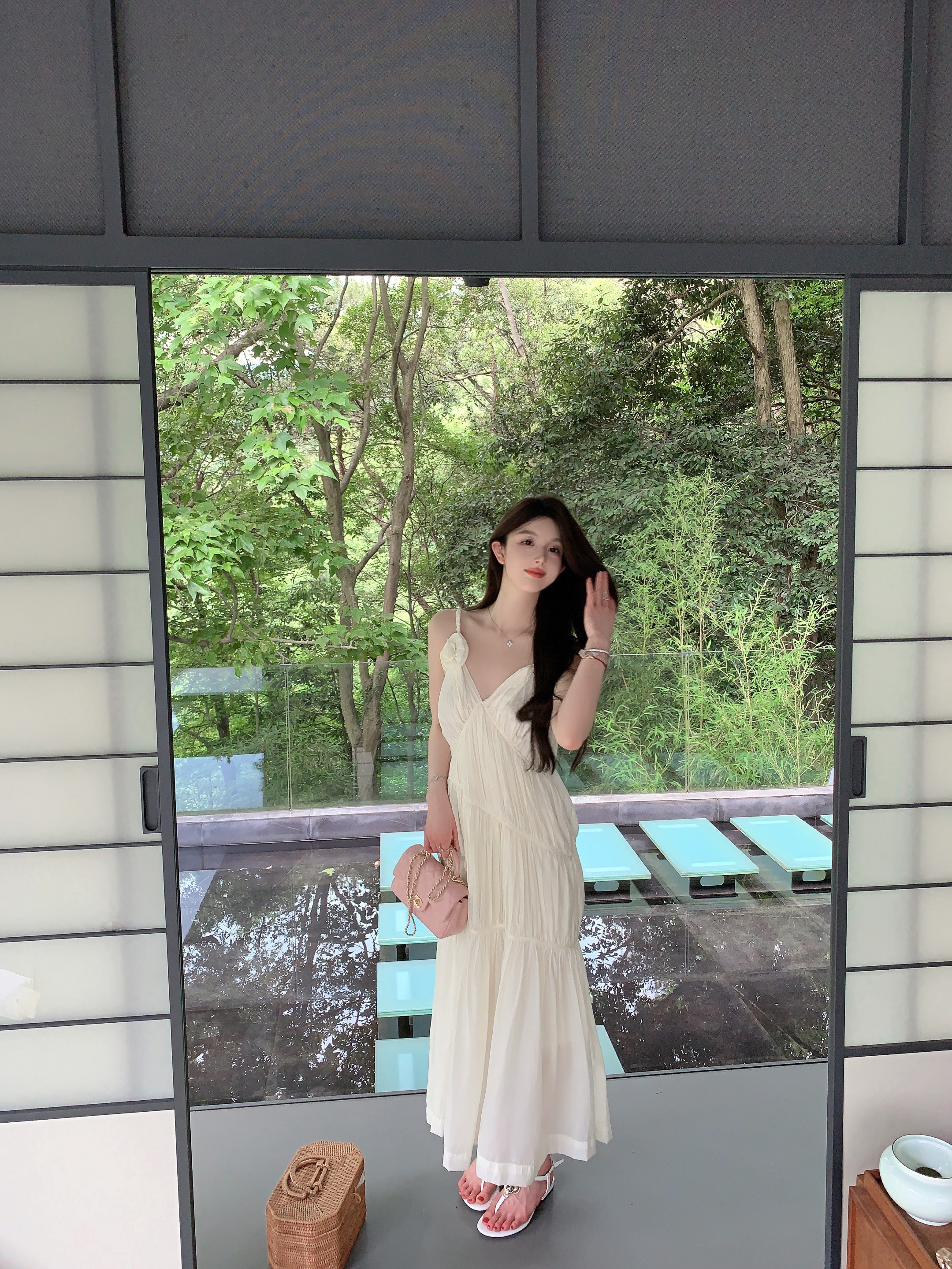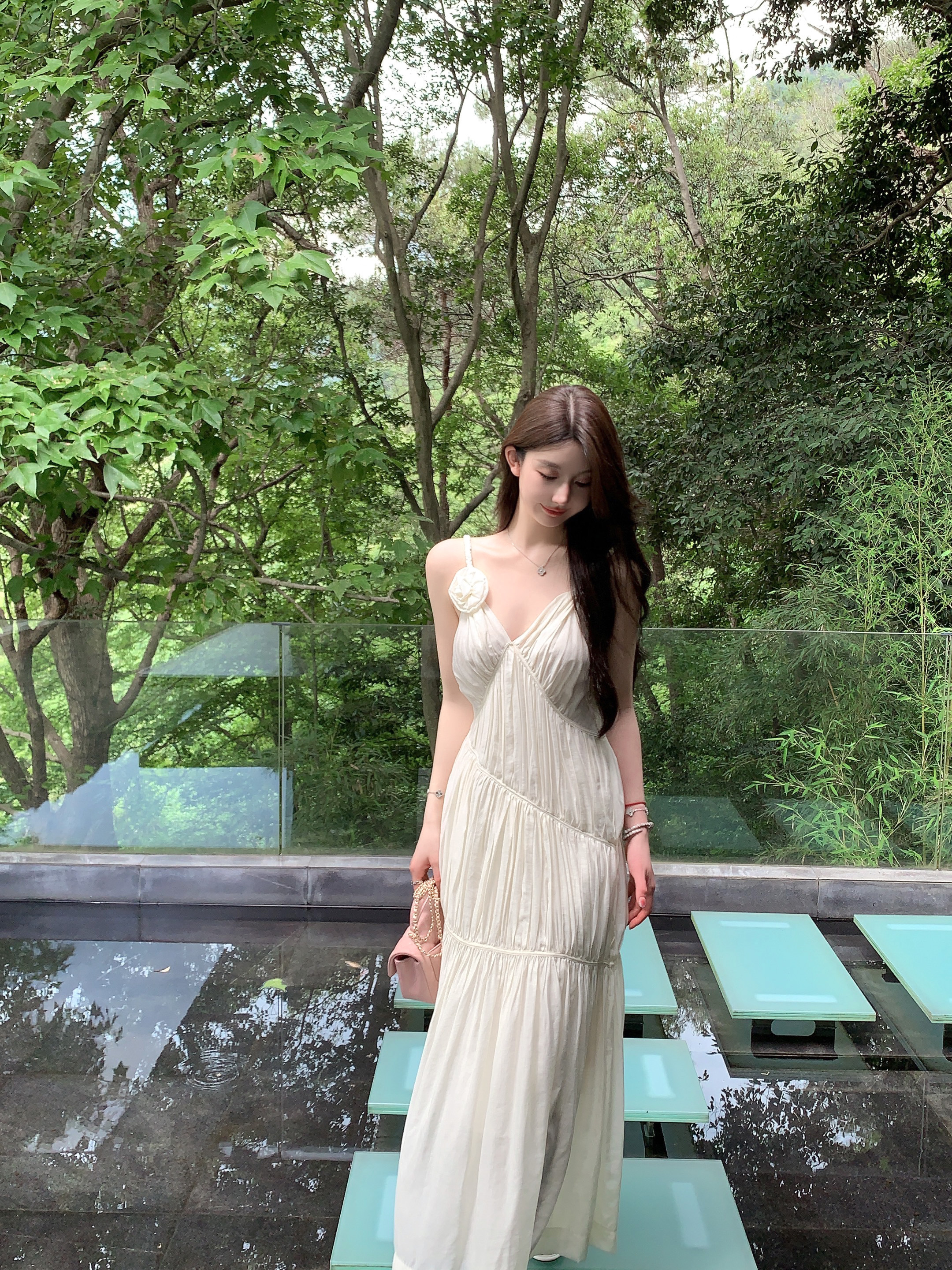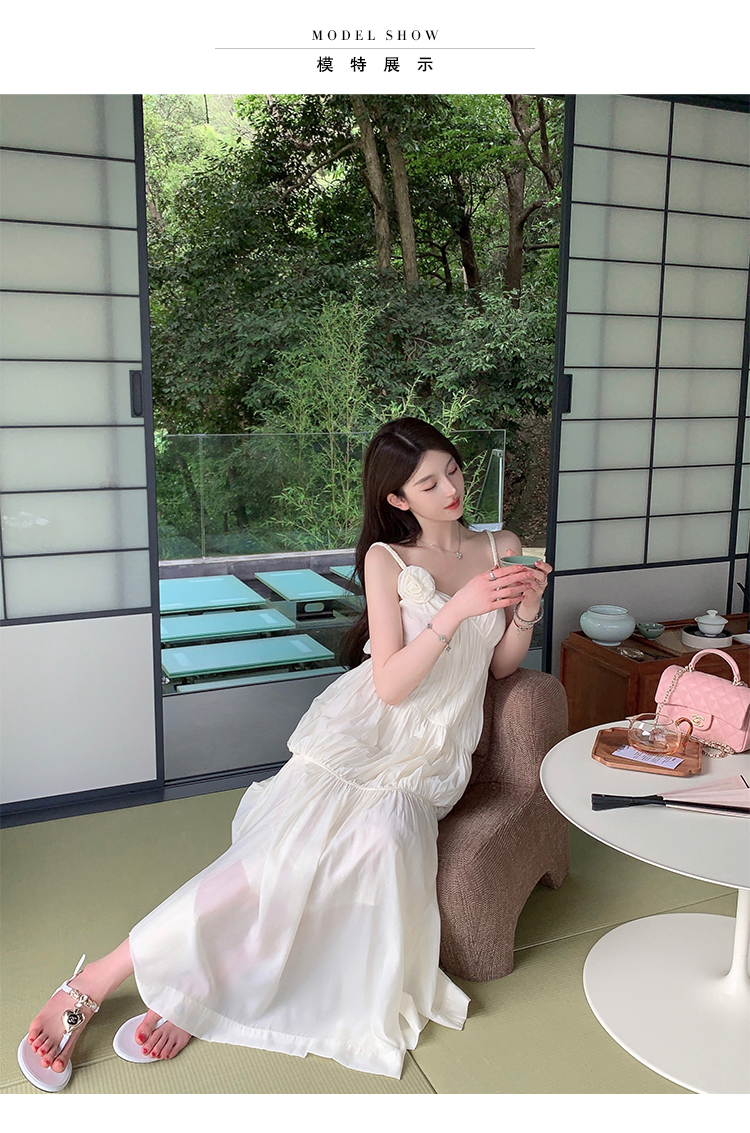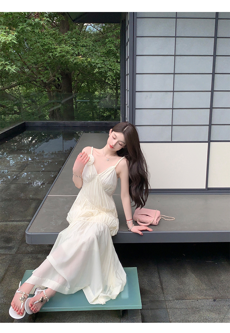화이트 V넥 실크 주름 슬립 드레스 롱 코트 무릎 아래 민소매 오프숄더 요정 치마