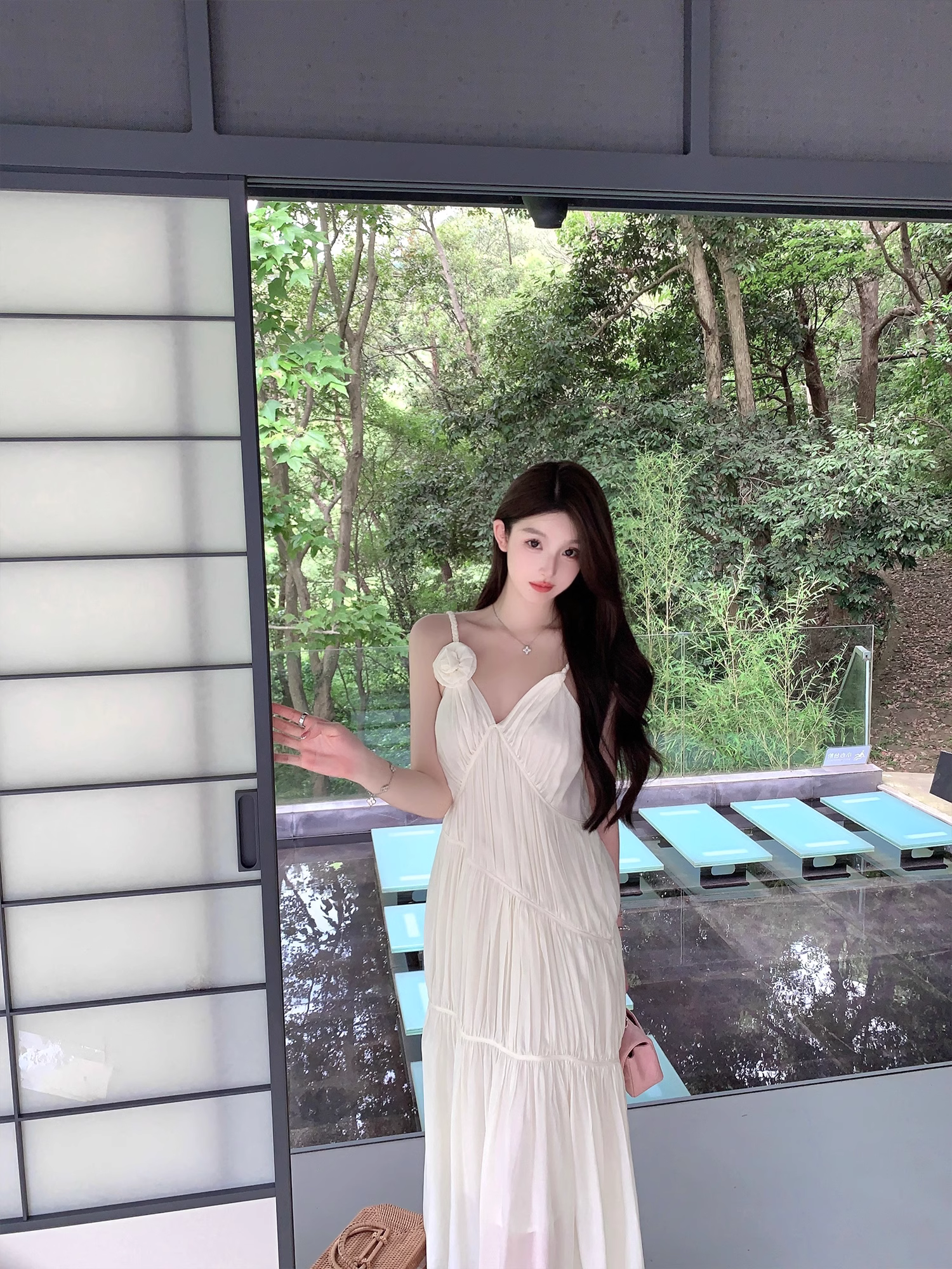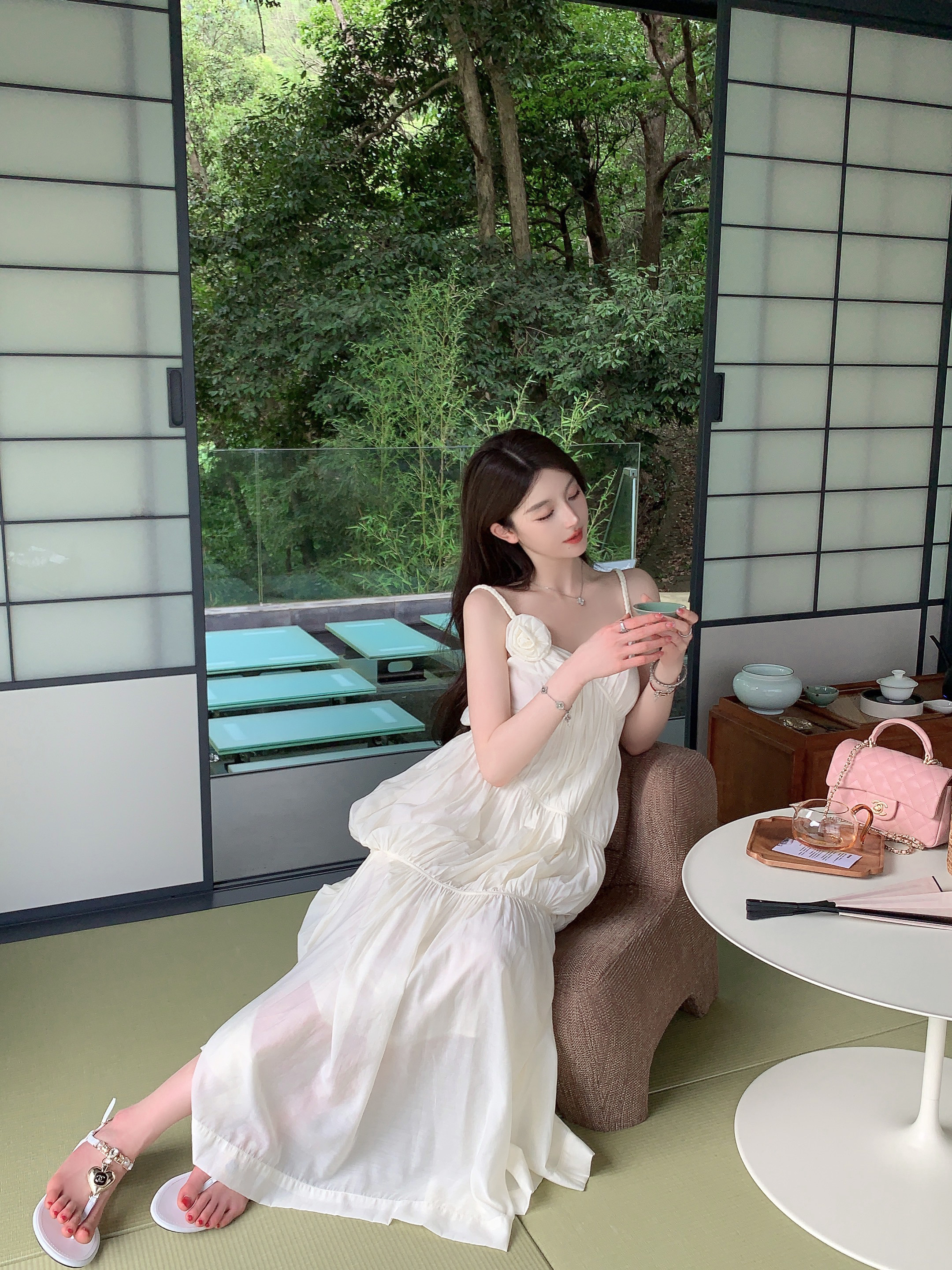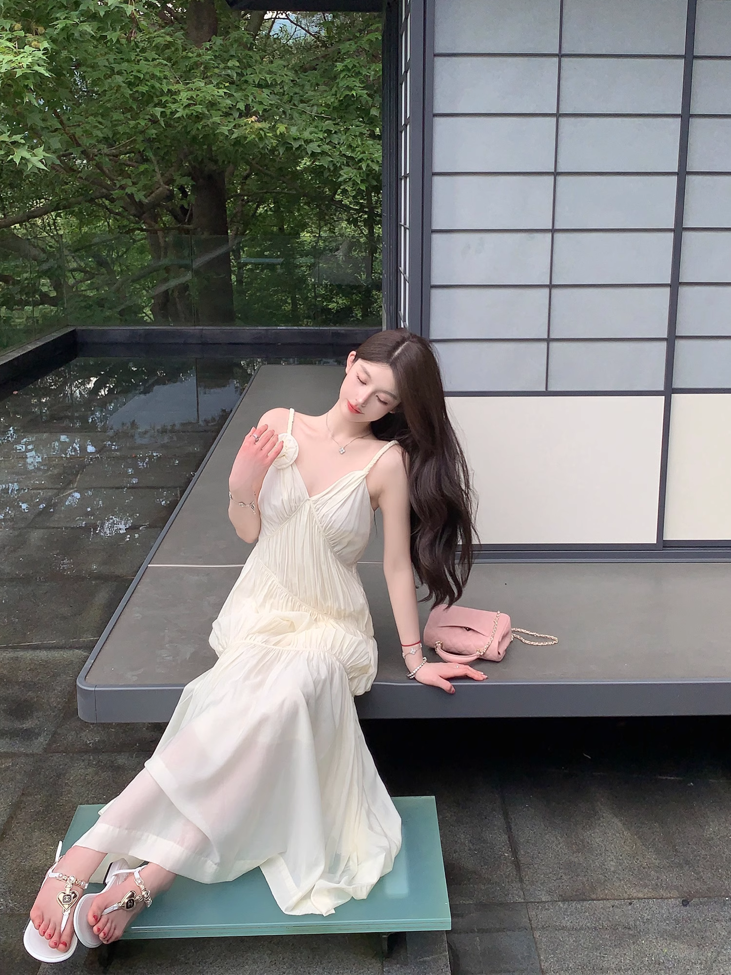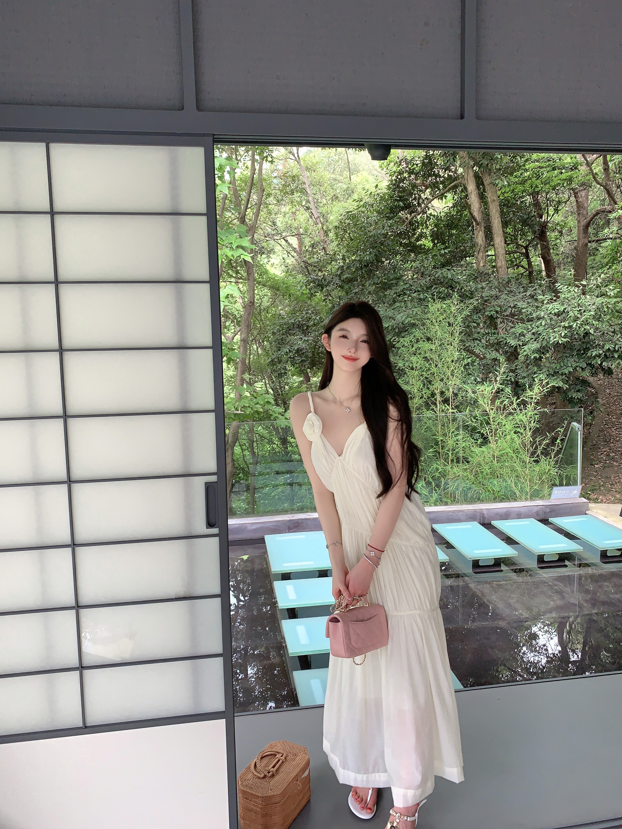 화이트 V넥 실크 주름 슬립 드레스 롱 코트 무릎 아래 민소매 오프숄더 요정 치마