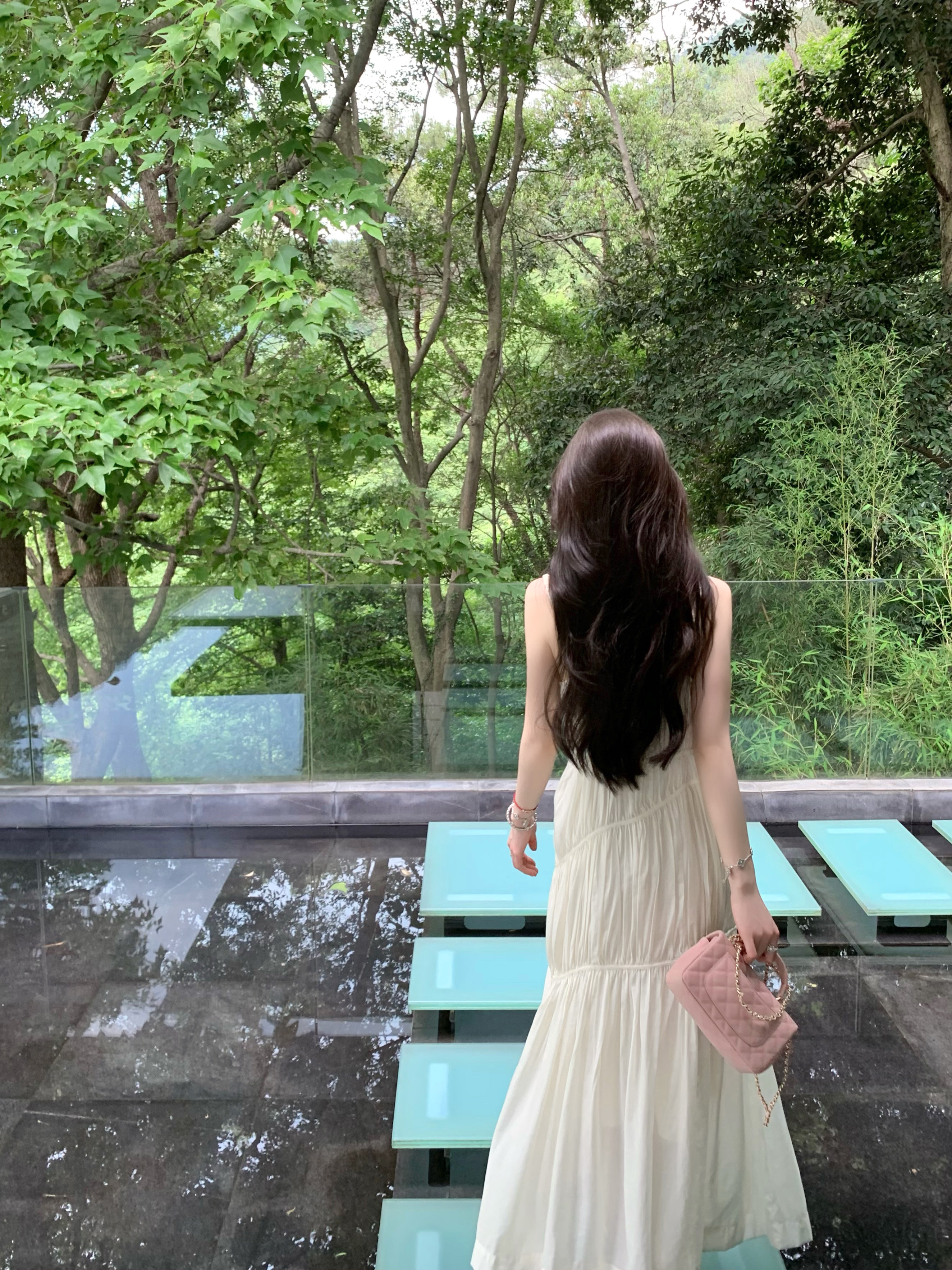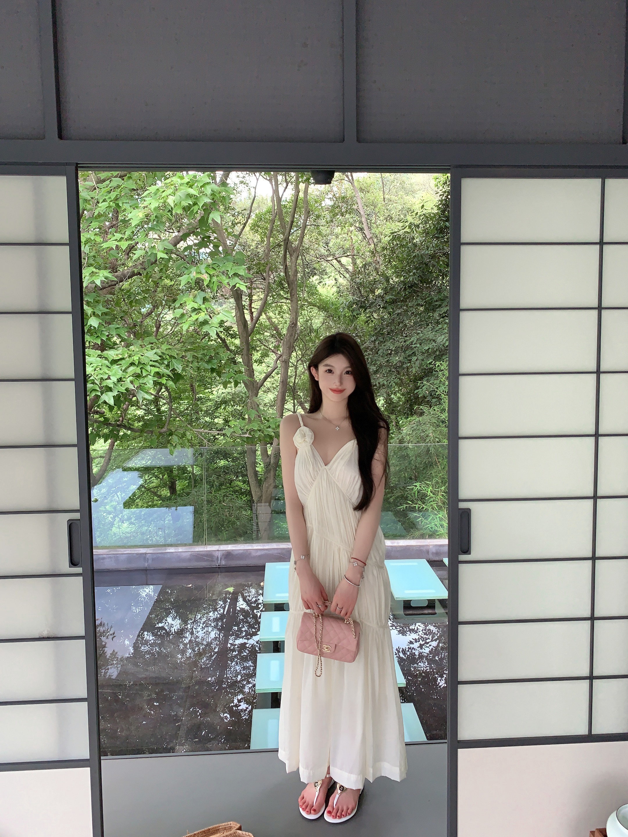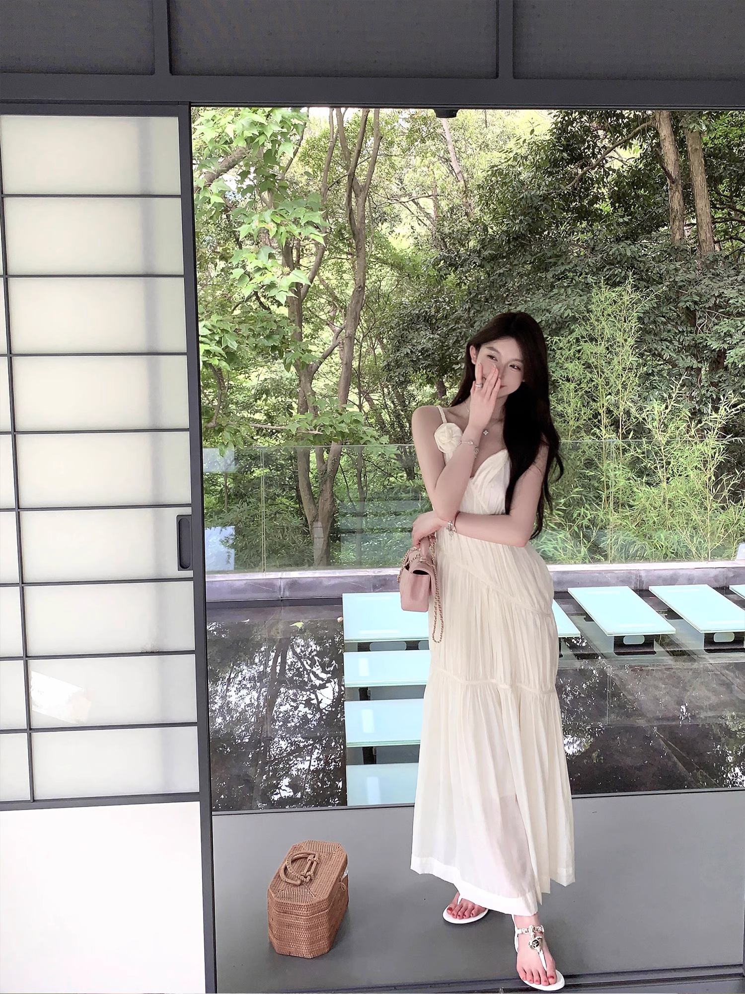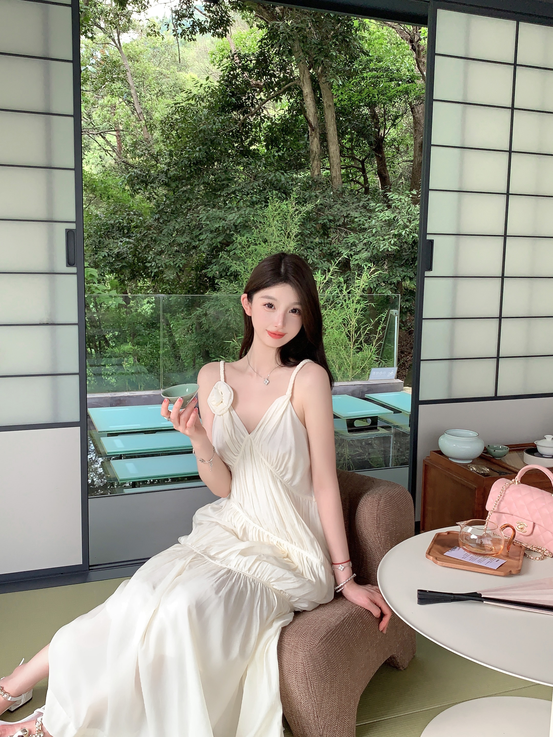 화이트 V넥 실크 주름 슬립 드레스 롱 코트 무릎 아래 민소매 오프숄더 요정 치마