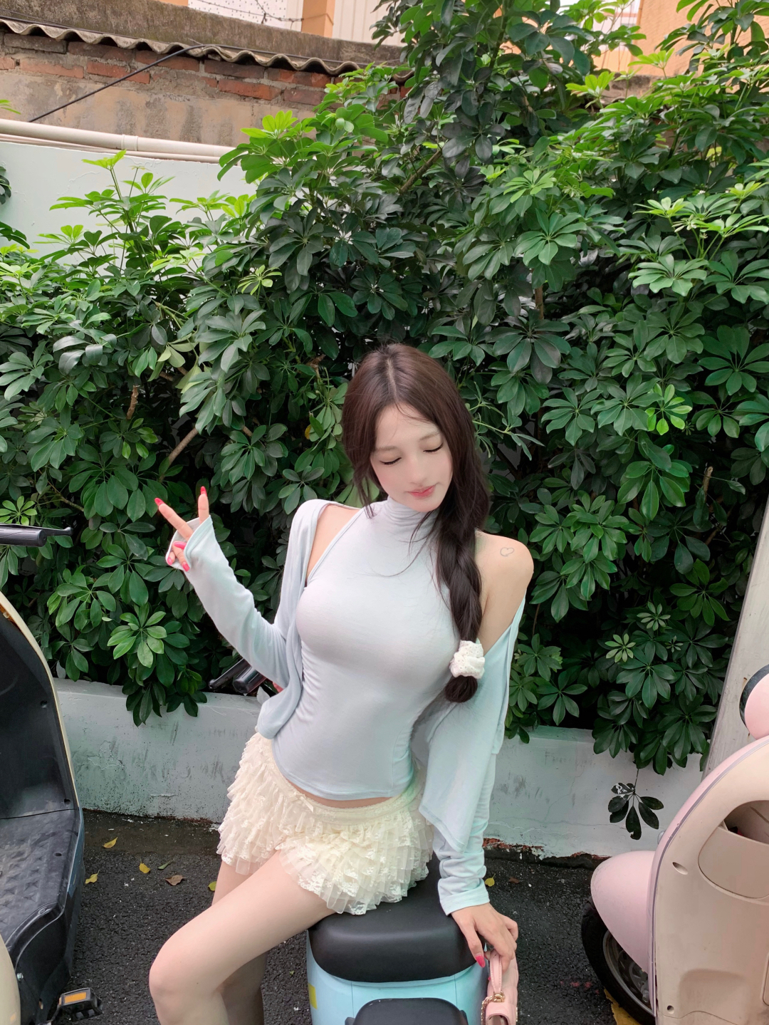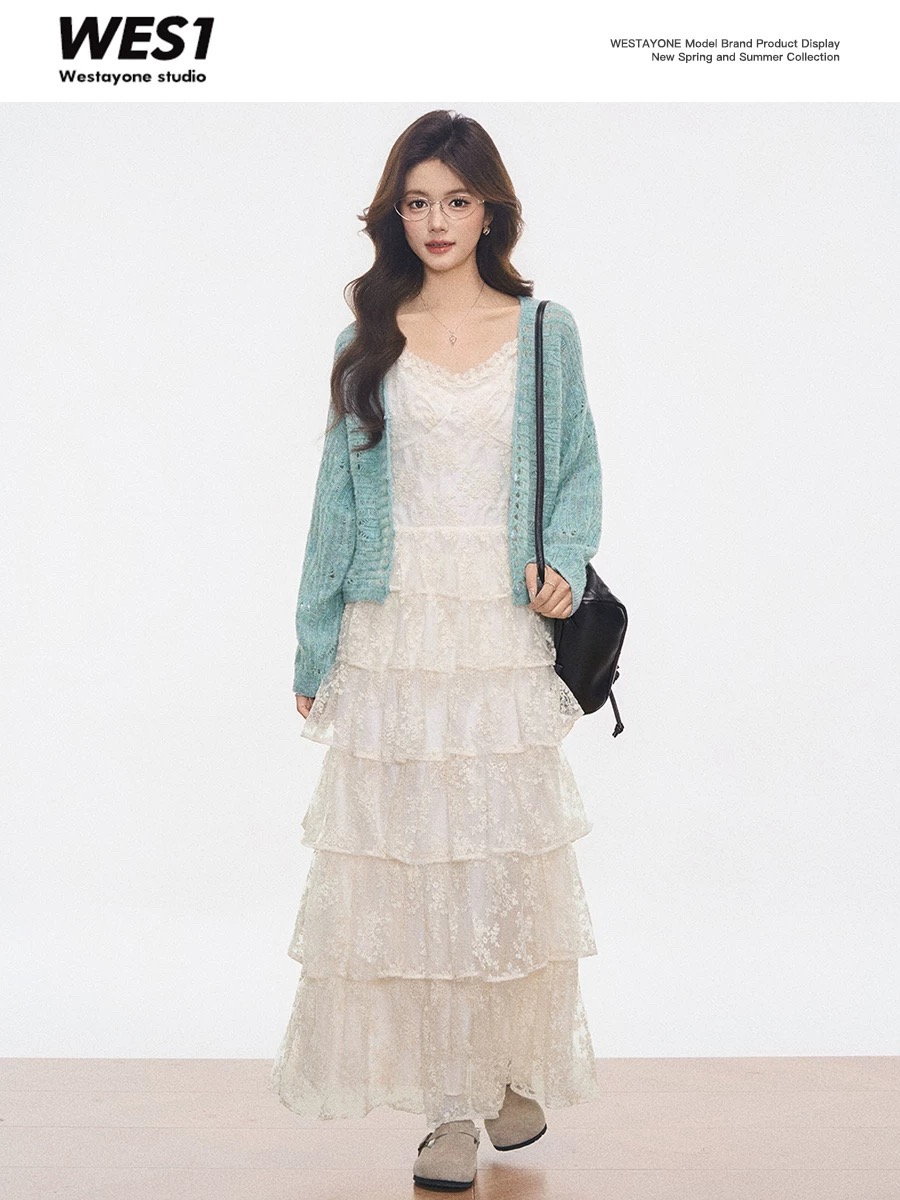 실사 정가 행침 목 터틀넥 조끼 긍정적 인 어깨 오픈 가디건 무거운 작업 계단식 홀로우 아웃 레이스 케이크 반바지