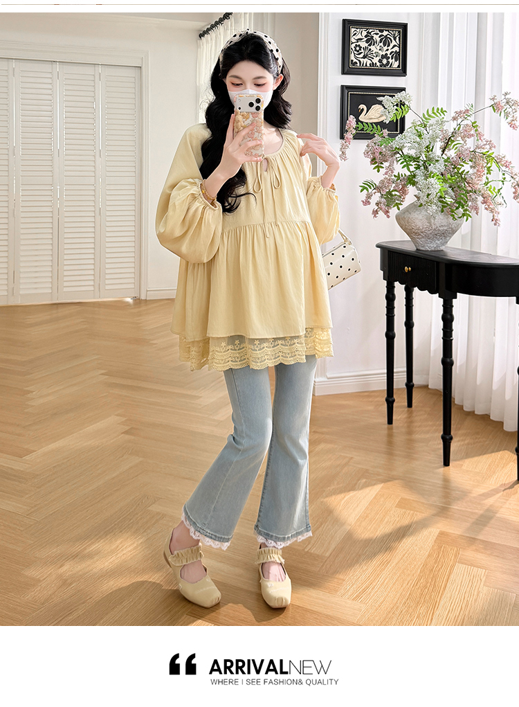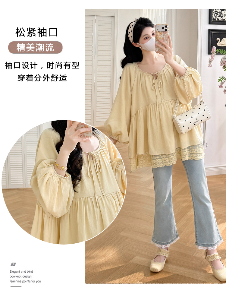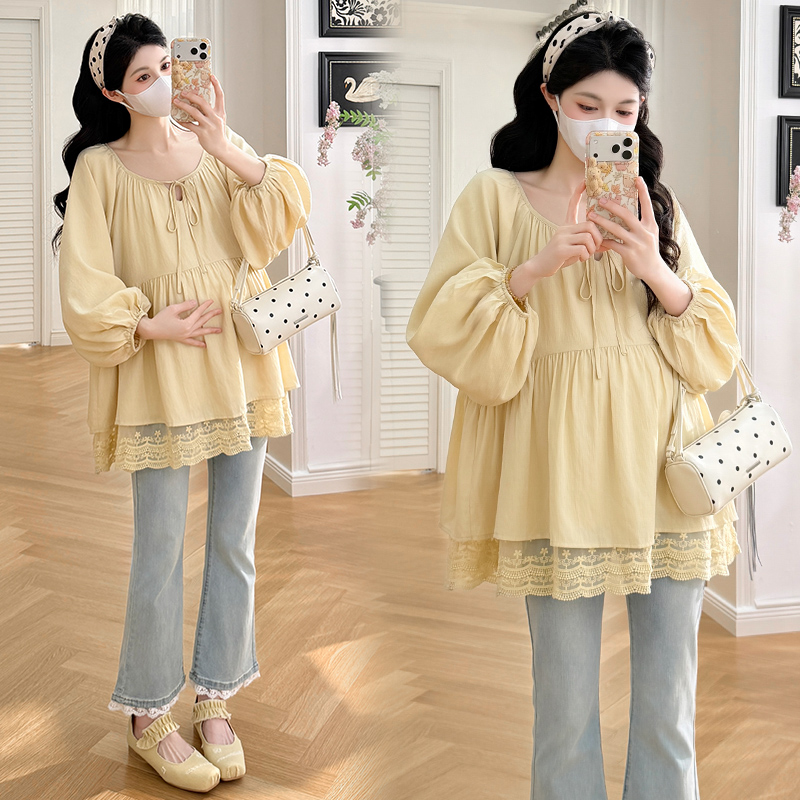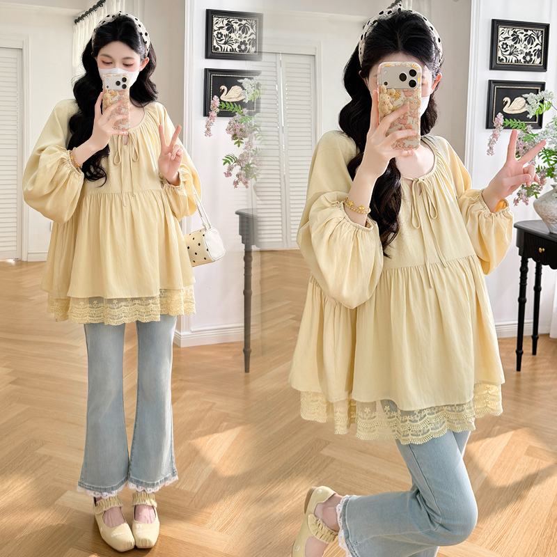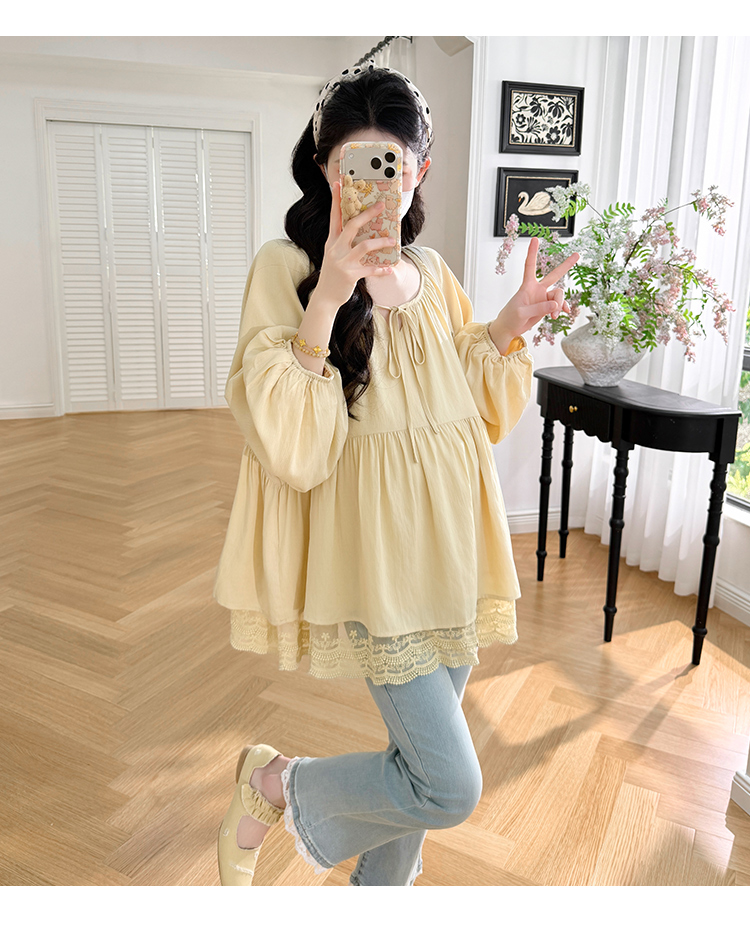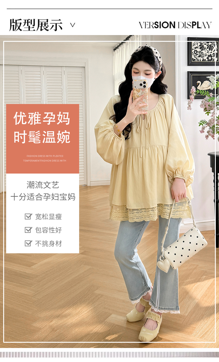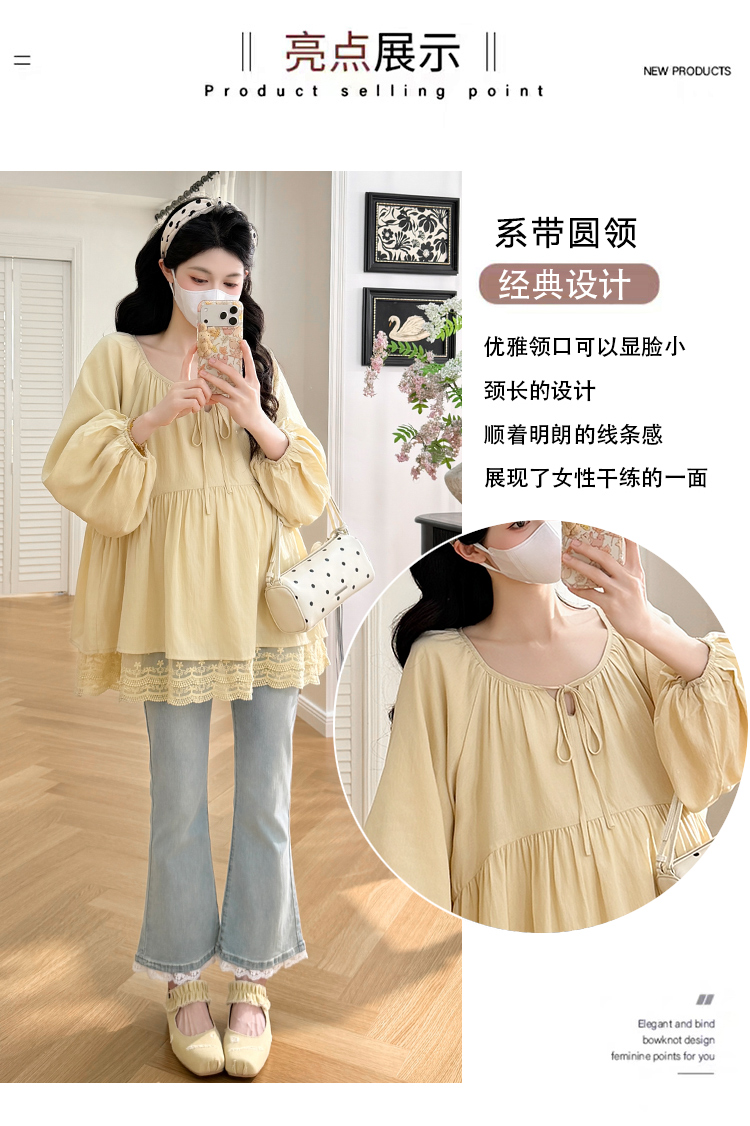 실사 봄 드레스 새로운 프랑스식 스트랩 라운드 넥 루즈핏 인형 셔츠 임산부 맨위