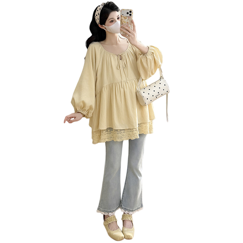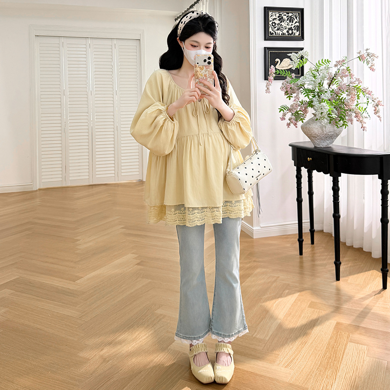 가을 의상 새로운 느긋한 바람 몸매 가꾸기 슬림해 보이는 펌프 로프 와이드 레그 팬츠 임산부 세트 3종 세트