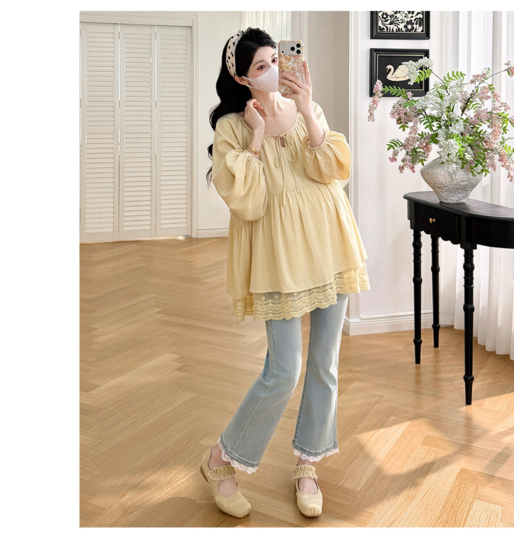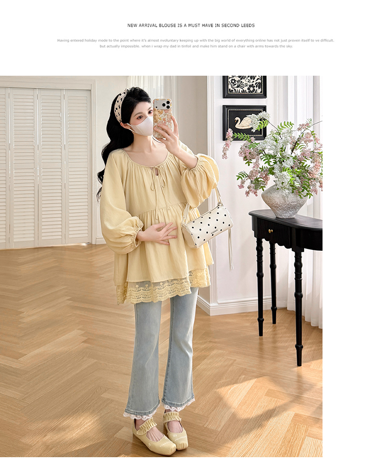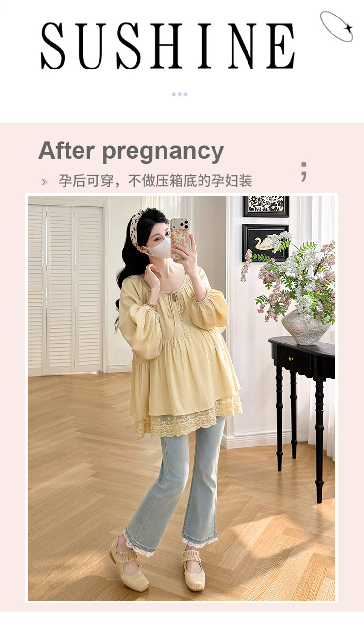 실사 새로운 느긋한 바람 몸매 가꾸기 슬림해 보이는 펌프 로프 와이드 레그 팬츠 임산부 세트 3종 세트