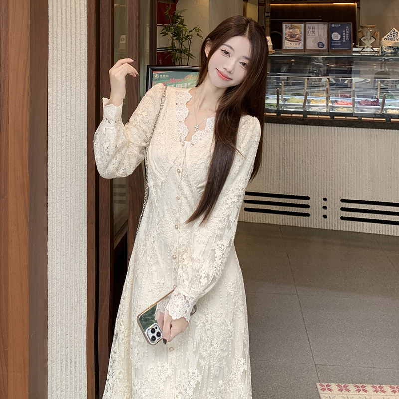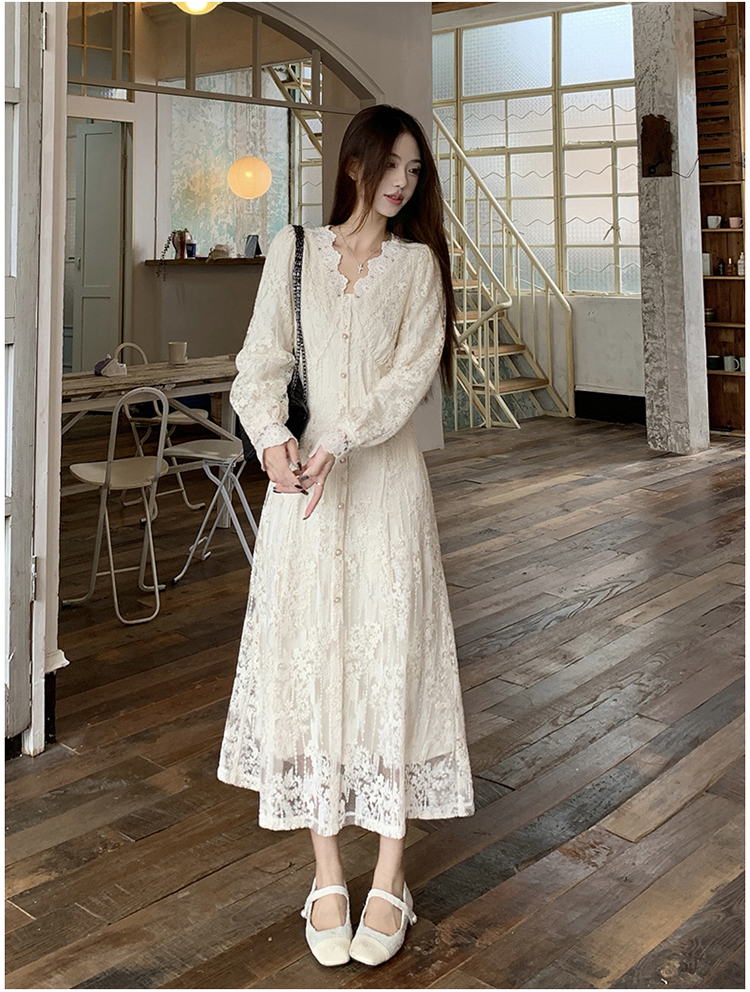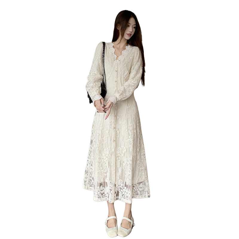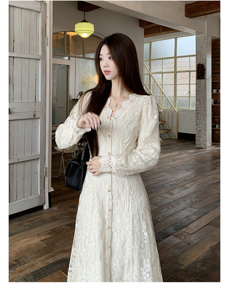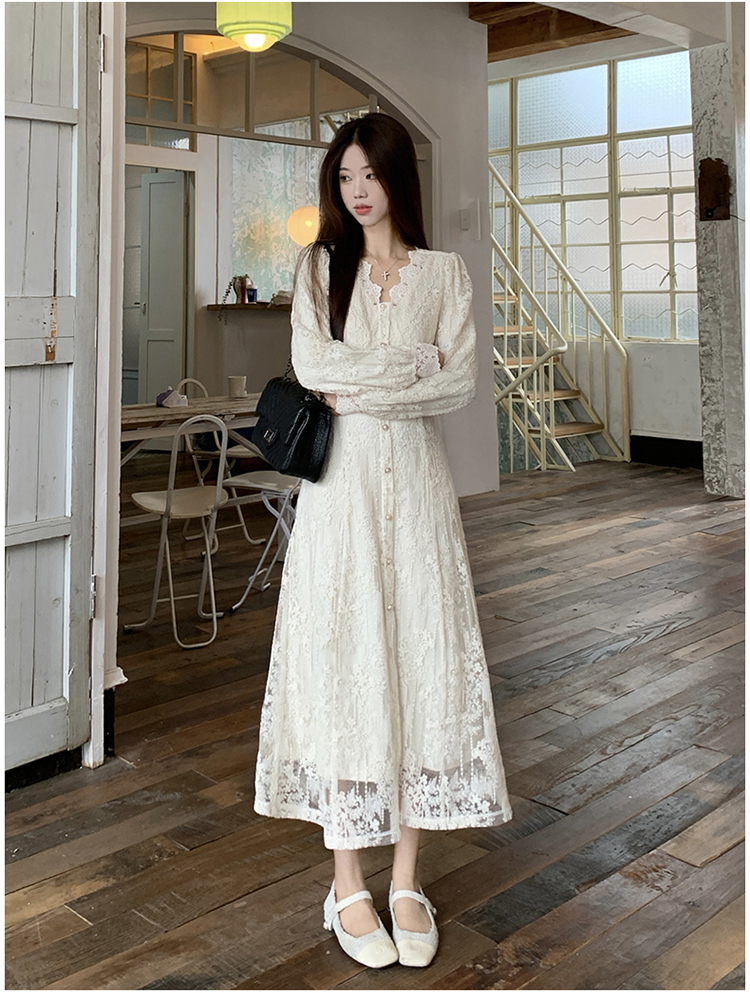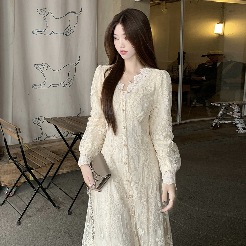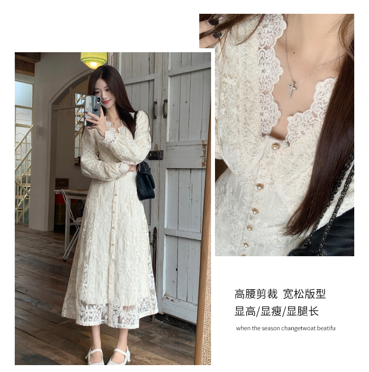 실사 가을 프랑스식 고급 센스 V넥 긴팔 드레스 2026 이른 봄 새로운 아름다운 치마 허리 수축 롱 스커트