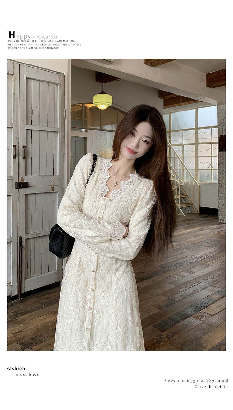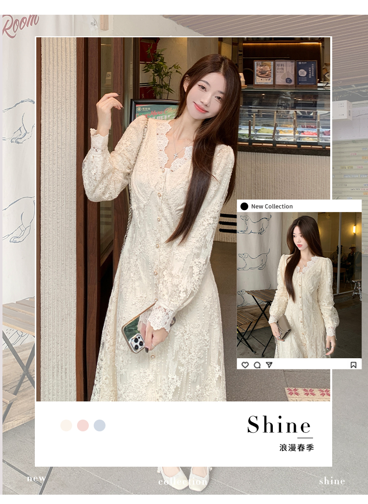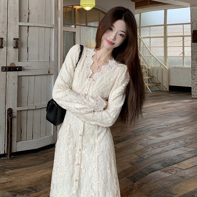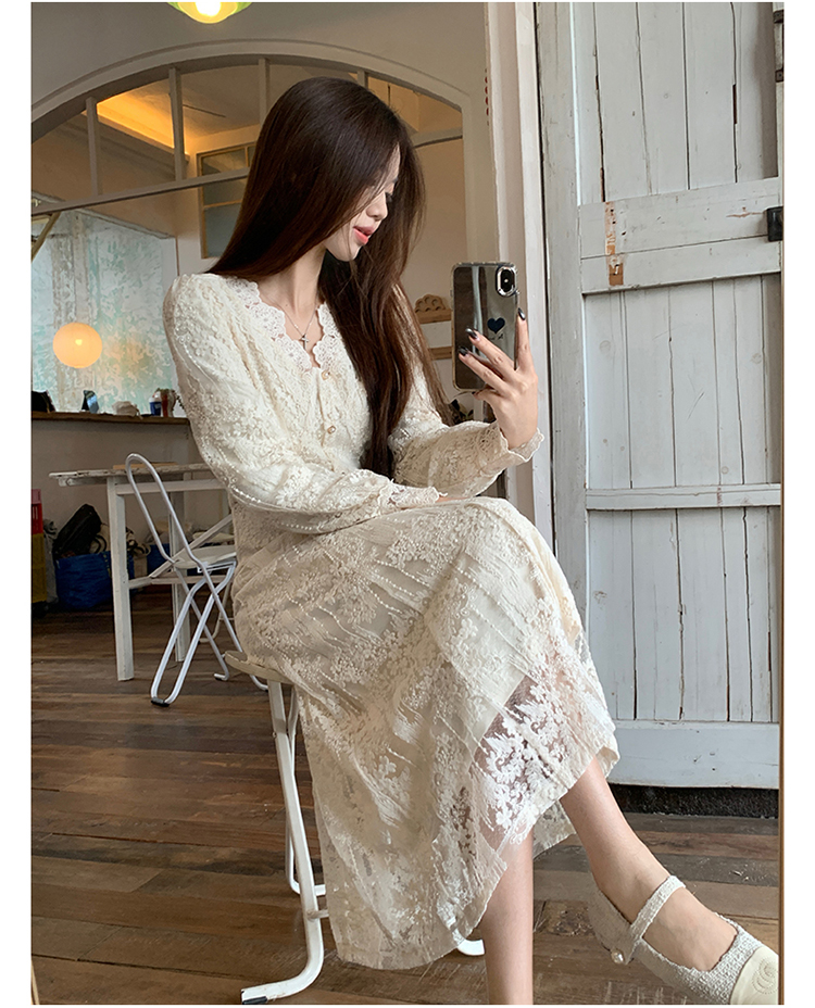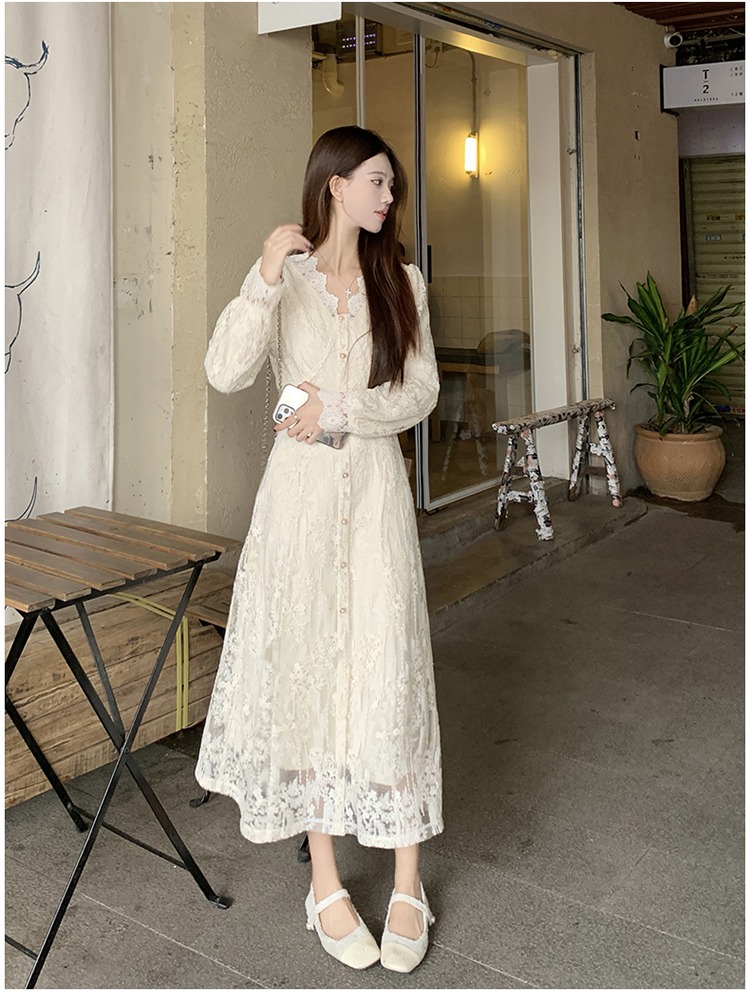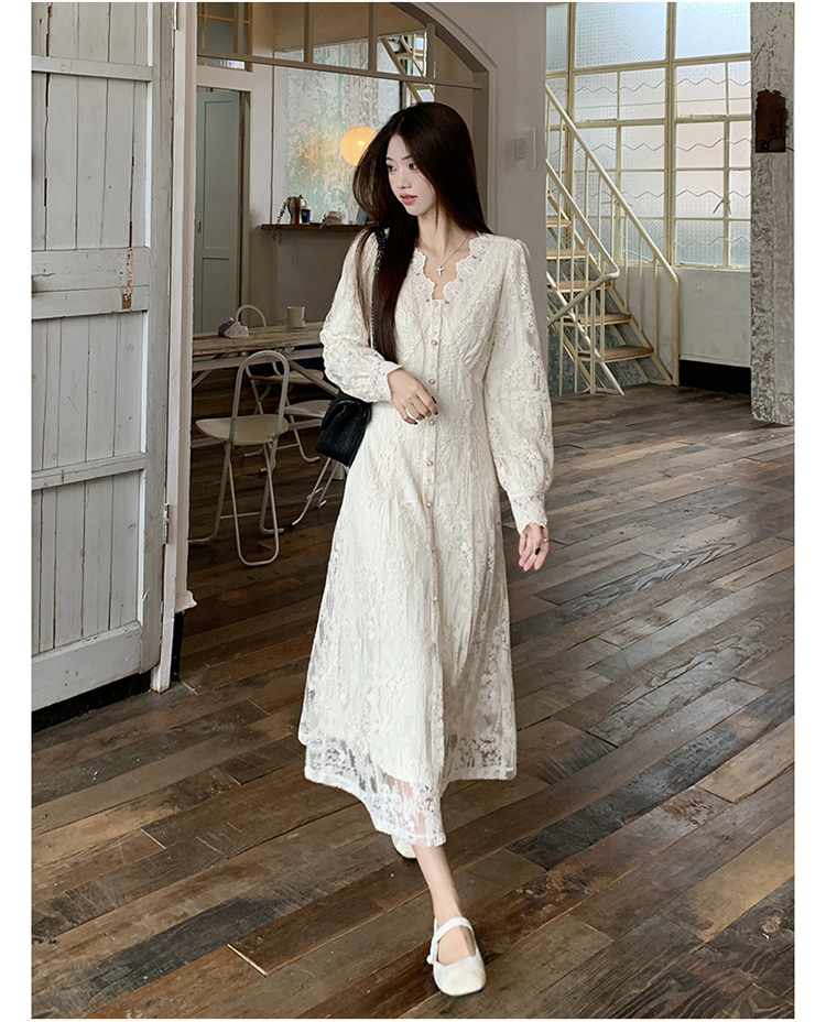 실사 가을 프랑스식 고급 센스 V넥 긴팔 드레스 2026 이른 봄 새로운 아름다운 치마 허리 수축 롱 스커트