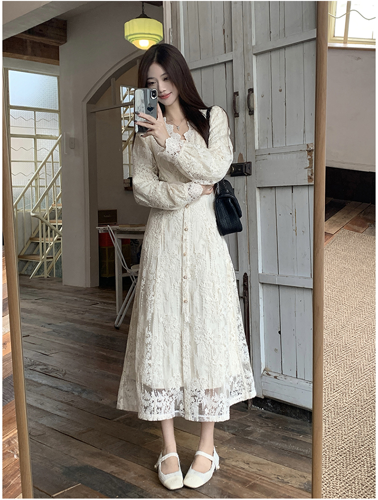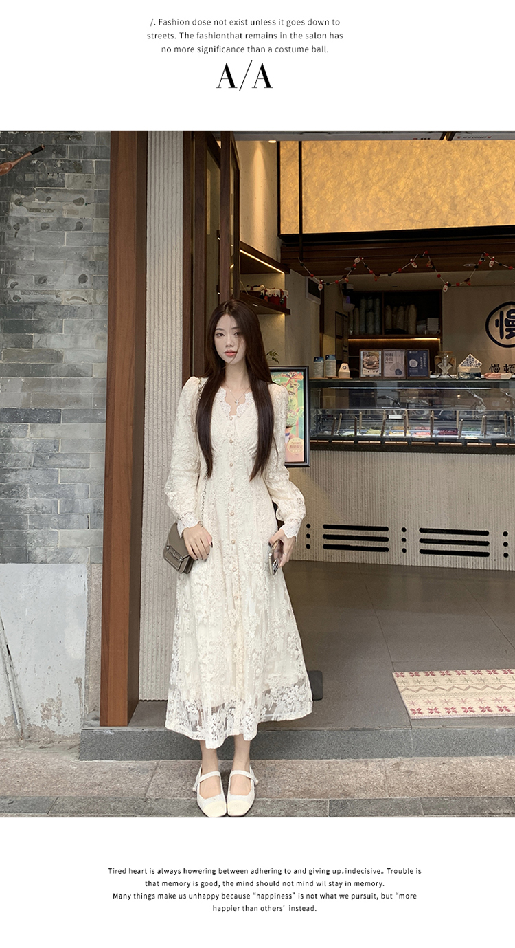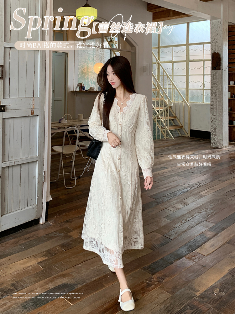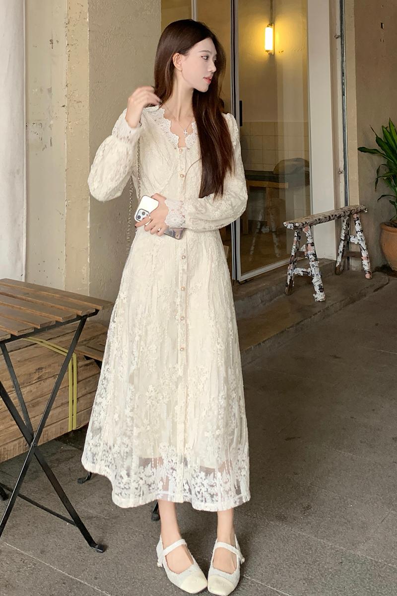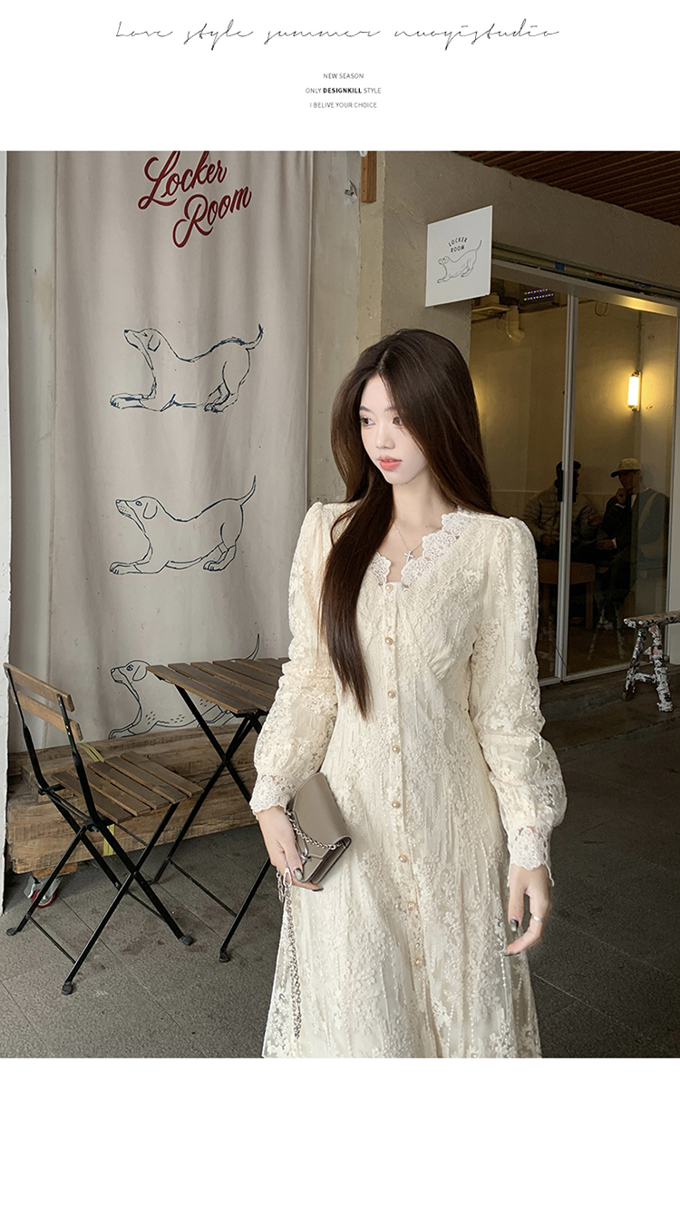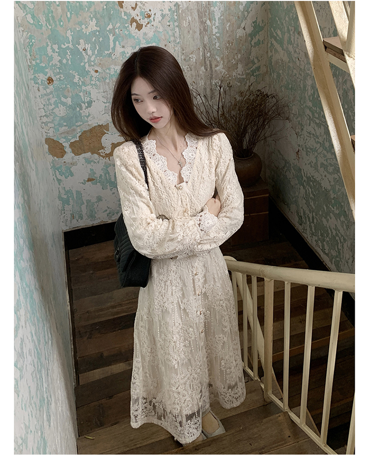 실사 가을 프랑스식 고급 센스 V넥 긴팔 드레스 2026 이른 봄 새로운 아름다운 치마 허리 수축 롱 스커트