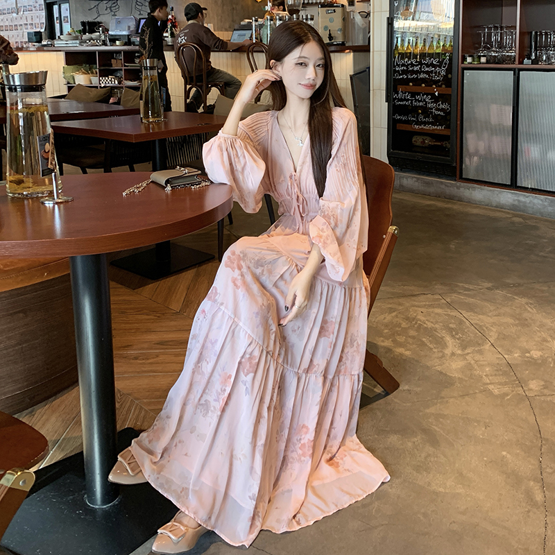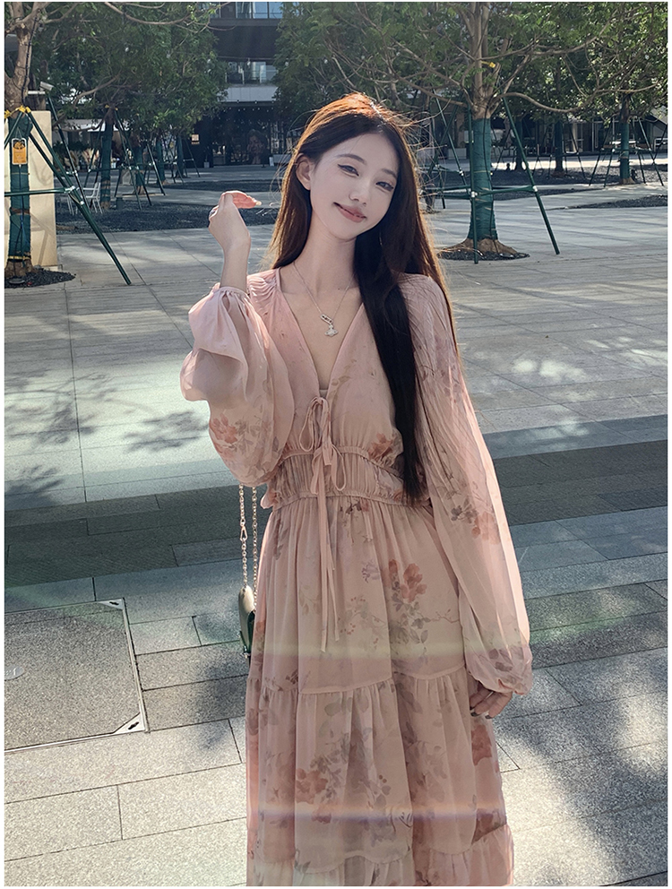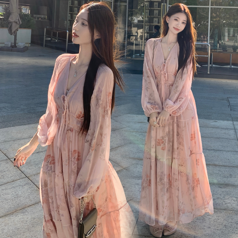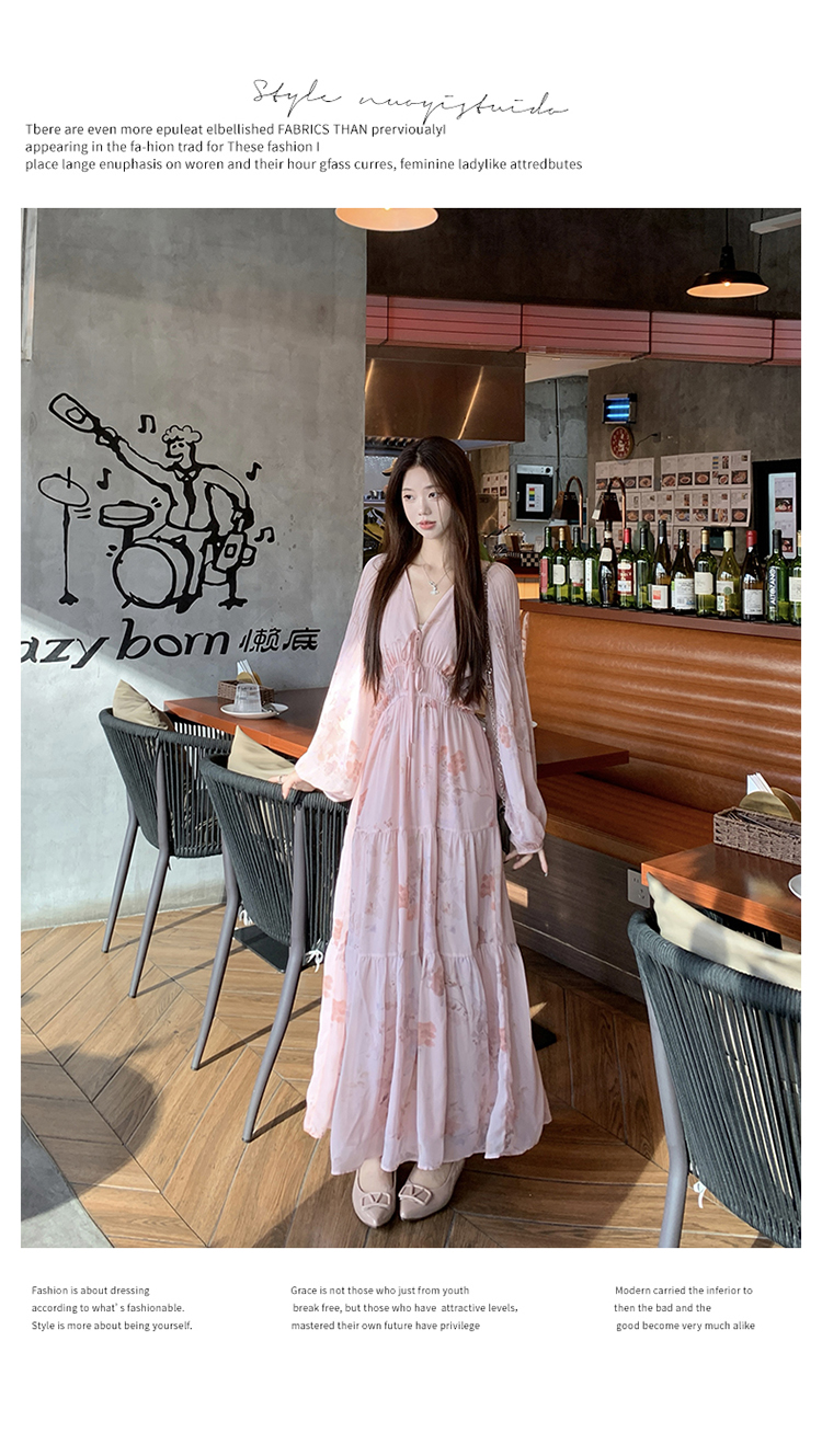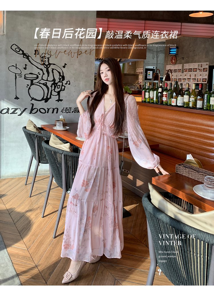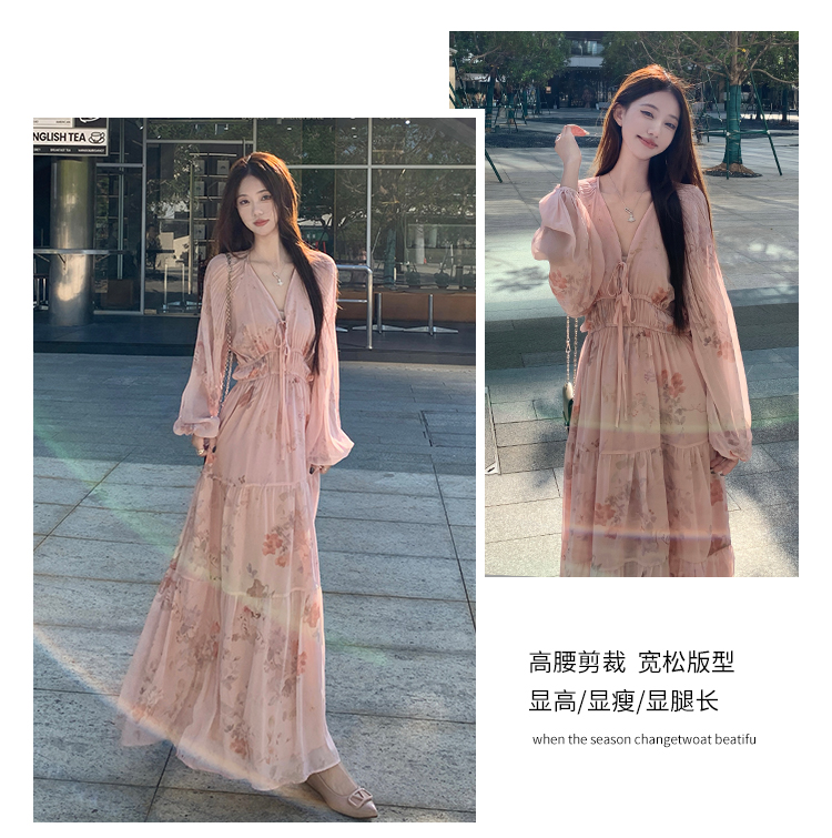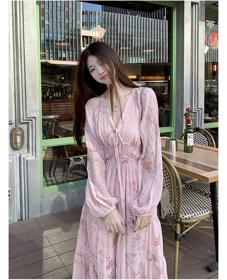실사 가을 프랑스식 고급 센스 V넥 긴팔 드레스 2026 이른 봄 새로운 아름다운 치마 허리 수축 롱 스커트