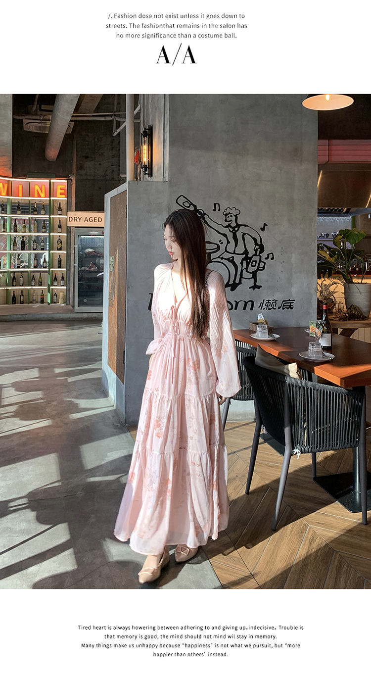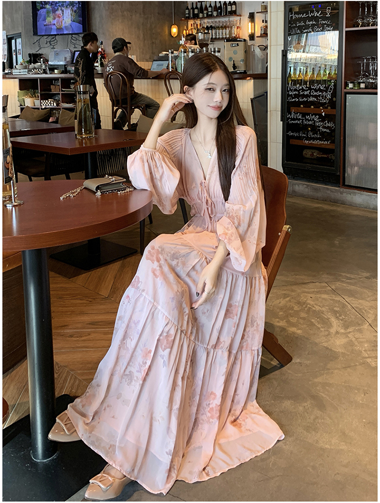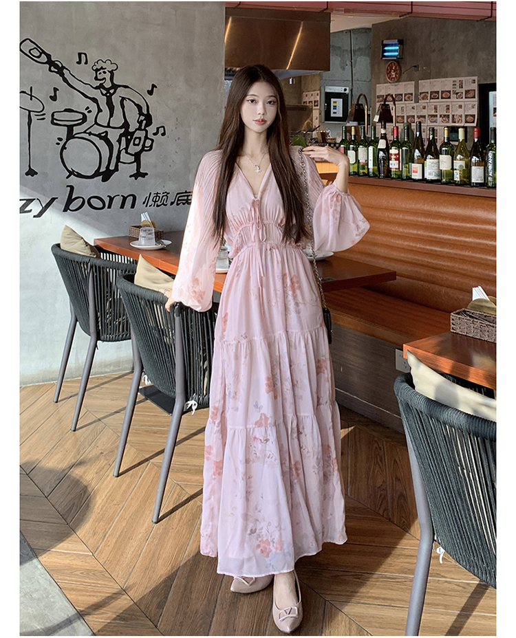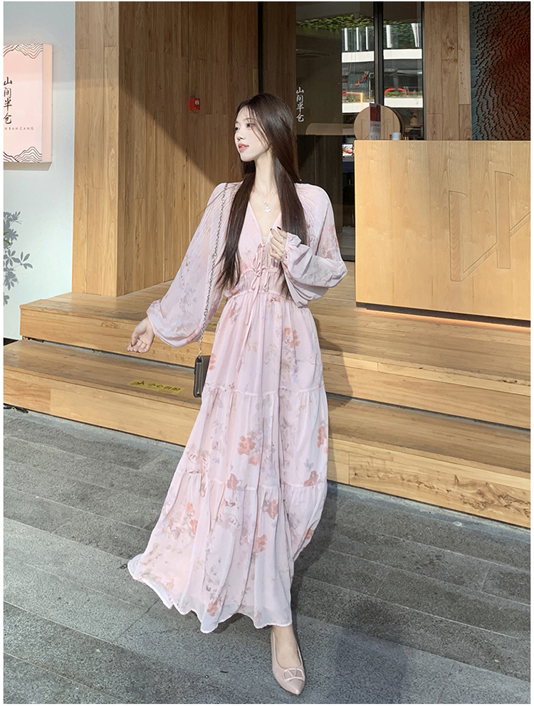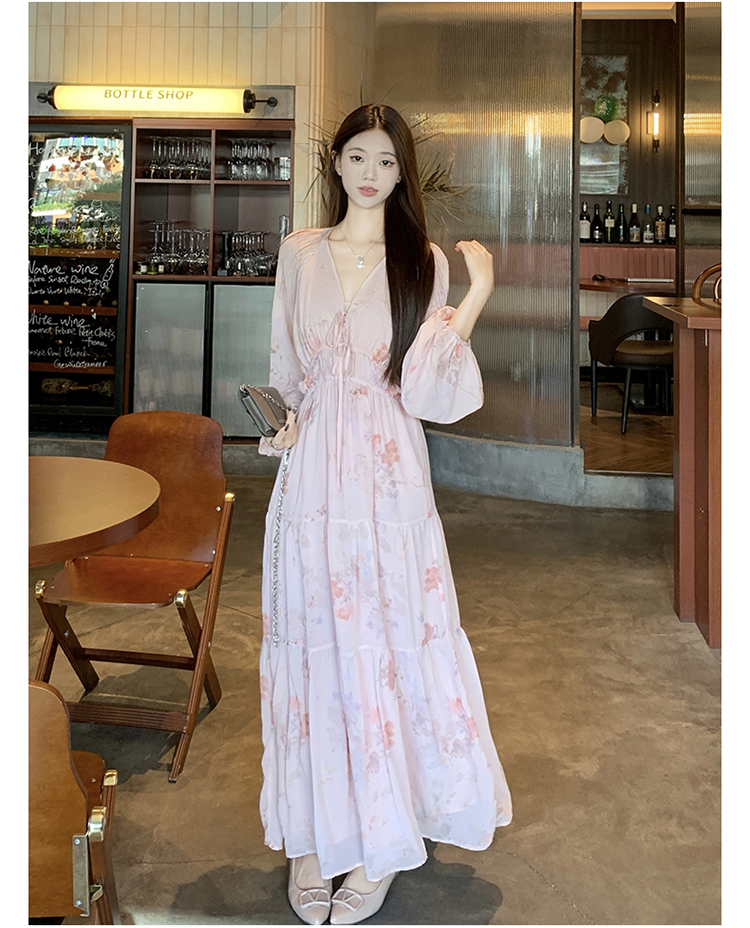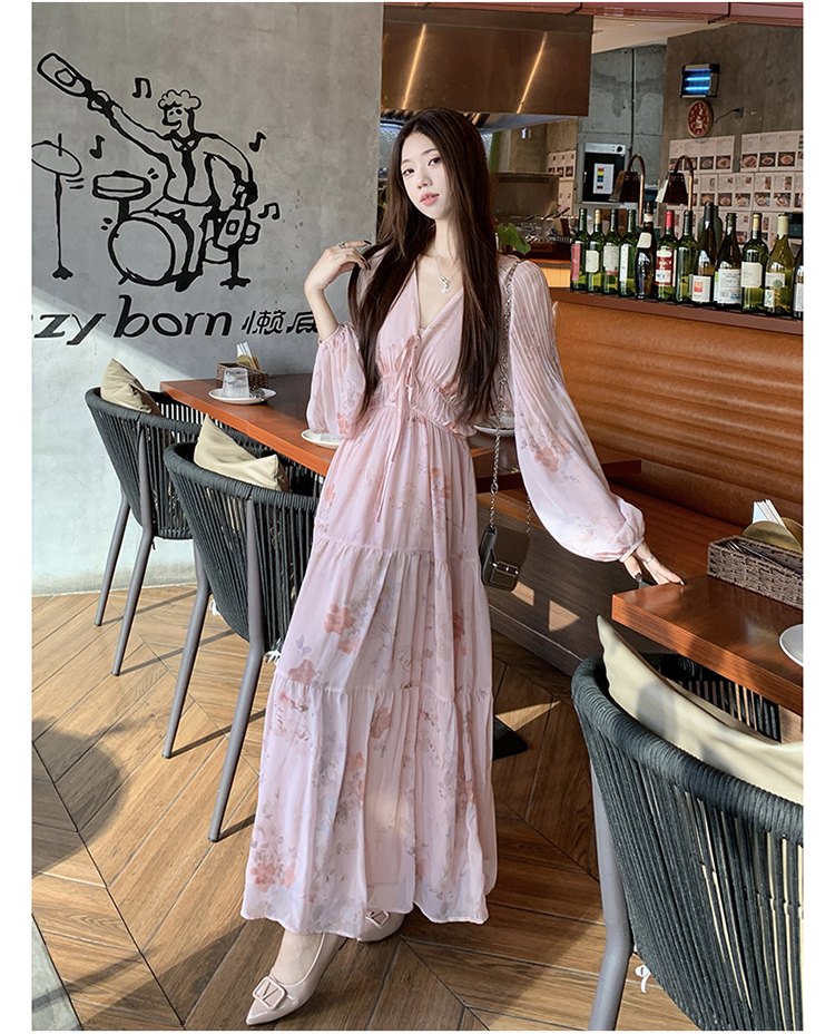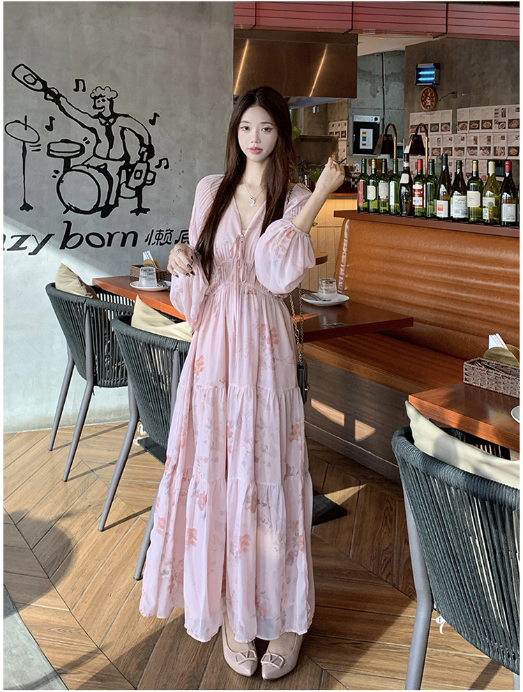 실사 가을 프랑스식 고급 센스 V넥 긴팔 드레스 2026 이른 봄 새로운 아름다운 치마 허리 수축 롱 스커트
