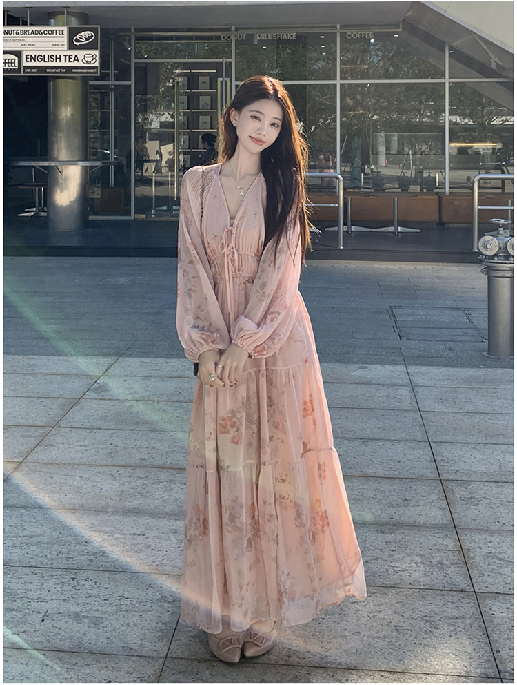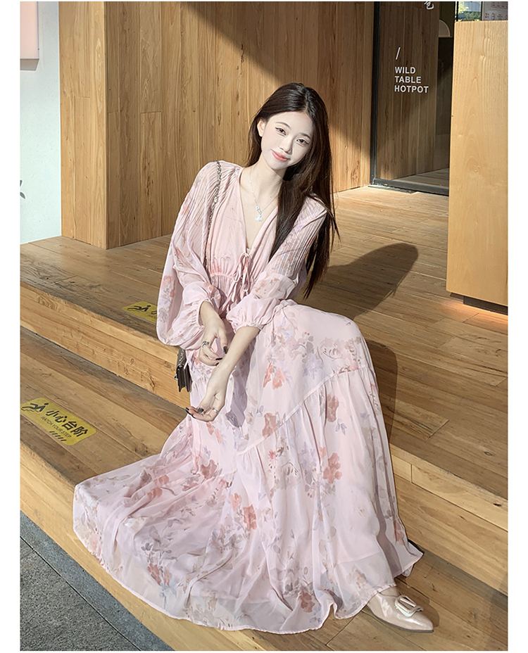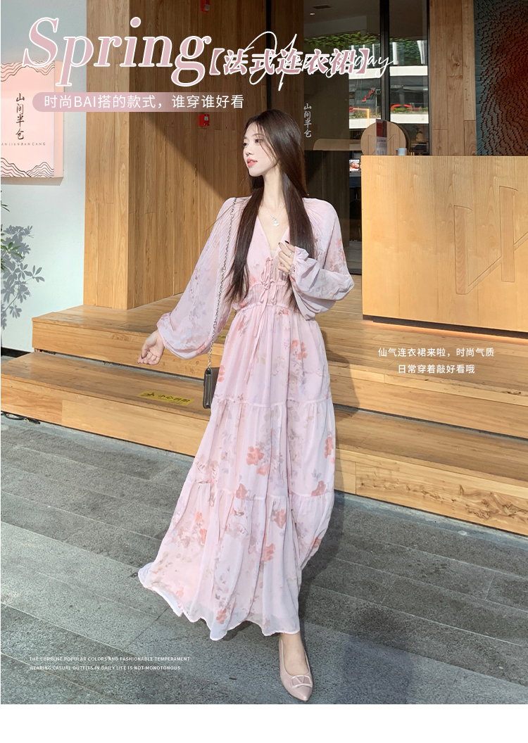 실사 핑크색 슈퍼 요정 달콤함 V넥 여성 드레스 중간 길이 2026 봄 새로운 프랑스식 빅 사이즈 꽃무늬 치마