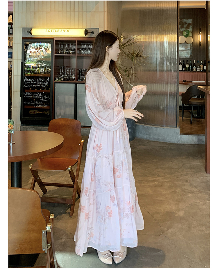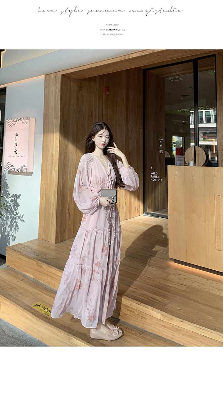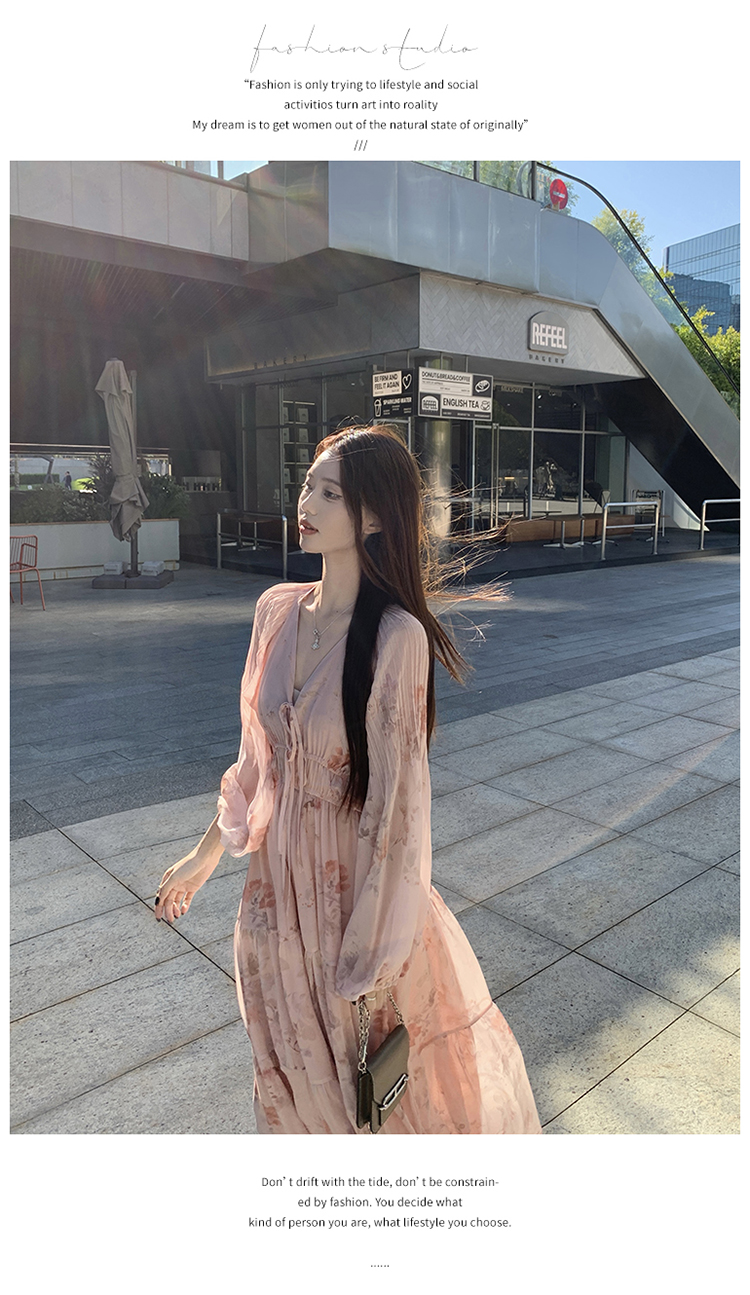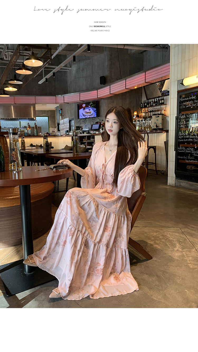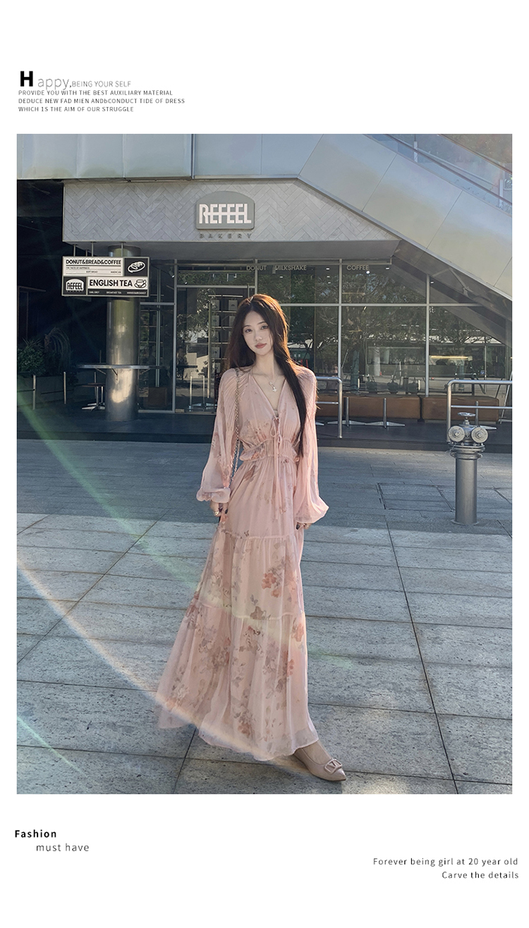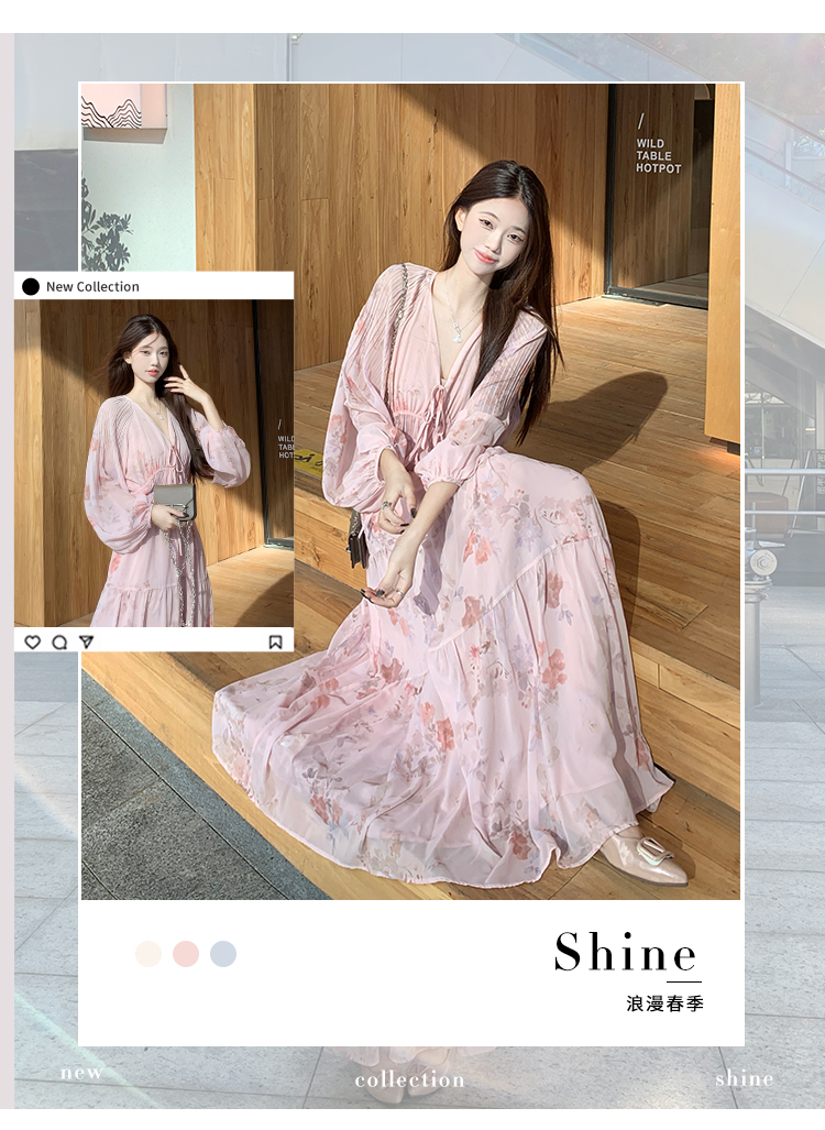 실사 봄 새로운 프랑스식 V넥 주간 실크 꽃무늬 드레스 허리 수축 연꽃 잎 소매 프린트 롱 스커트 빅 사이즈 여성 의류