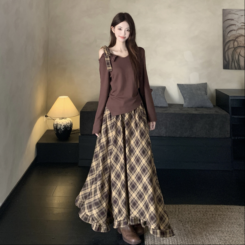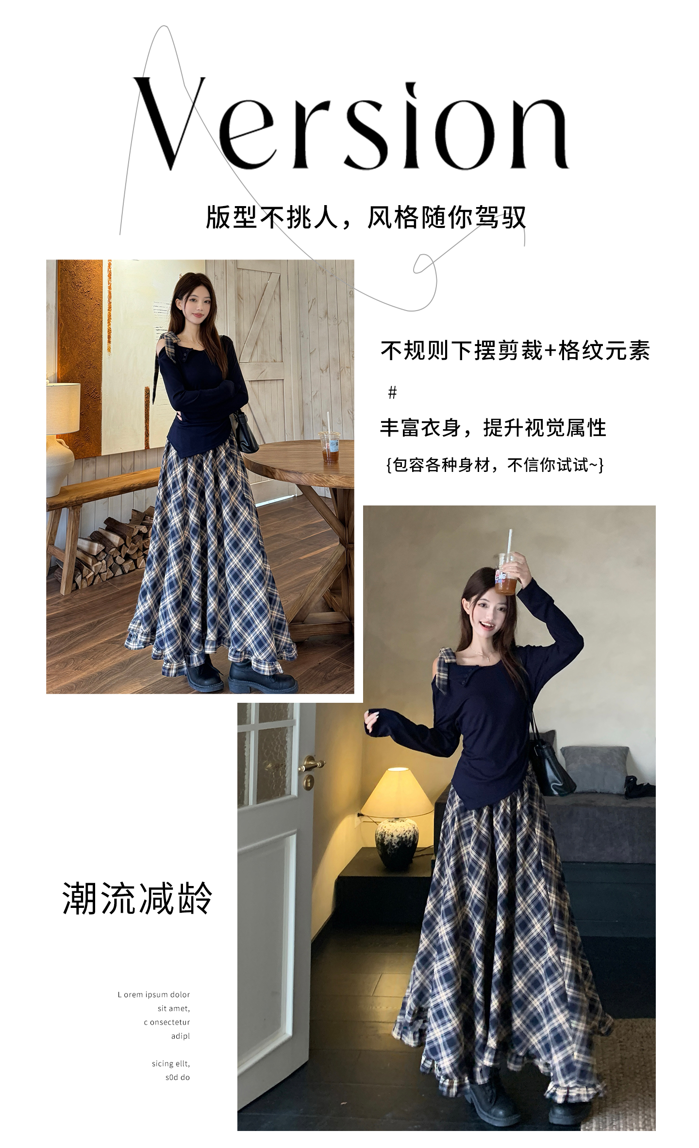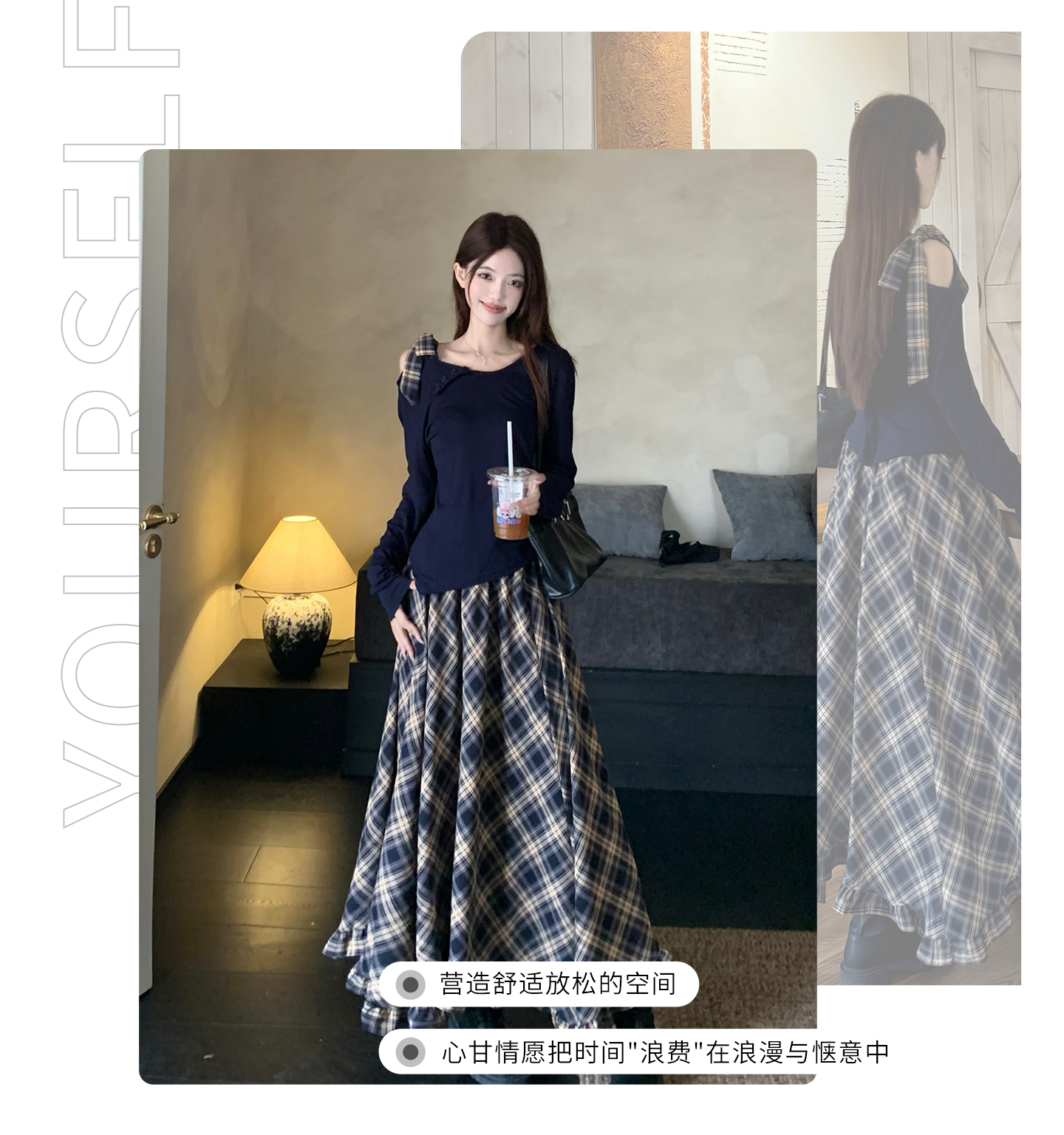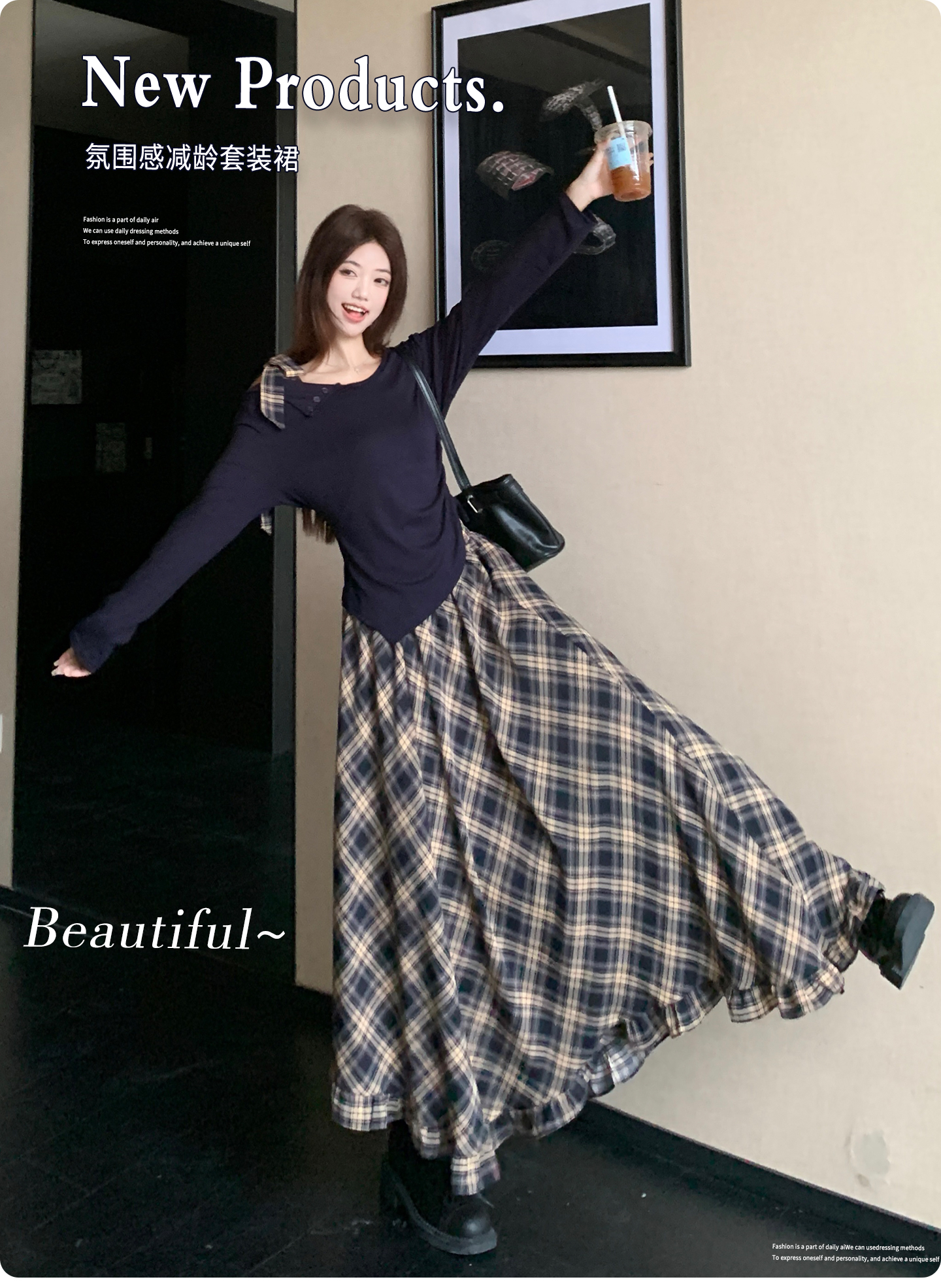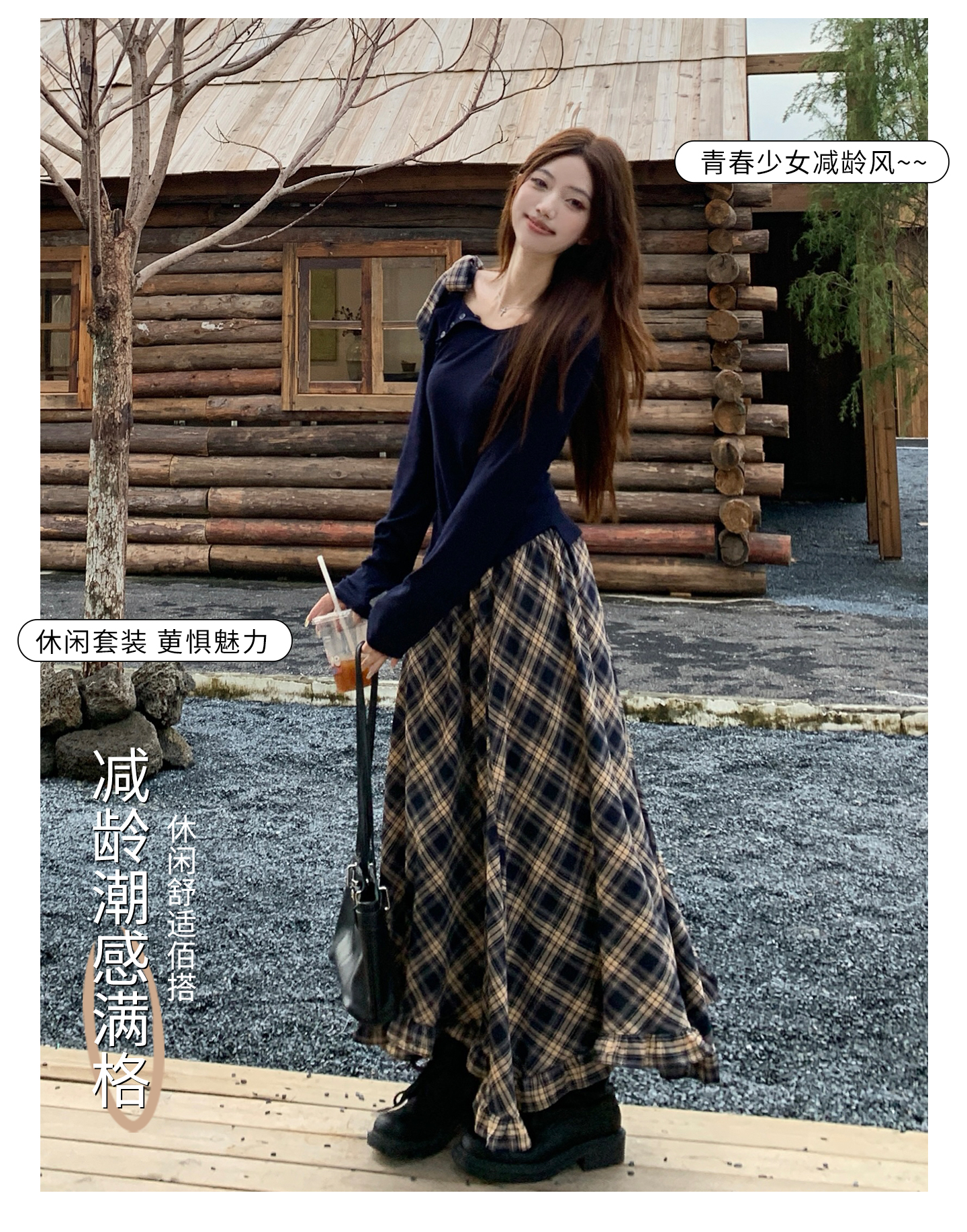 실사 2026 봄 빅 사이즈 여성 의류 레트로 투피스 세트 체크무늬 드레스 표지 배 슬림해 보이는 치마 A라인 스커트