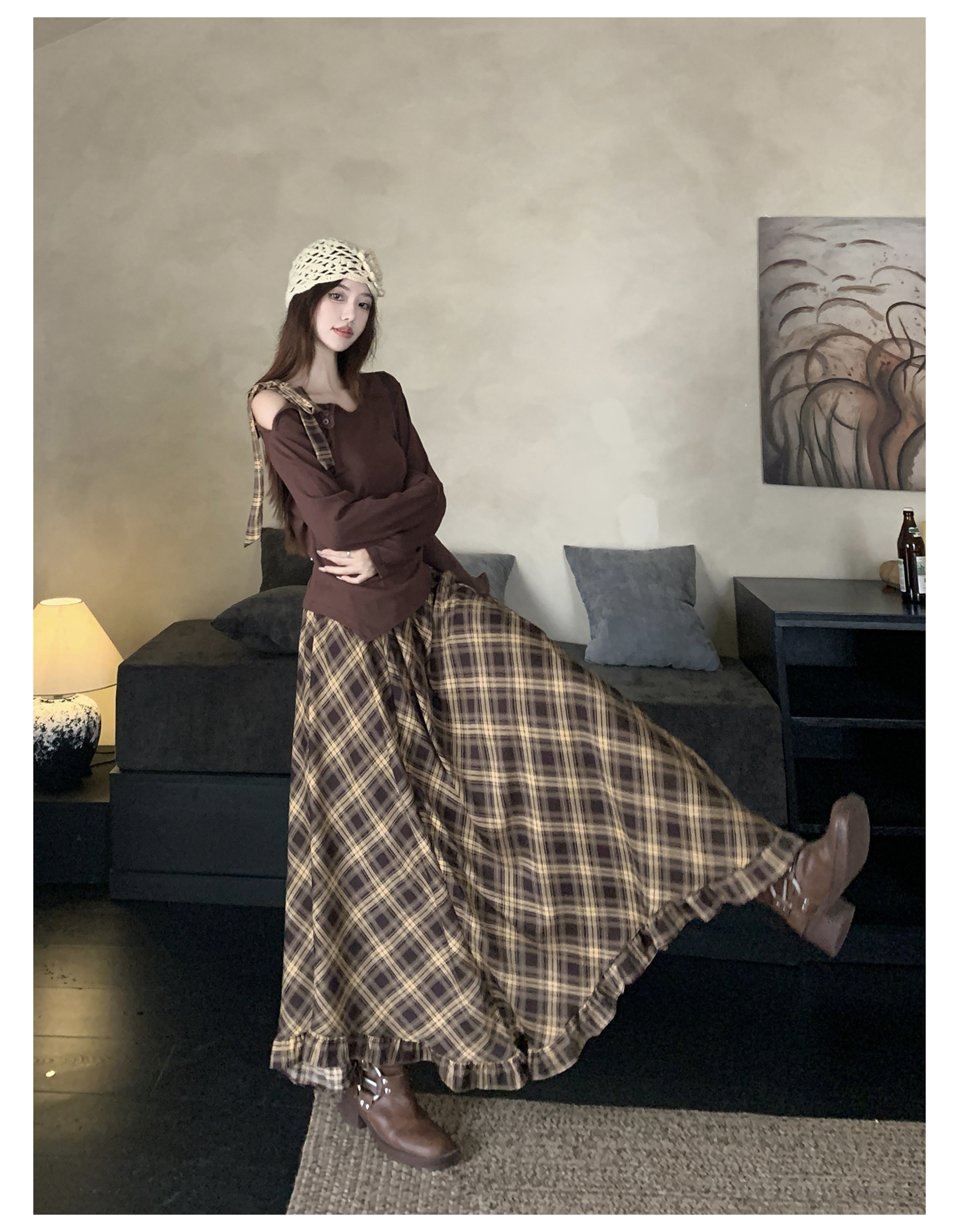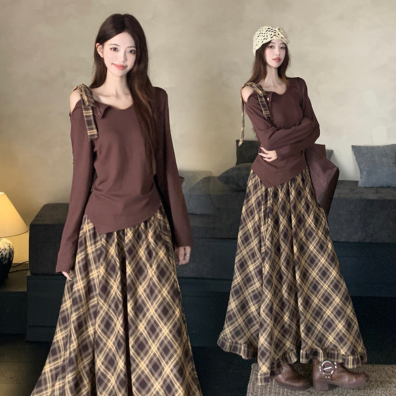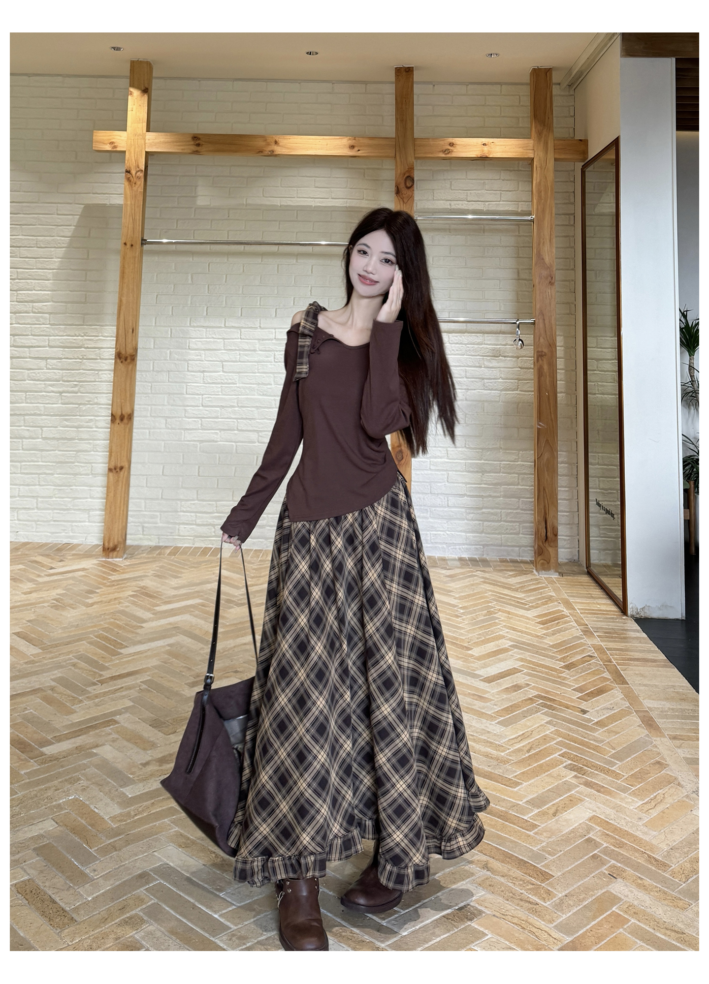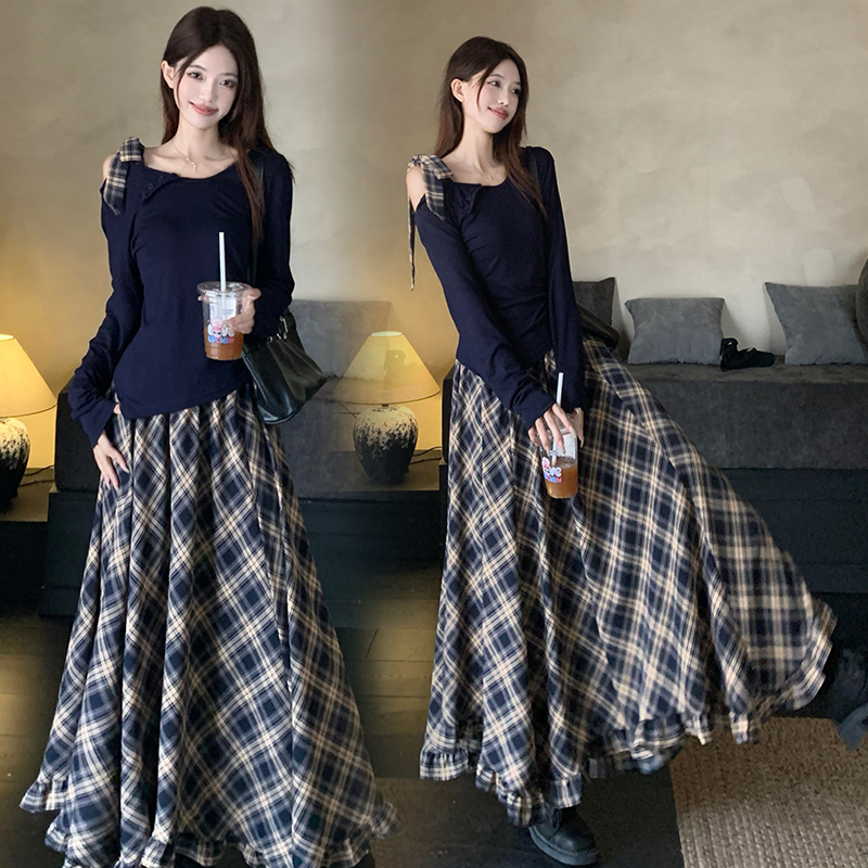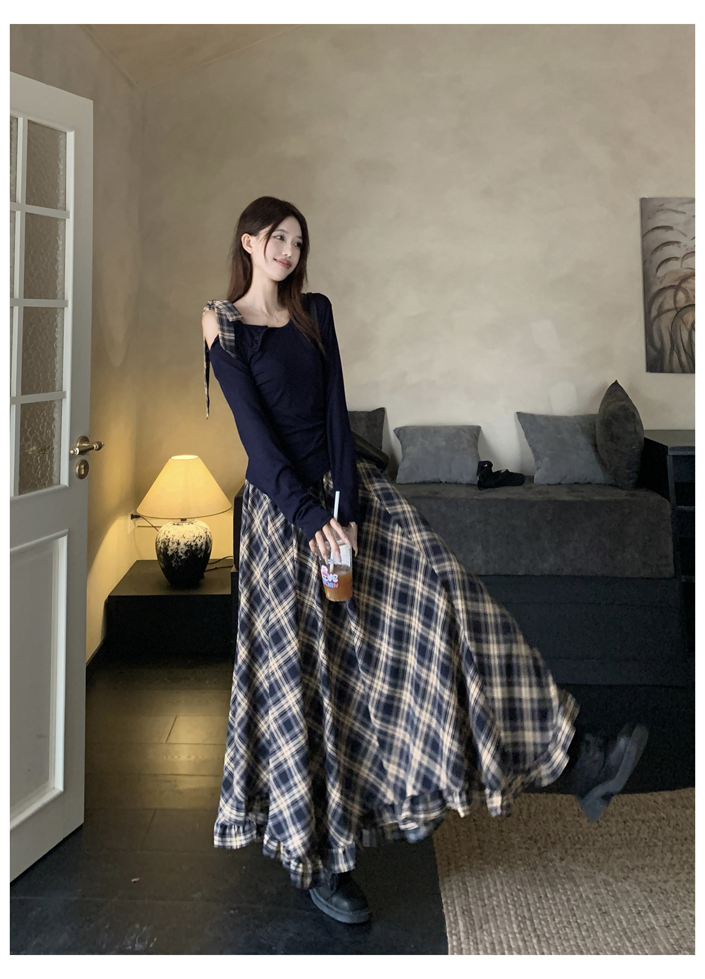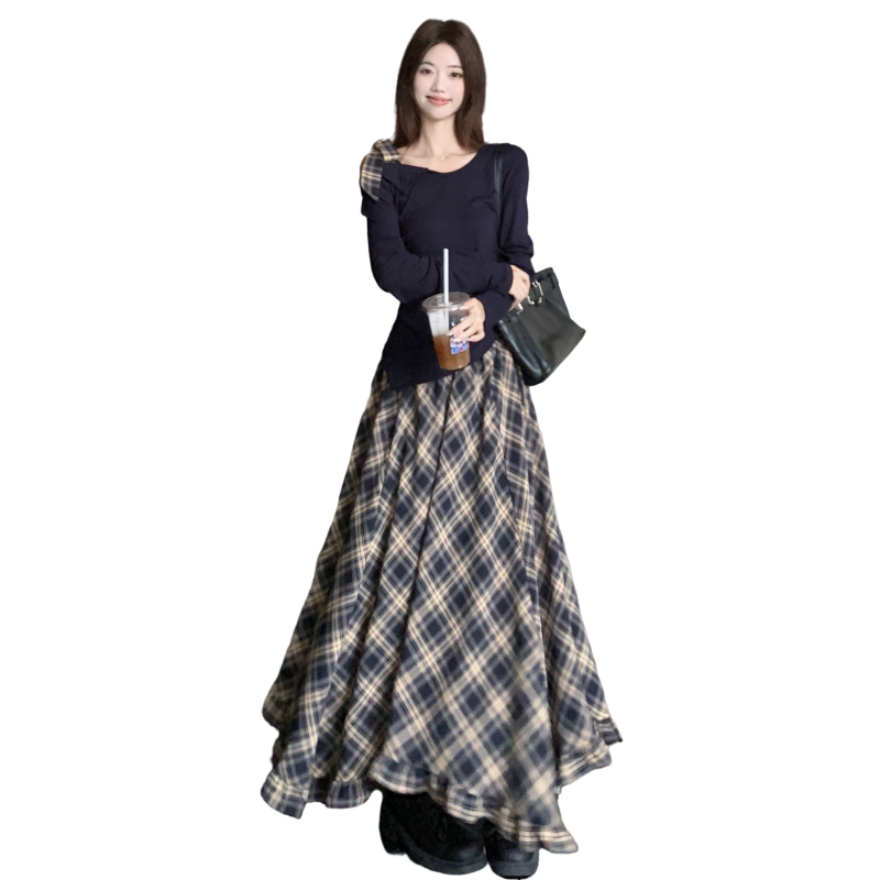 실사 2026 봄 빅 사이즈 여성 의류 레트로 투피스 세트 체크무늬 드레스 표지 배 슬림해 보이는 치마 A라인 스커트