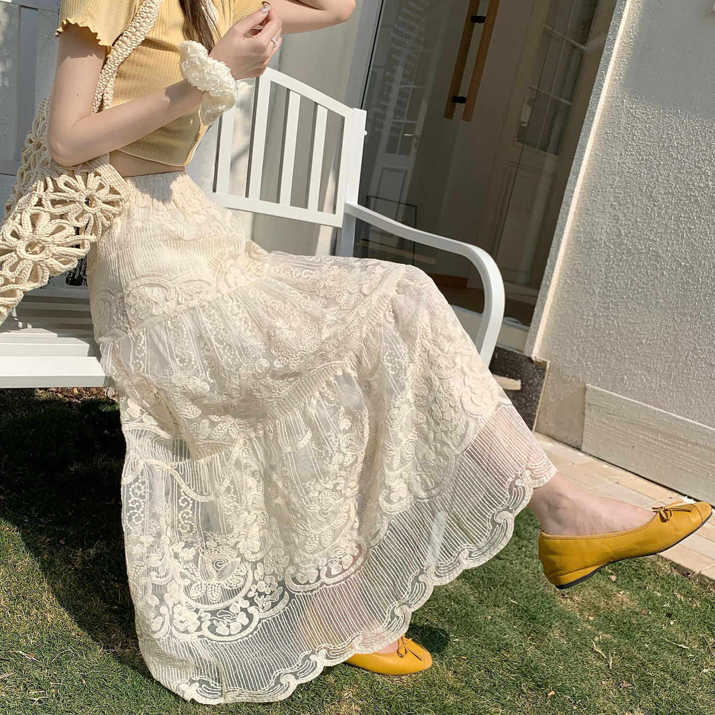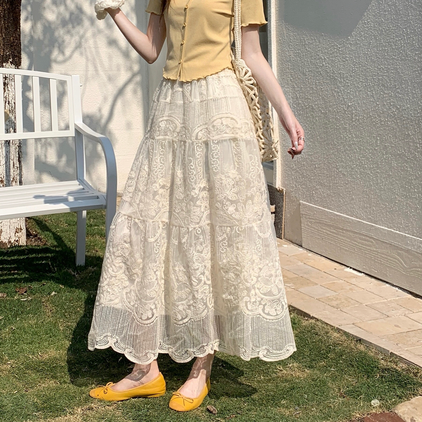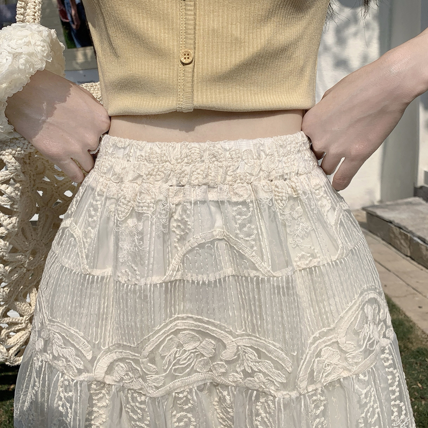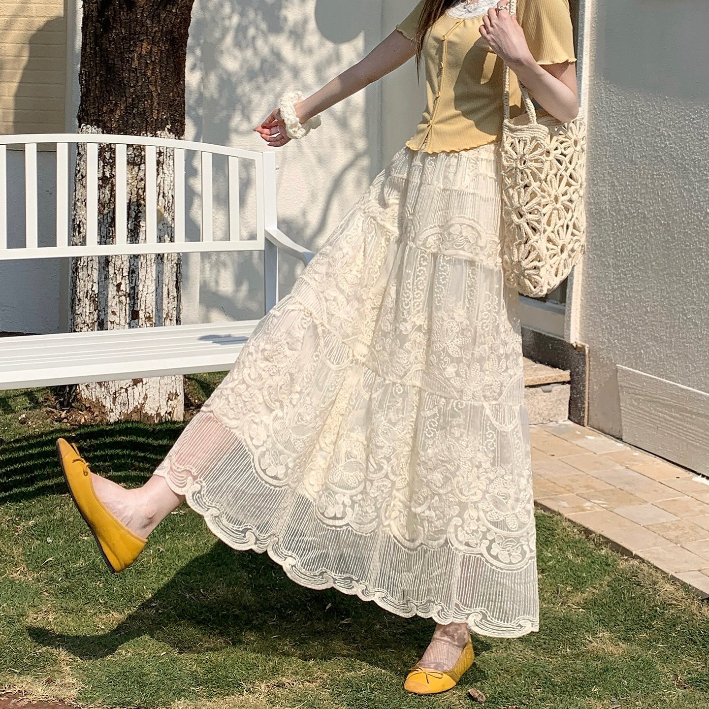 살구 색상 레이스 자수 반신 스커트 여성 봄 새로운 하이웨이스트 표지 넓적 다리 슬림해 보이는 중간 길이 A라인 스커트 퍼프 스커트