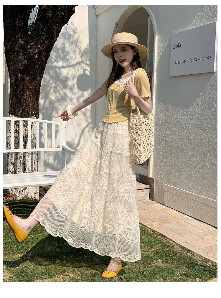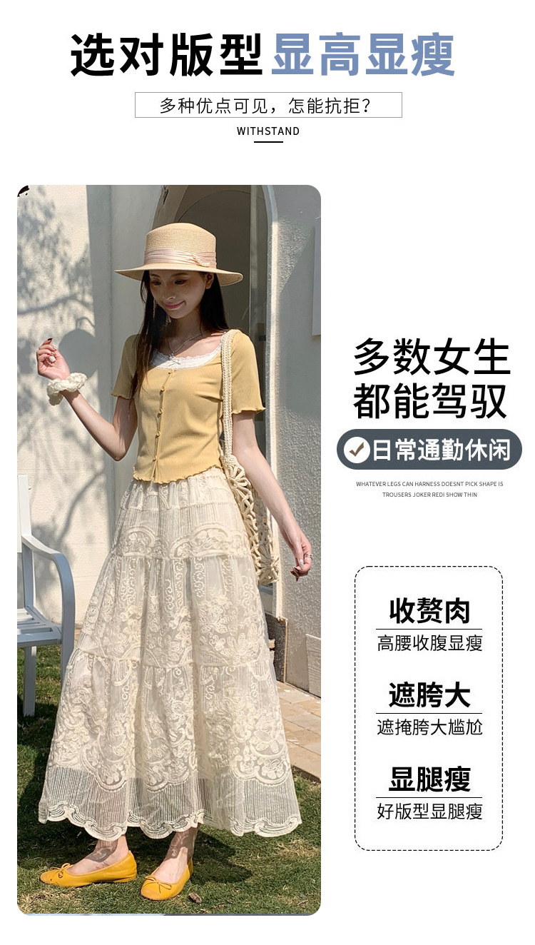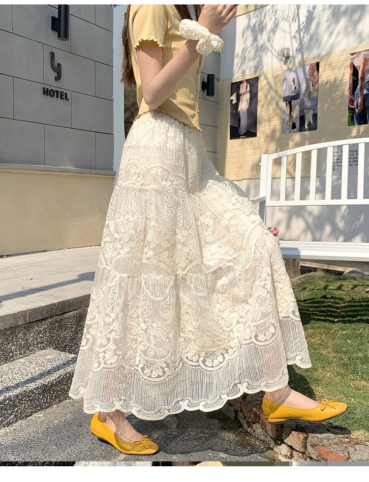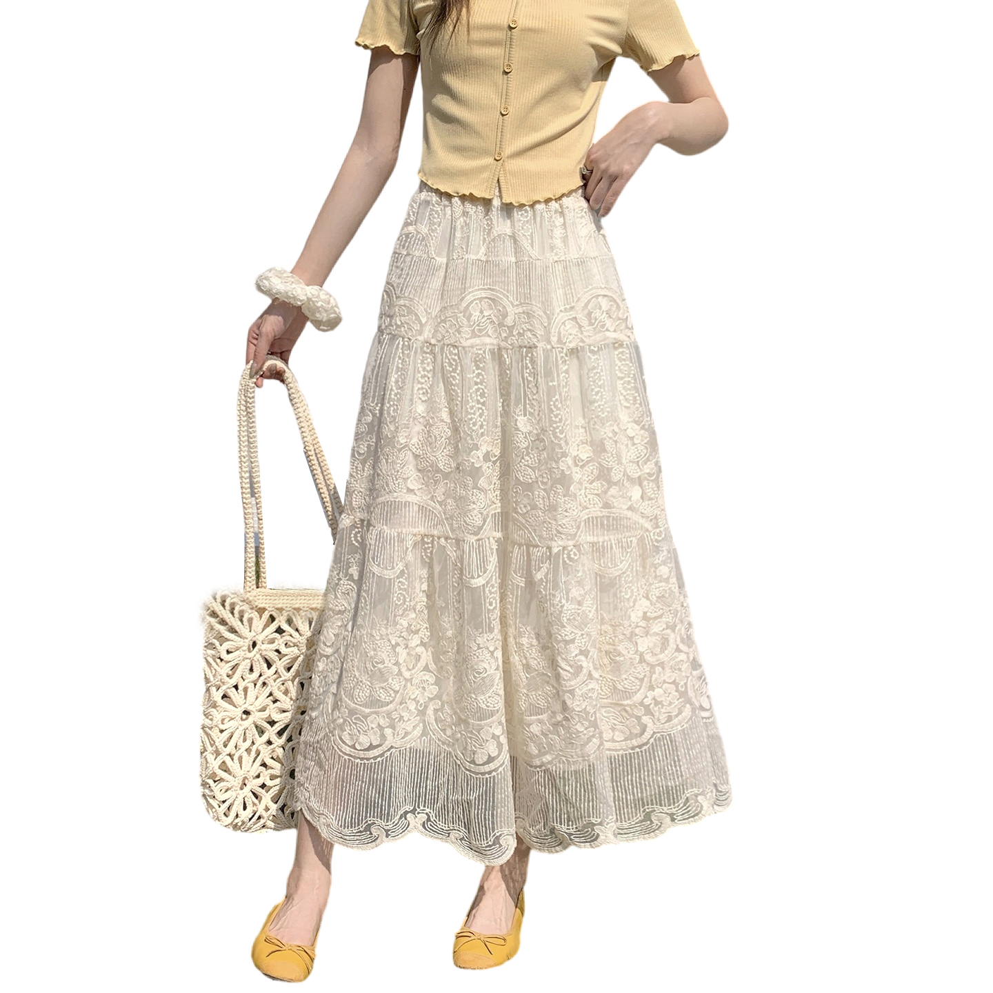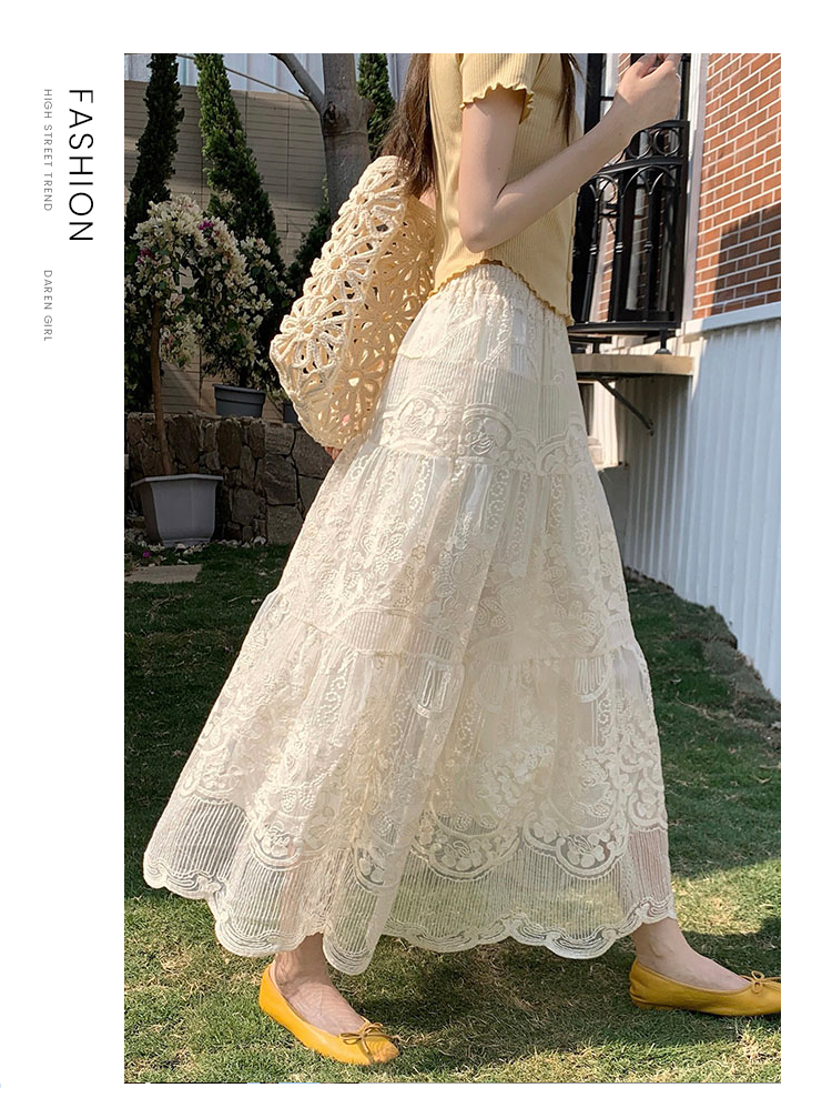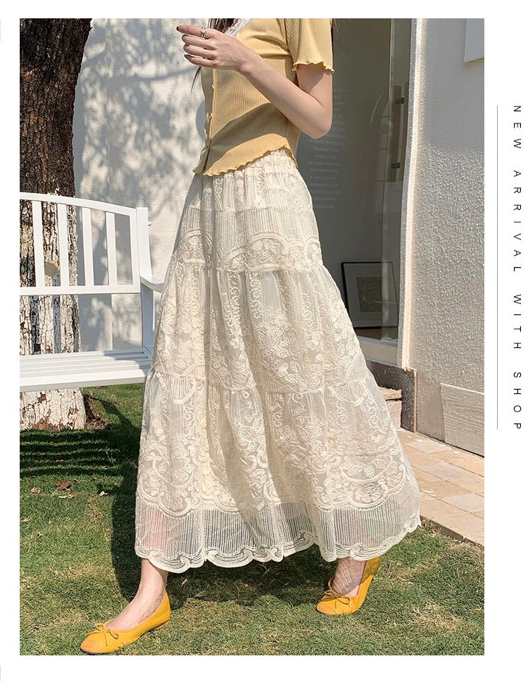 살구 색상 레이스 자수 반신 스커트 여성 봄 새로운 하이웨이스트 표지 넓적 다리 슬림해 보이는 중간 길이 A라인 스커트 퍼프 스커트