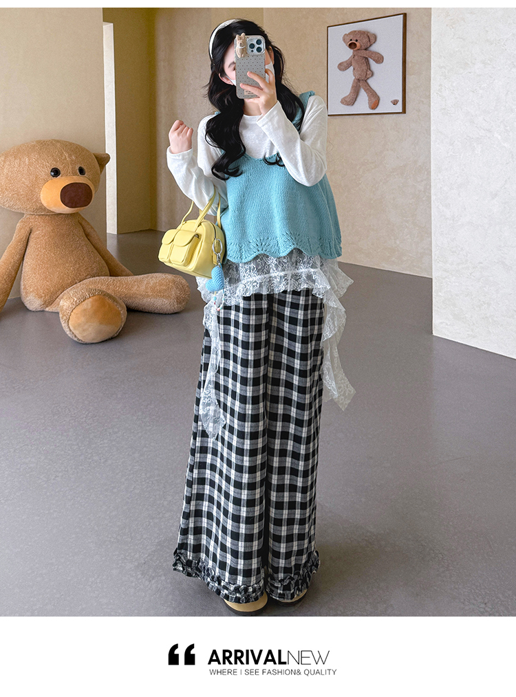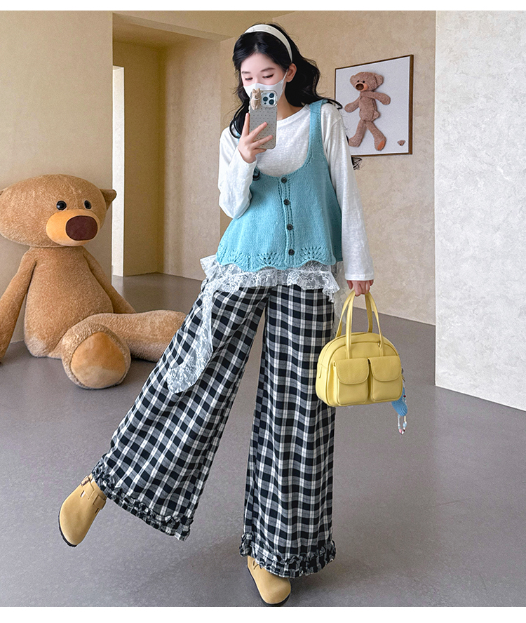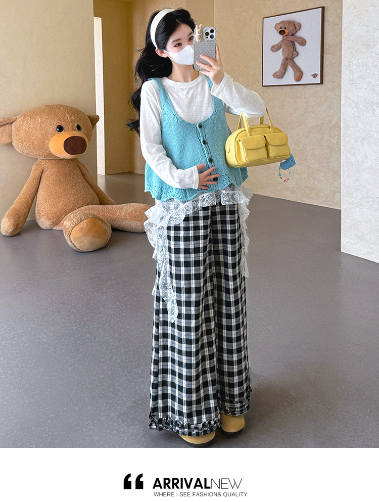 실사 xian 물품 봄 한국 스타일 패치워크 레이스 맨위 홀로우 아웃 베스트 와이드 레그 팬츠 돼지 코 버클 3종 세트