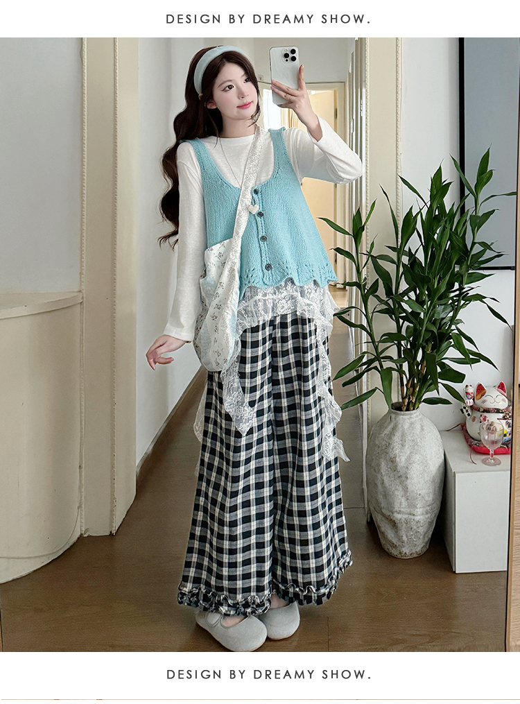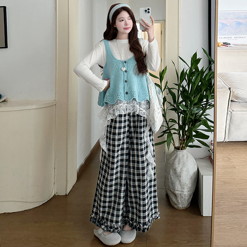 실사 xian 물품 봄 한국 스타일 패치워크 레이스 맨위 홀로우 아웃 베스트 와이드 레그 팬츠 돼지 코 버클 3종 세트