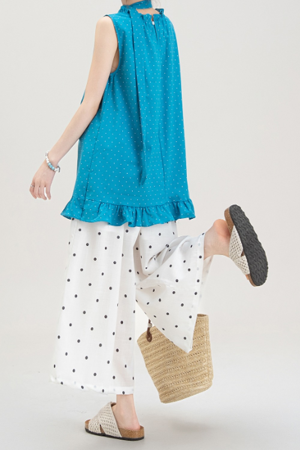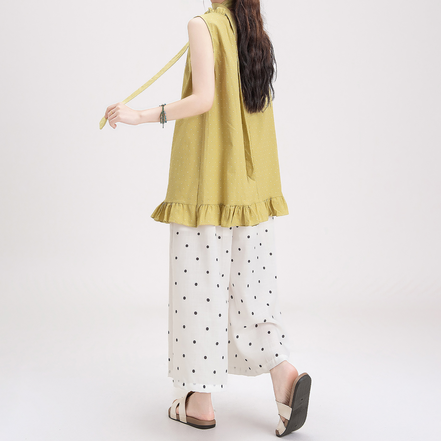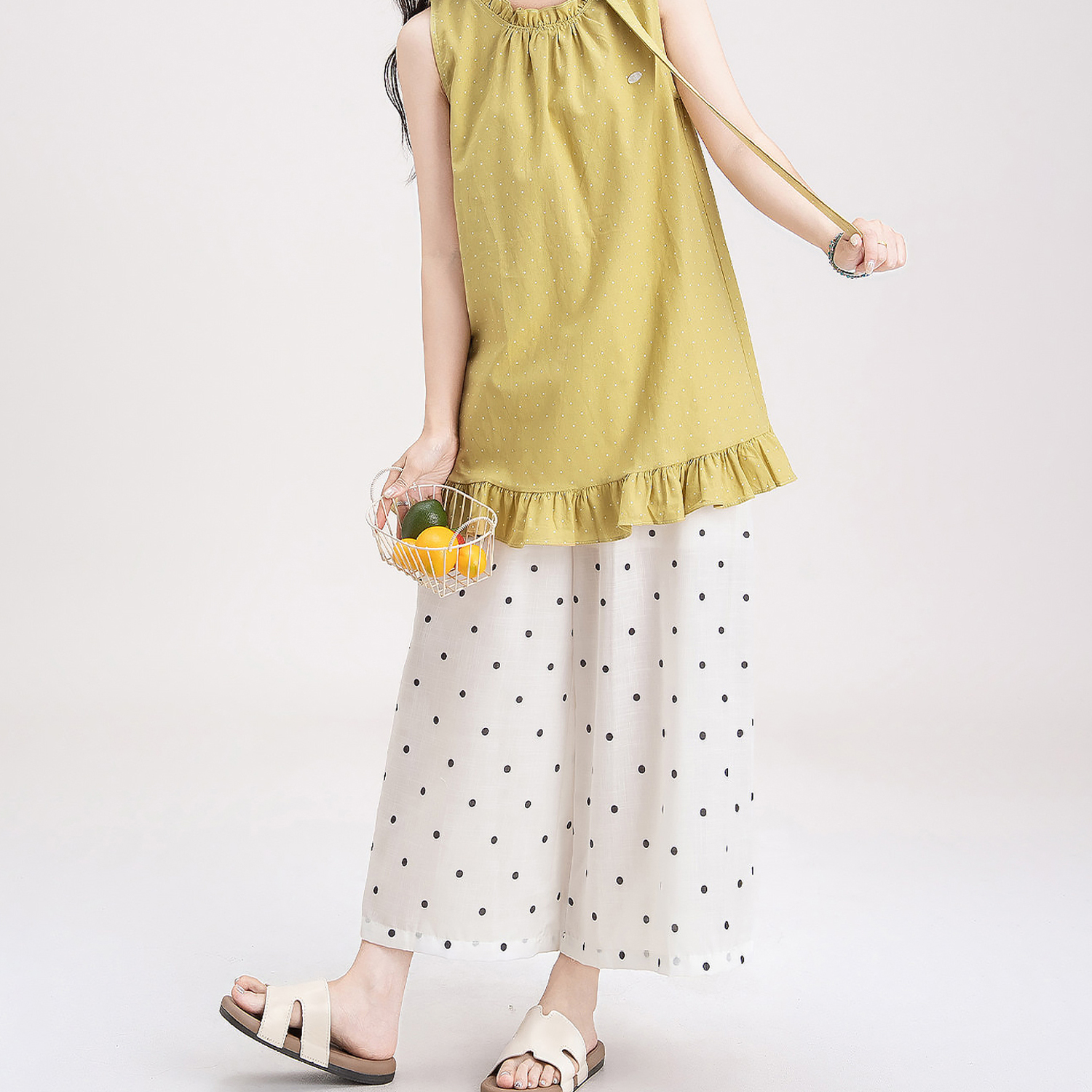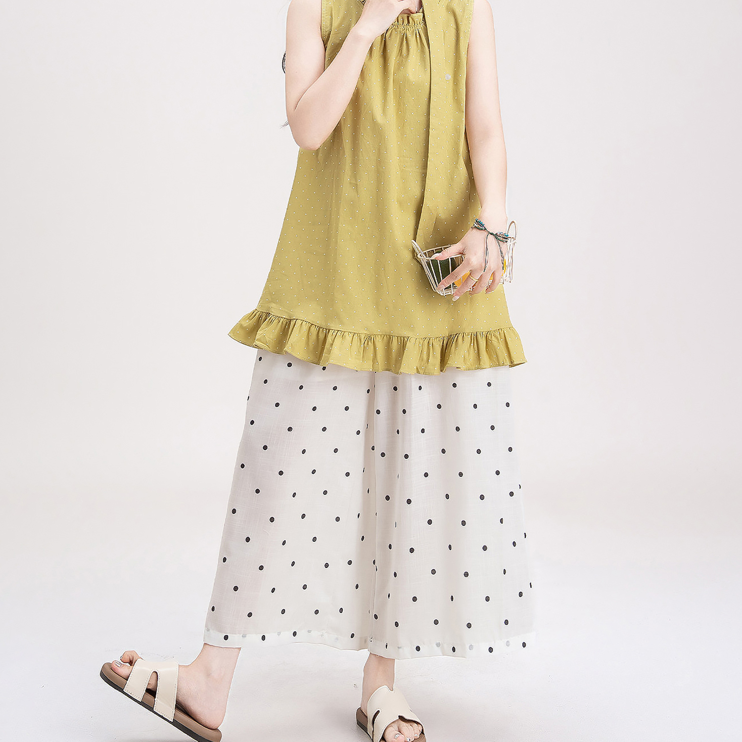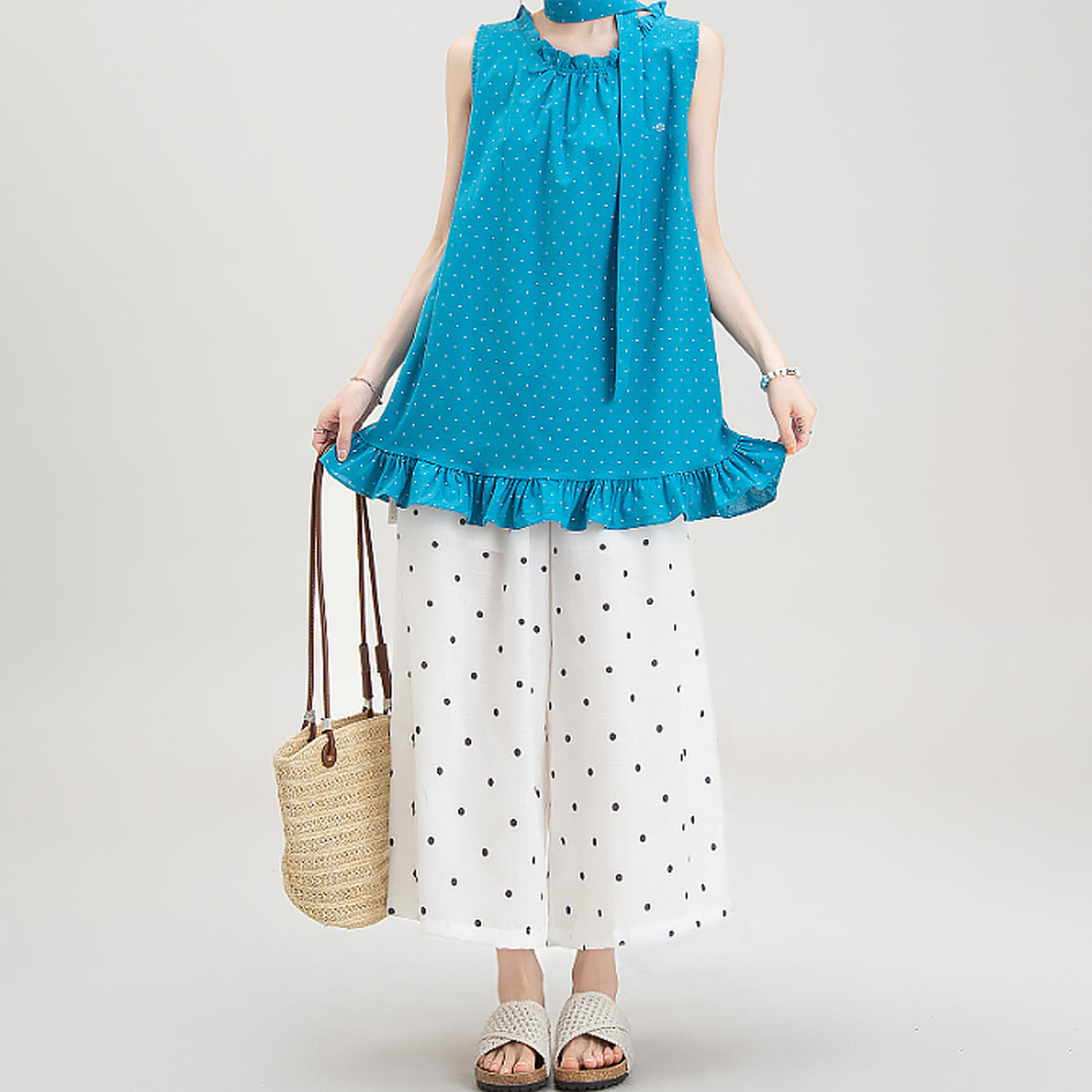 목이버섯 레이스 민소매 도트 무늬 조끼 여성 여름 새로운 작은 키 루즈핏 넓은 다리 8 점 바지 여성복 여성