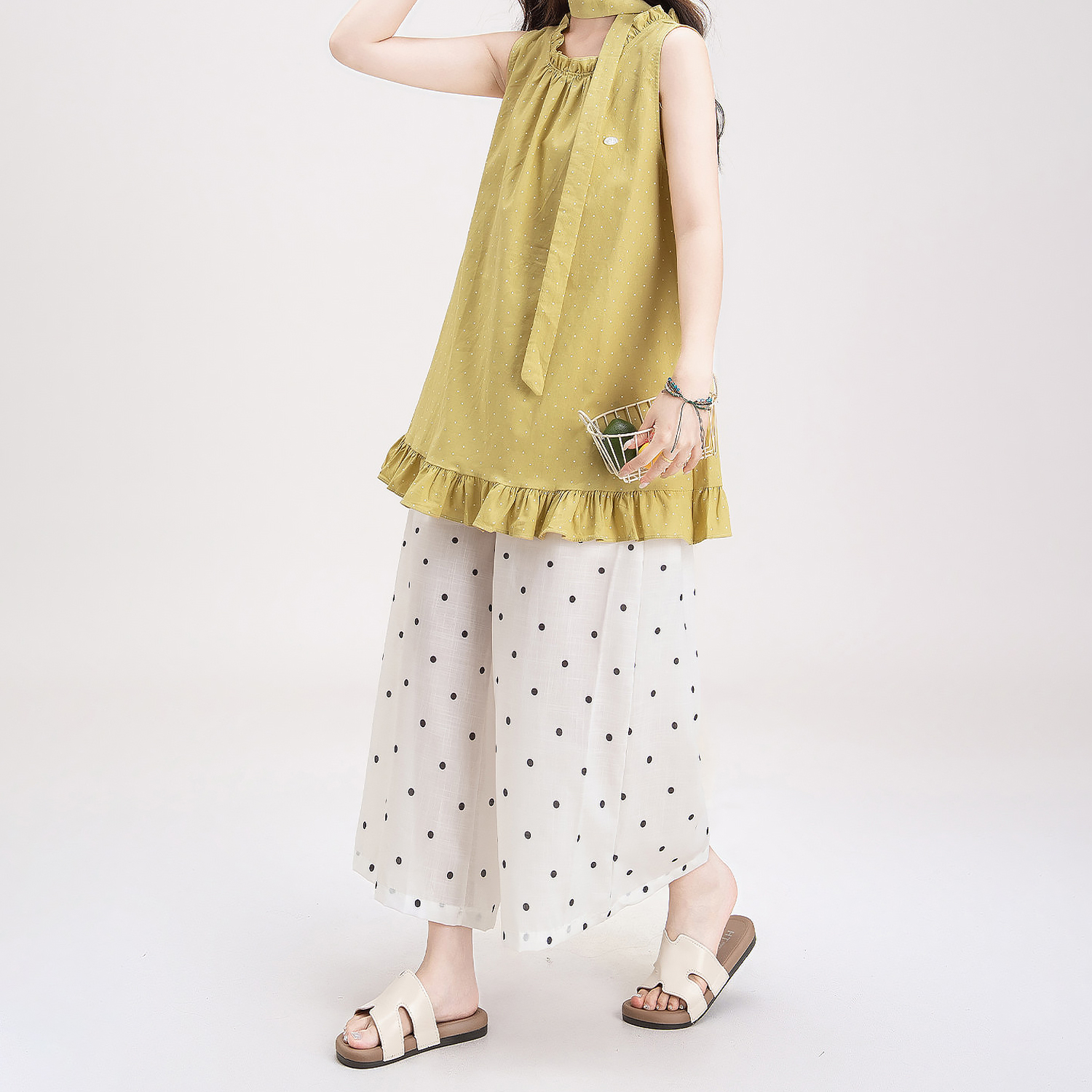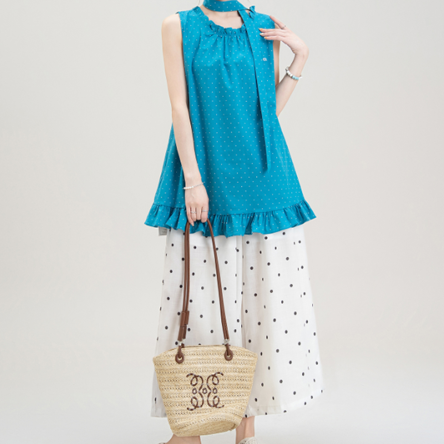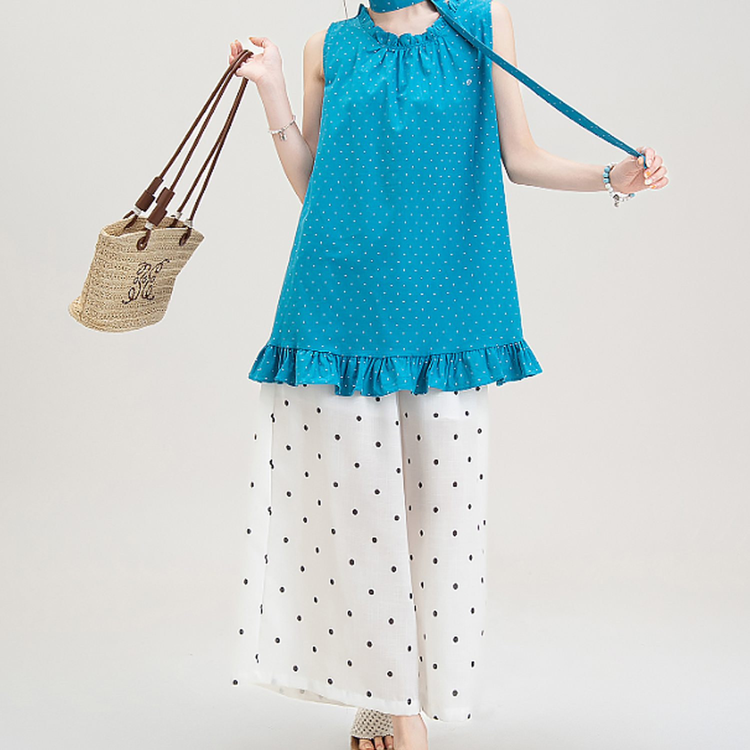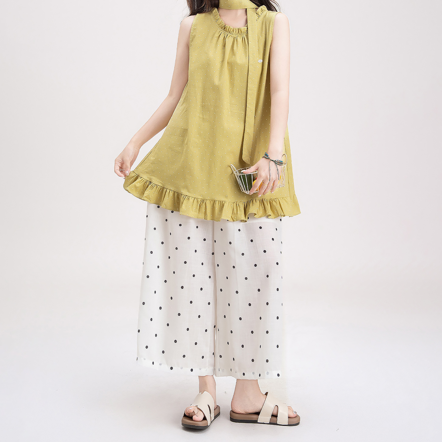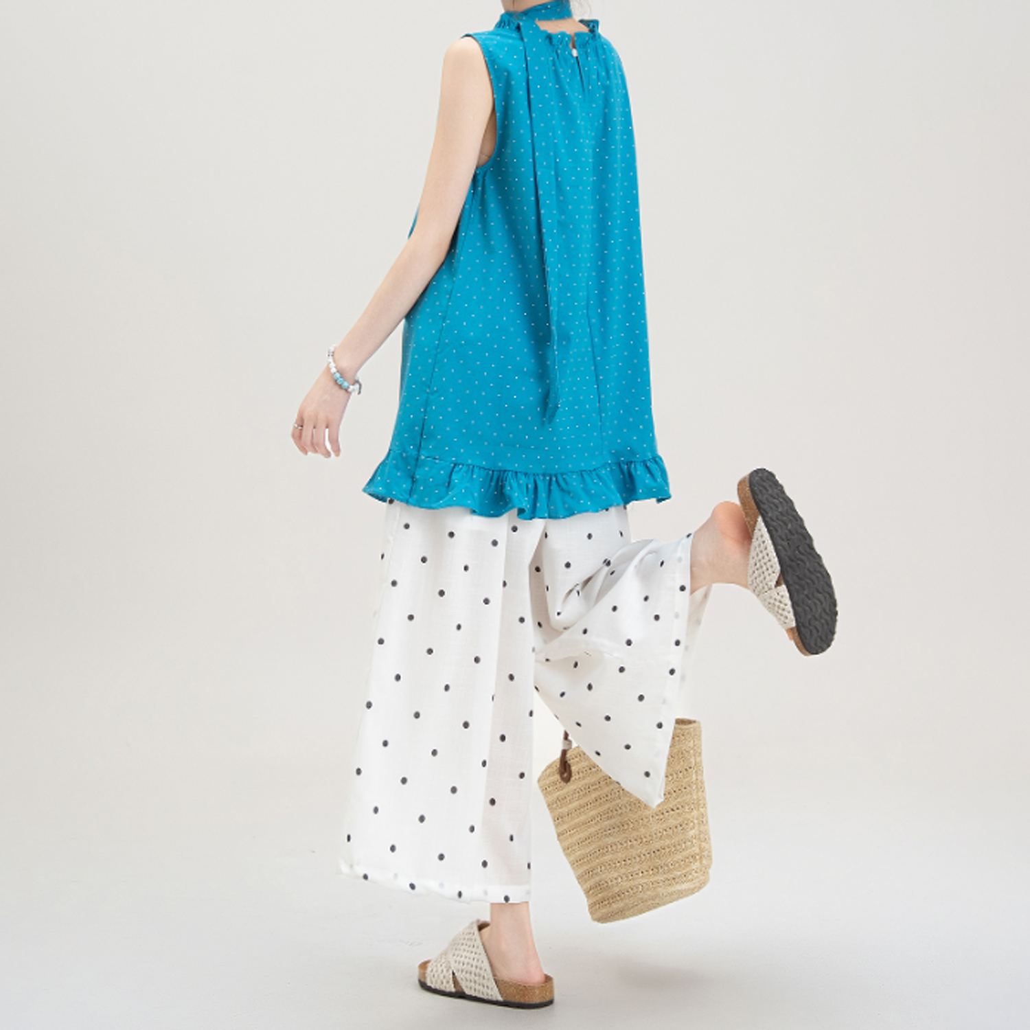 목이버섯 레이스 민소매 도트 무늬 조끼 여성 여름 새로운 작은 키 루즈핏 넓은 다리 8 점 바지 여성복 여성