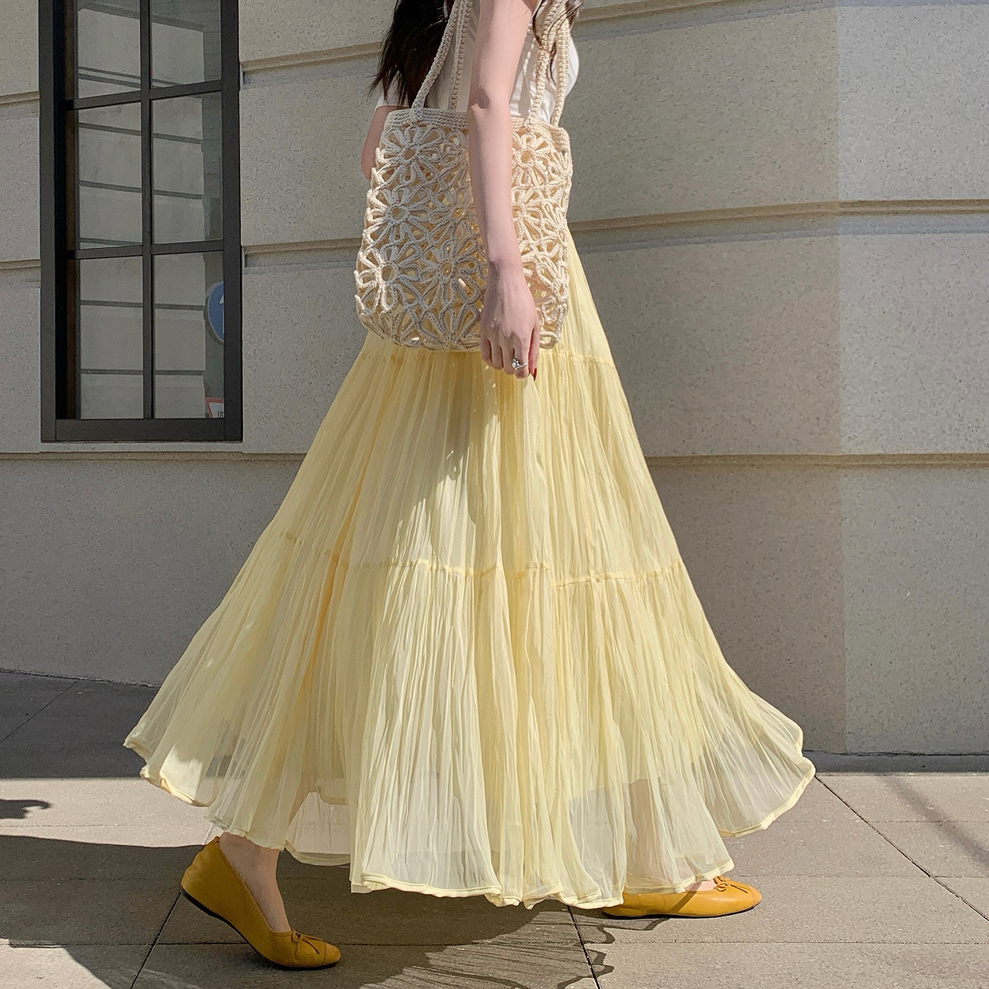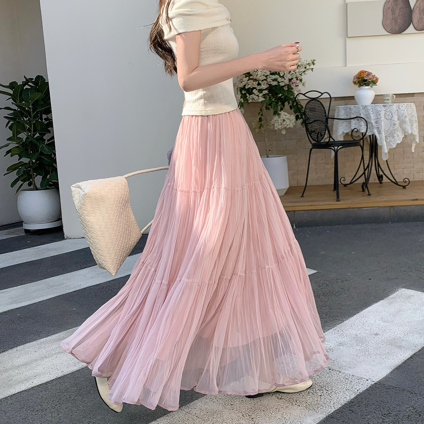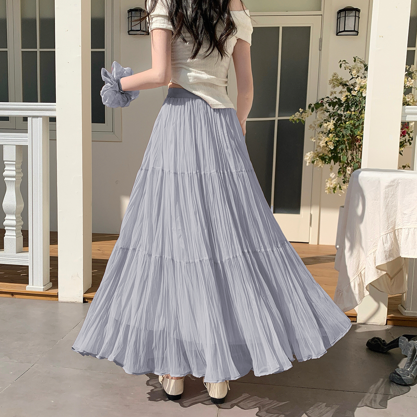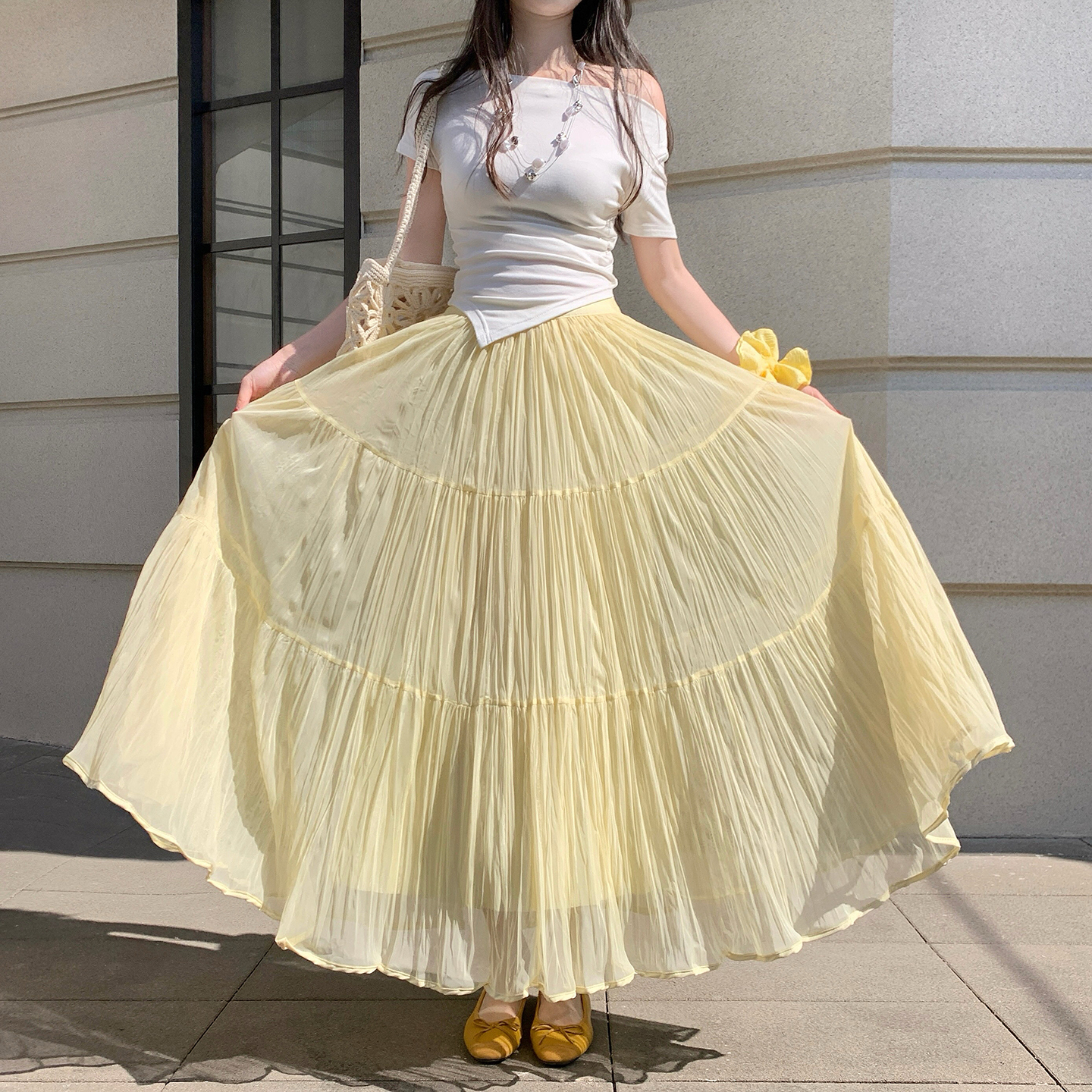 빛 럭셔리 도루 가을 센스 플리츠 쉬폰 반신 스커트 여성 여름 큰 진자 하이웨이스트 슬림해 보이는 한 마디 표지 넓적 다리 플리츠 롱 스커트