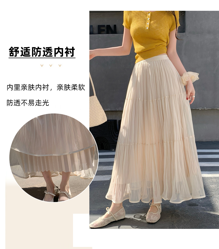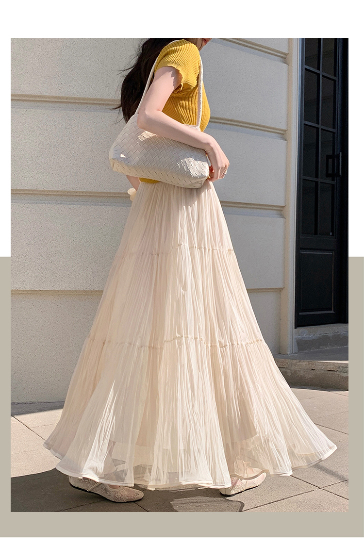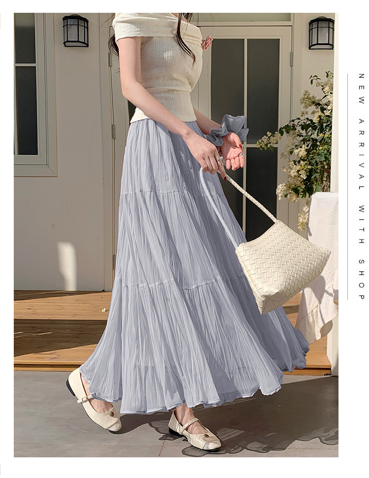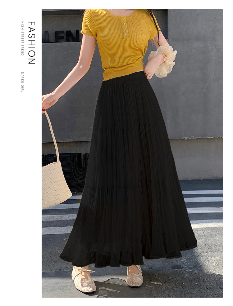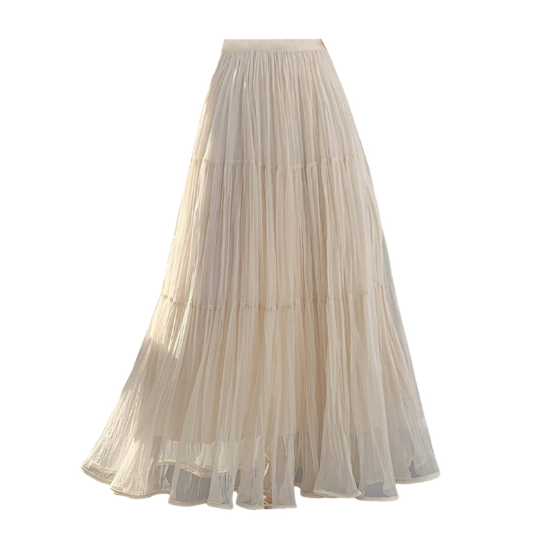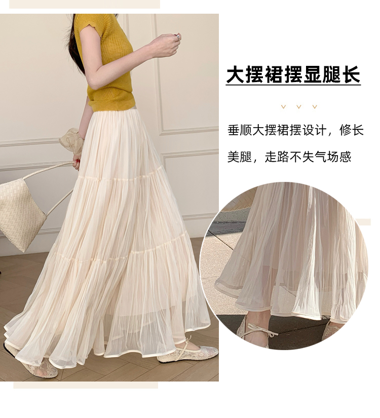 슈퍼 요정 망사 한 마디 플리츠 롱 스커트 여성 2026 봄 여름 새로운 휴가 바람 슬림해 보이는 표지 십자가 단색 반신 스커트